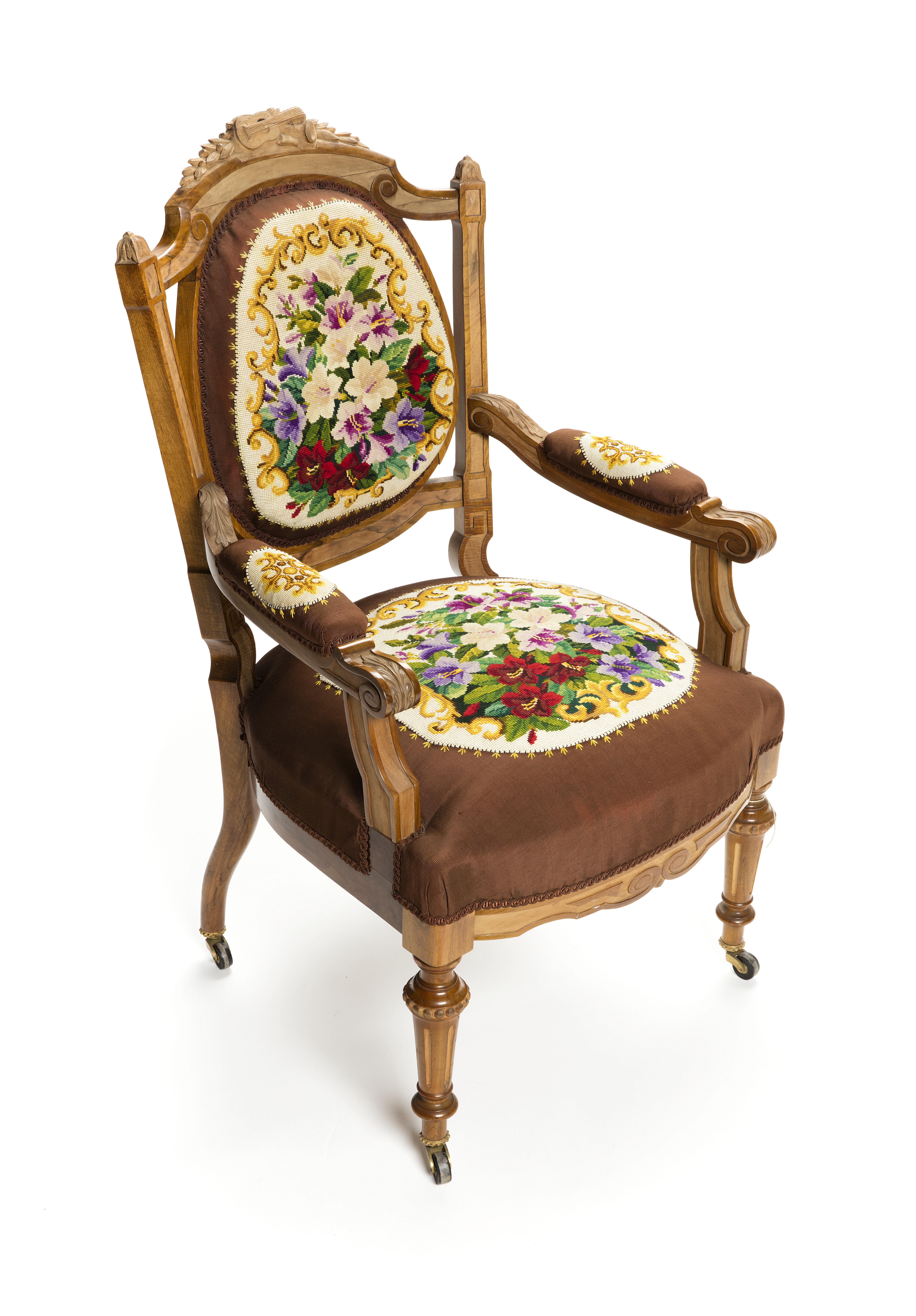 LÄNSTOL, ny-Louis XVI. Av valnöt och med broderad klädsel. Inköpt från möbelhandlaren I D Heymann i Hamburg oktober 1873, tillsammans med flera andra delar. Broderierna utförda av Wilhelmina von Hallwyl, åren 1870-1873. Utgör del av möbeluppsats VI:II:A.a.30. bestående av bord, hylla, notportfölj med fotställ, hörnskåp med nyckel, soffa, två länstolar, åtta stolar, en avlång puff, två runda puffar, en trymå, två undergardiner med fyra hållare, två lufter övergardiner med två kappor, fyra broderade bårder, två ovala broderier jämte en lös frans, fyra gardinhållare, fyra gardinrosetter, två kornischer, två gardinbrädor, ett spjällsnöre, en matta samt överblivet garn. Möbeluppsatsen har till 1916 stått på Ericslund, Västerljungs socken, Södermanland, därefter i Hushållerskans rum i Hallwylska palatset.