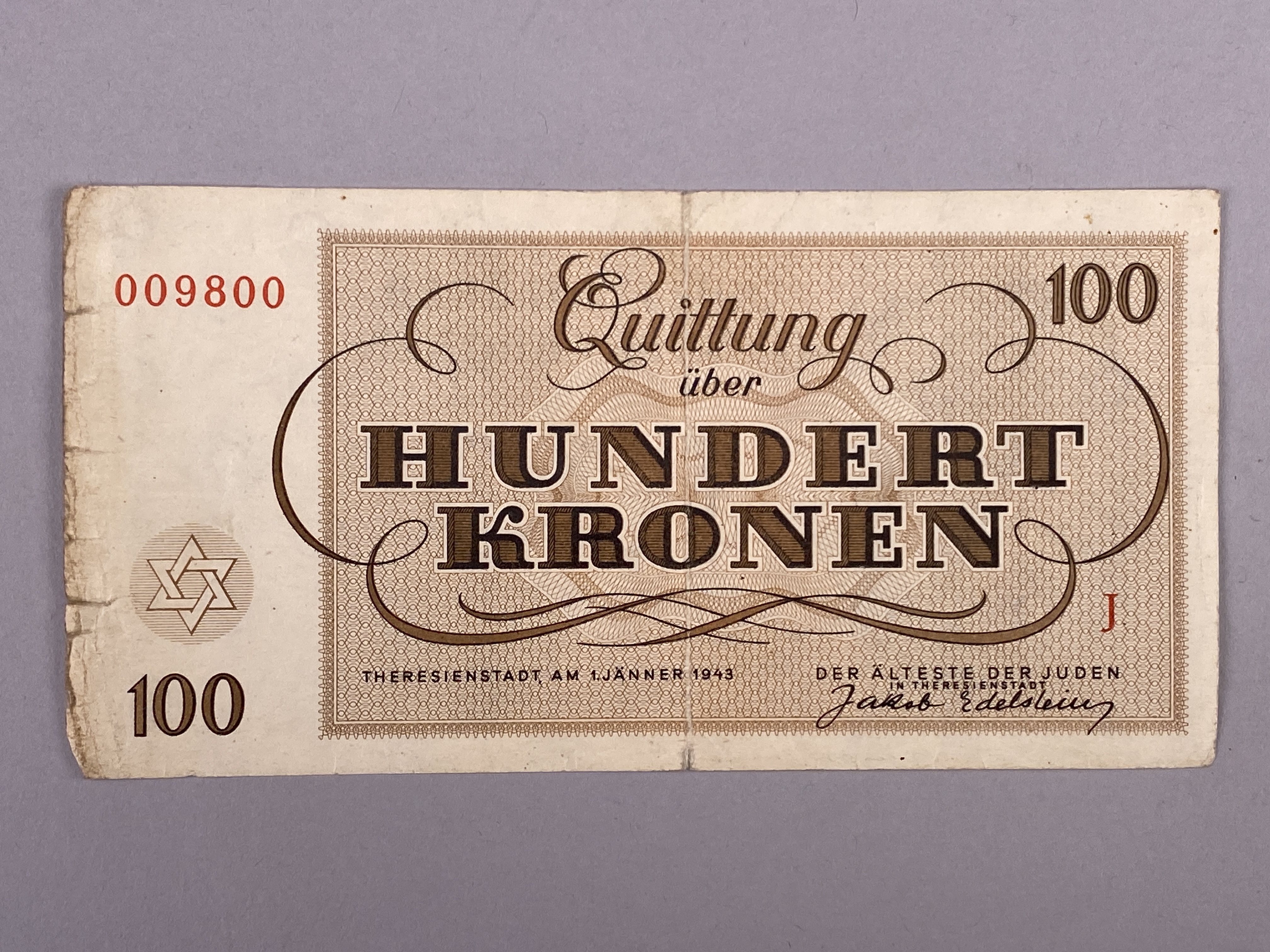 Sedel från Theresienstadt från 1943. Märkt "QUITTUNG ÜBER HUNDERT KRONEN 100" Serienummer 009800