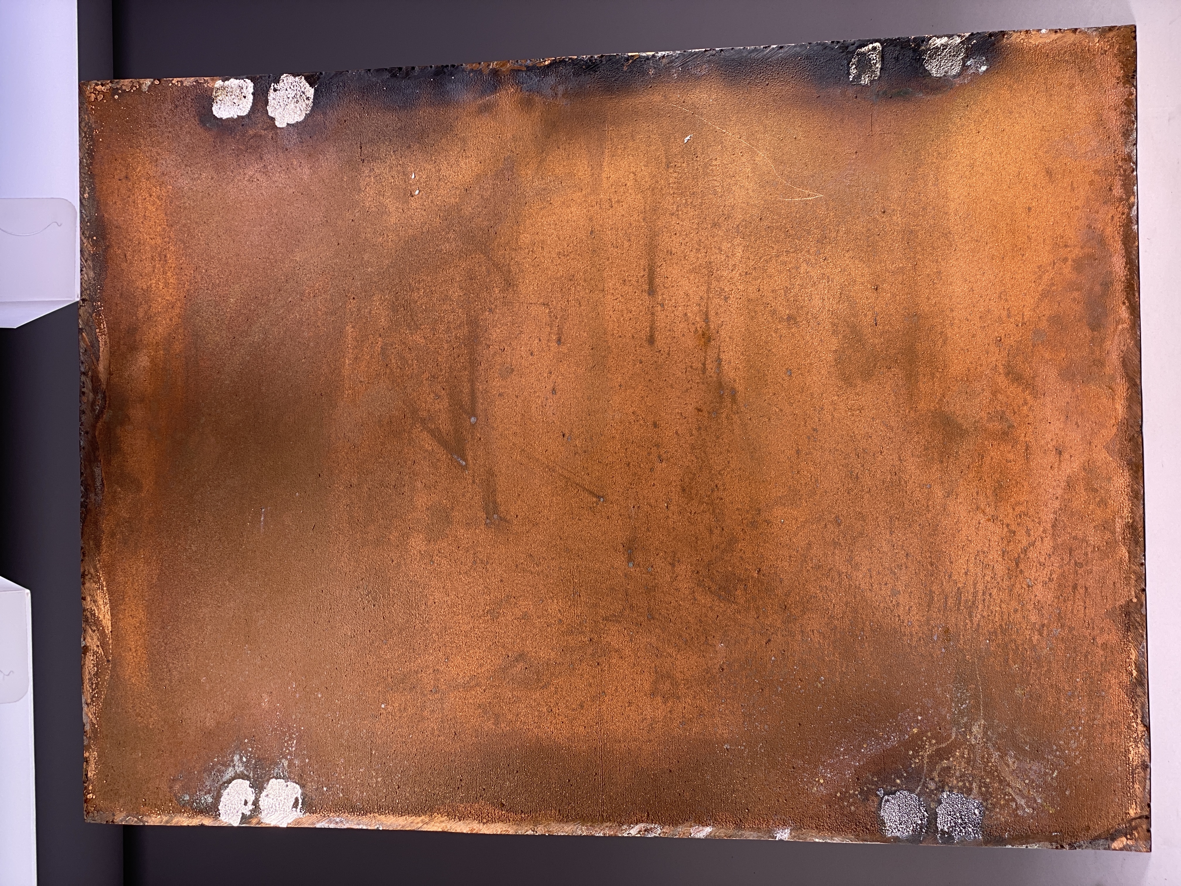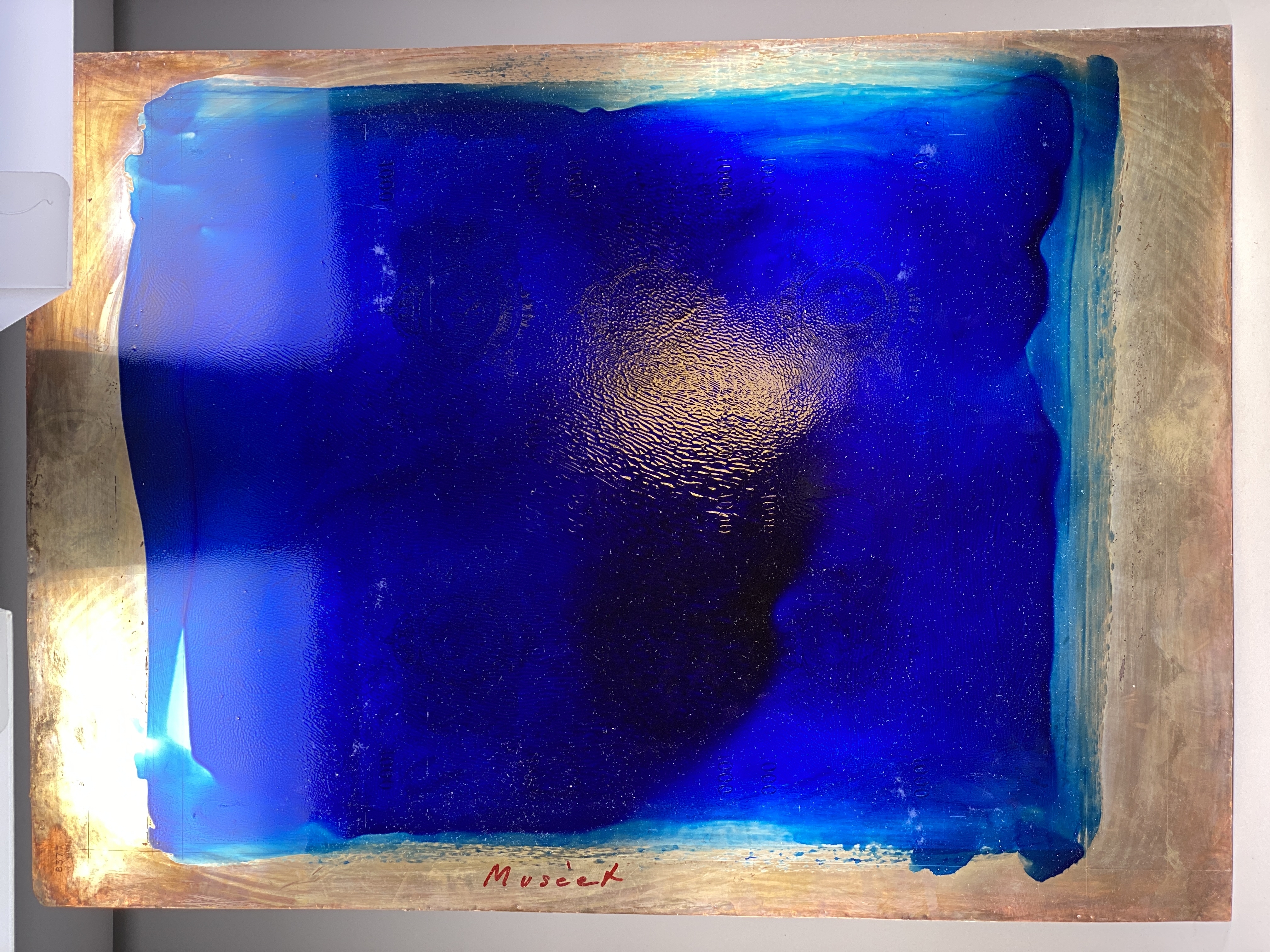 Tryckplåt för tusenkronorssedel. Med tillhörande kuvert. Stor och rektangulär plåt med plats för sex stycken sedeltryck, tillverkad i koppar. Framsidan med gravyr föreställande profilporträtt av Gustav V. Gravyren täckt av blå plastfilm. Plåten stämplad: "8377".