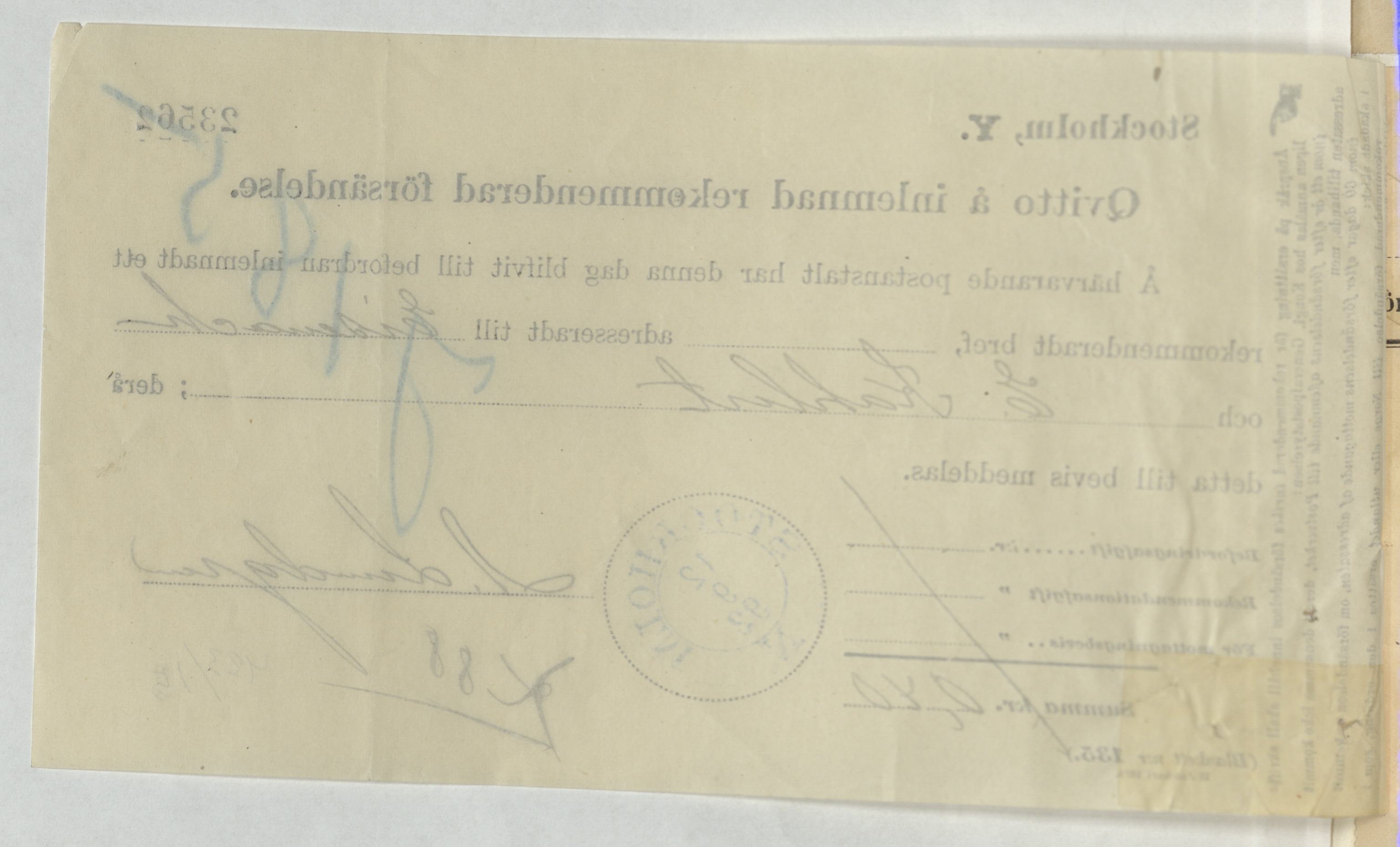Kvitto för inlämnad rekommenderad försändelse gällande E. Kahlert