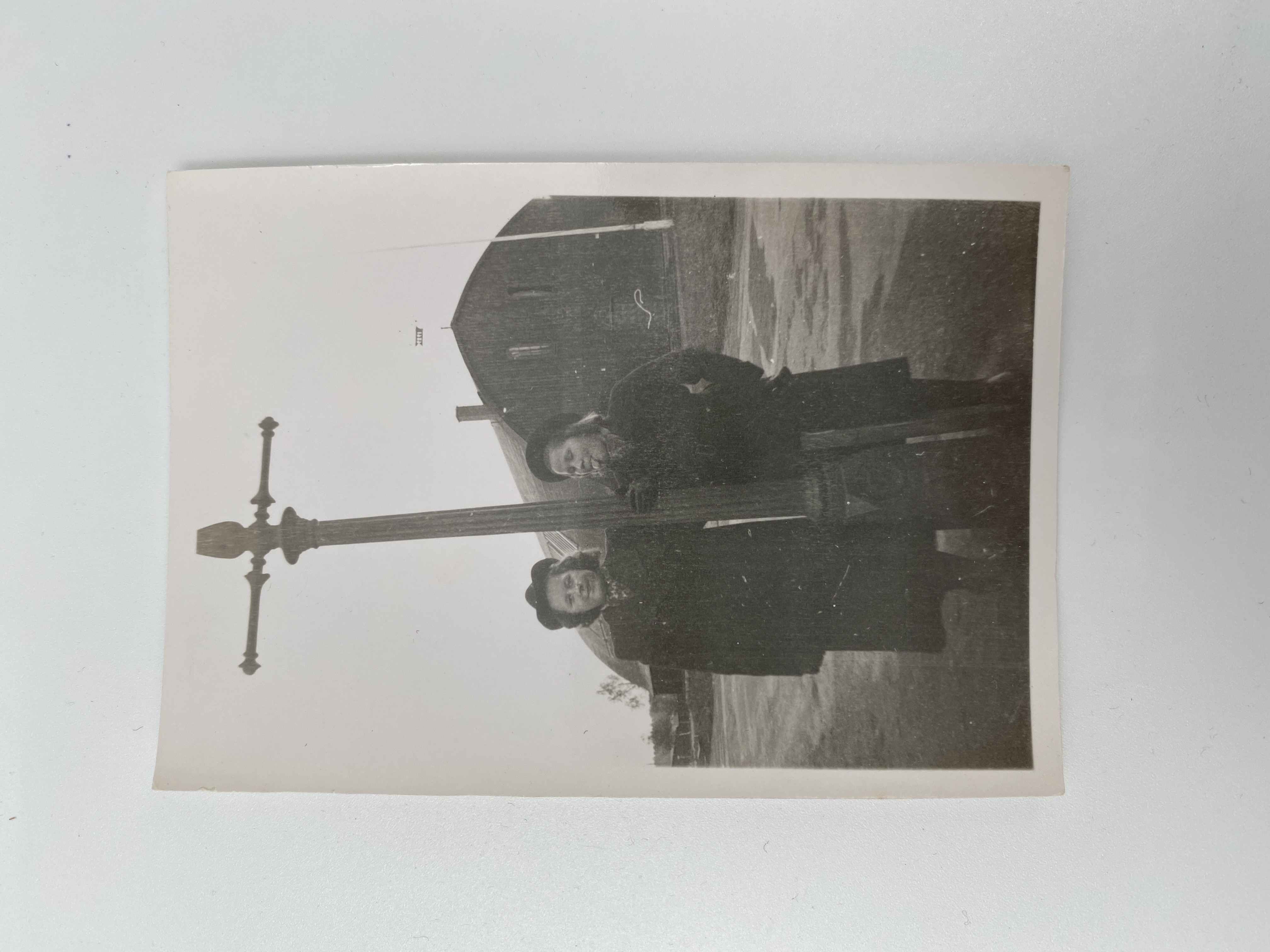 Svartvitt foto av två kvinnor vid en lyktstolpe. Kvinnan till vänster är möjligtvis Lieselotte Haase.