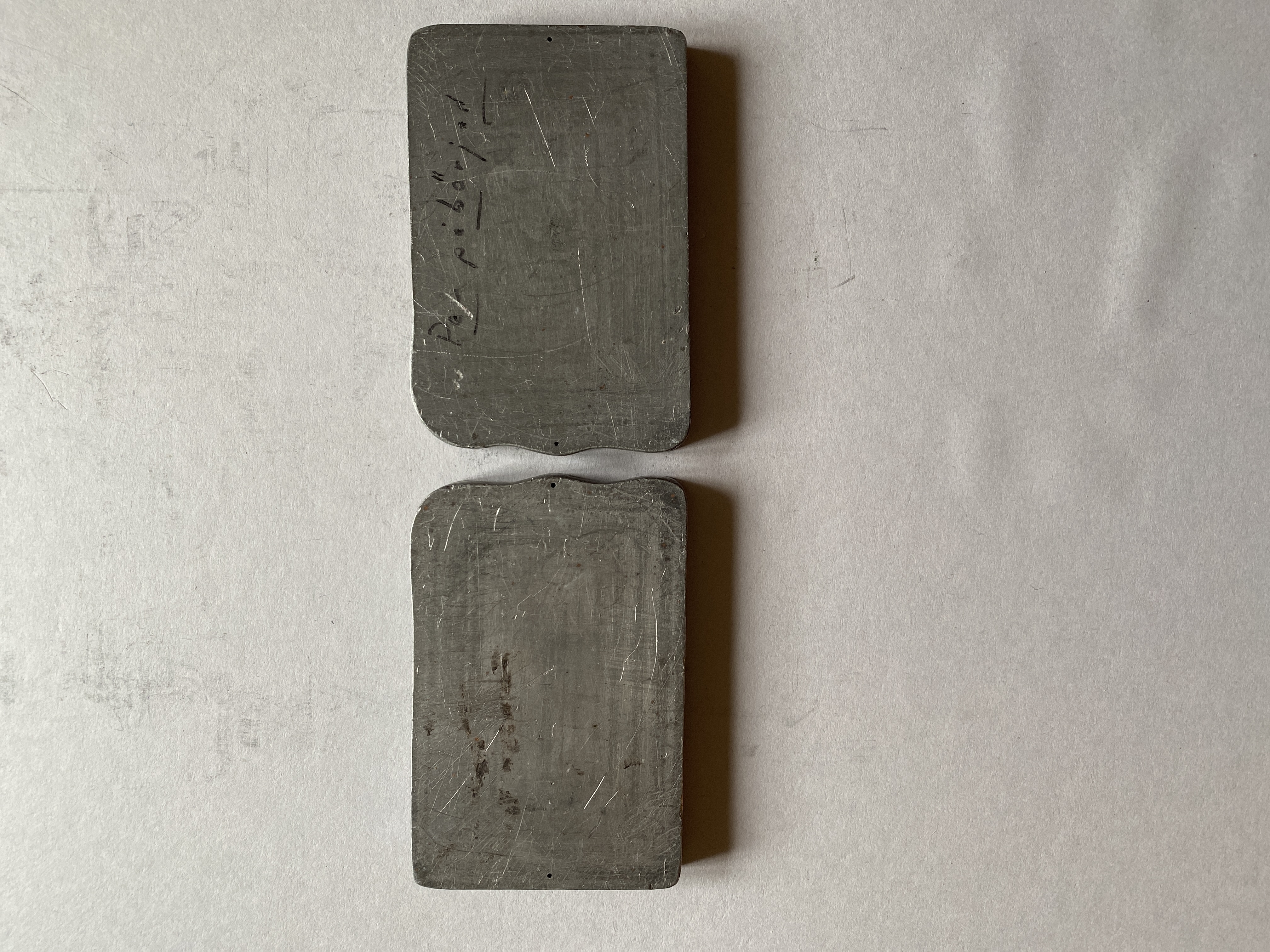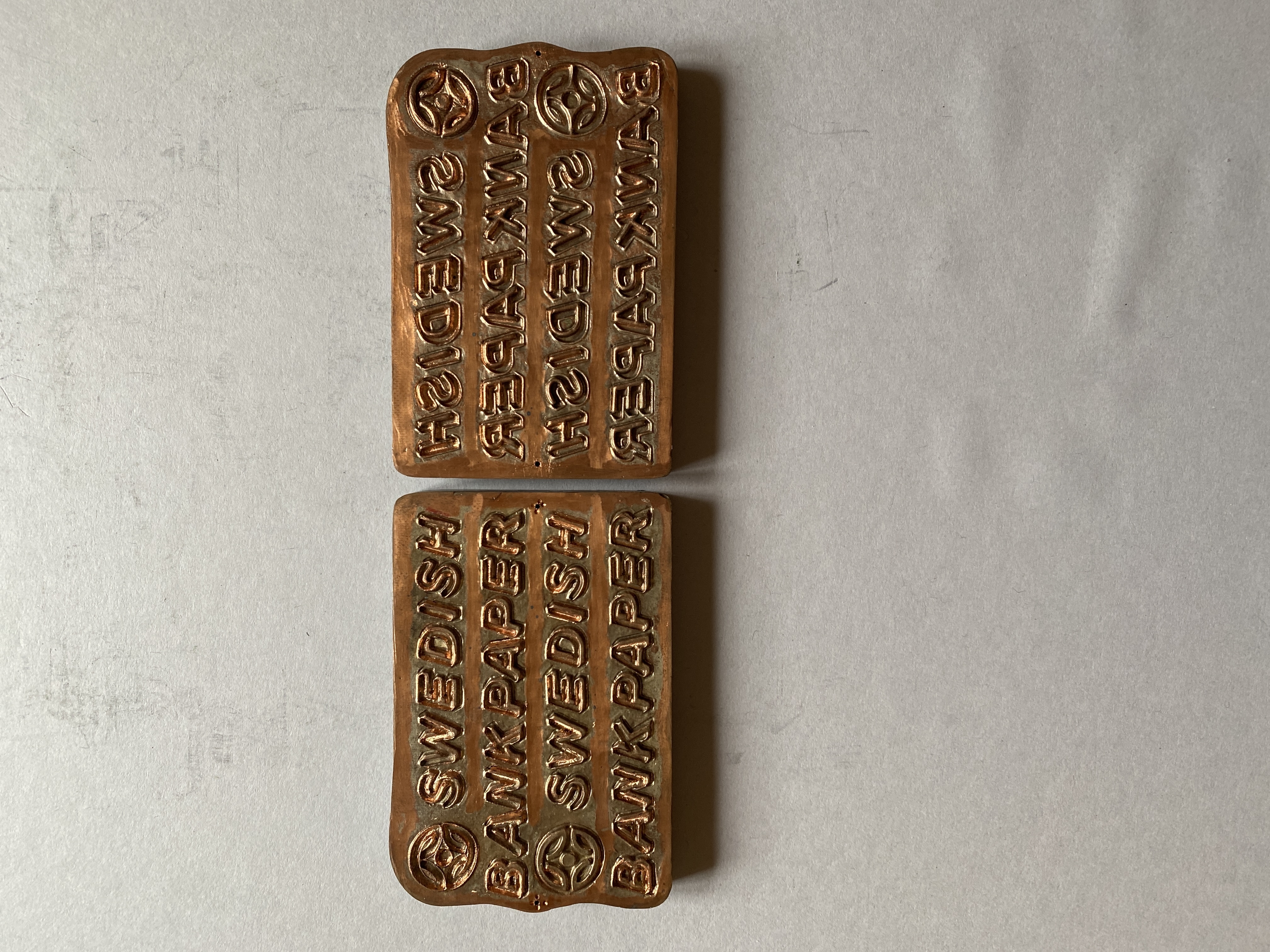 Pressplatta för vattenmärkestillverkning: "SWEDISH BANKPAPPER". Asymmetrisk. 2 stycken. Text på baksidan av plattorna: "Per påbörjat".