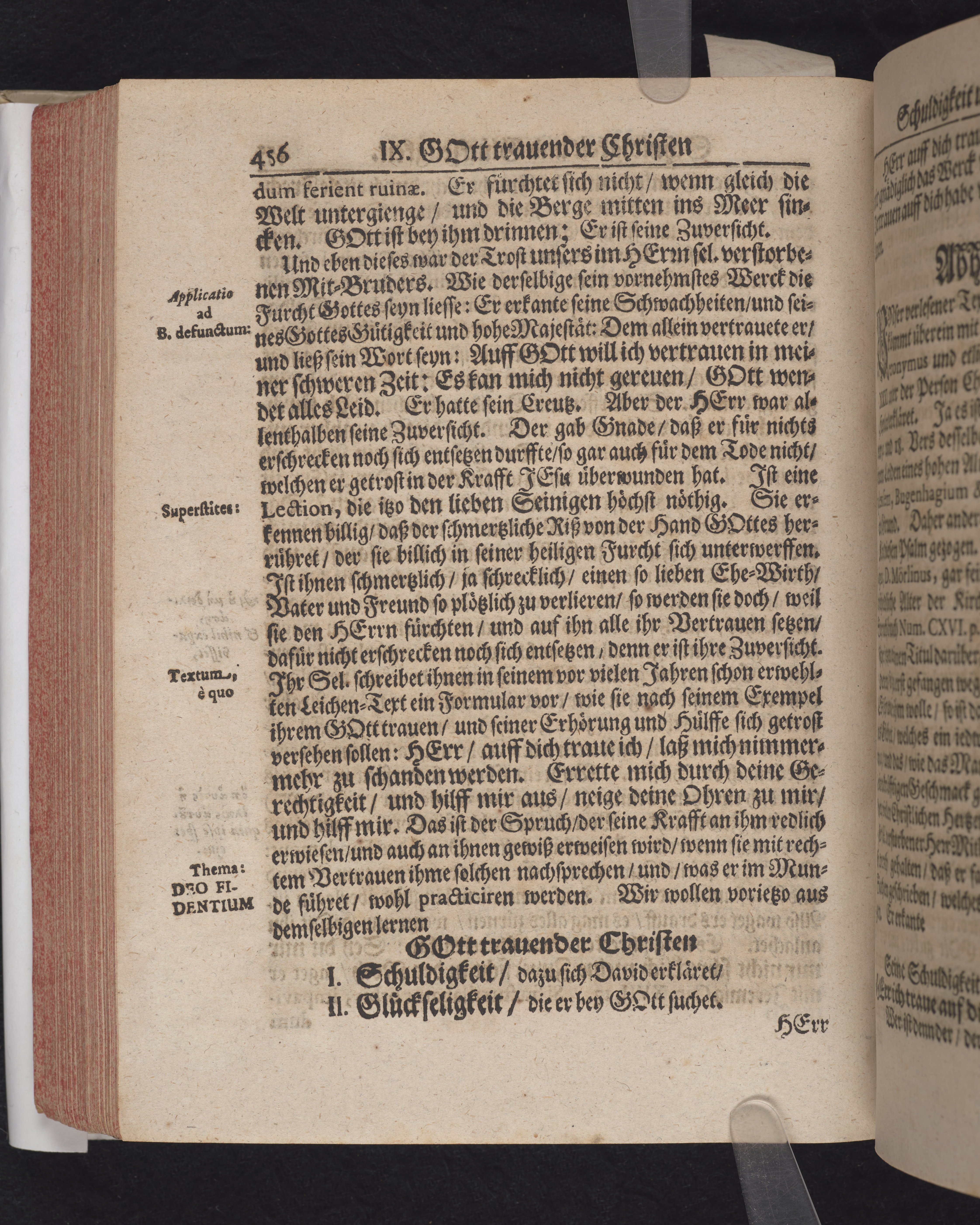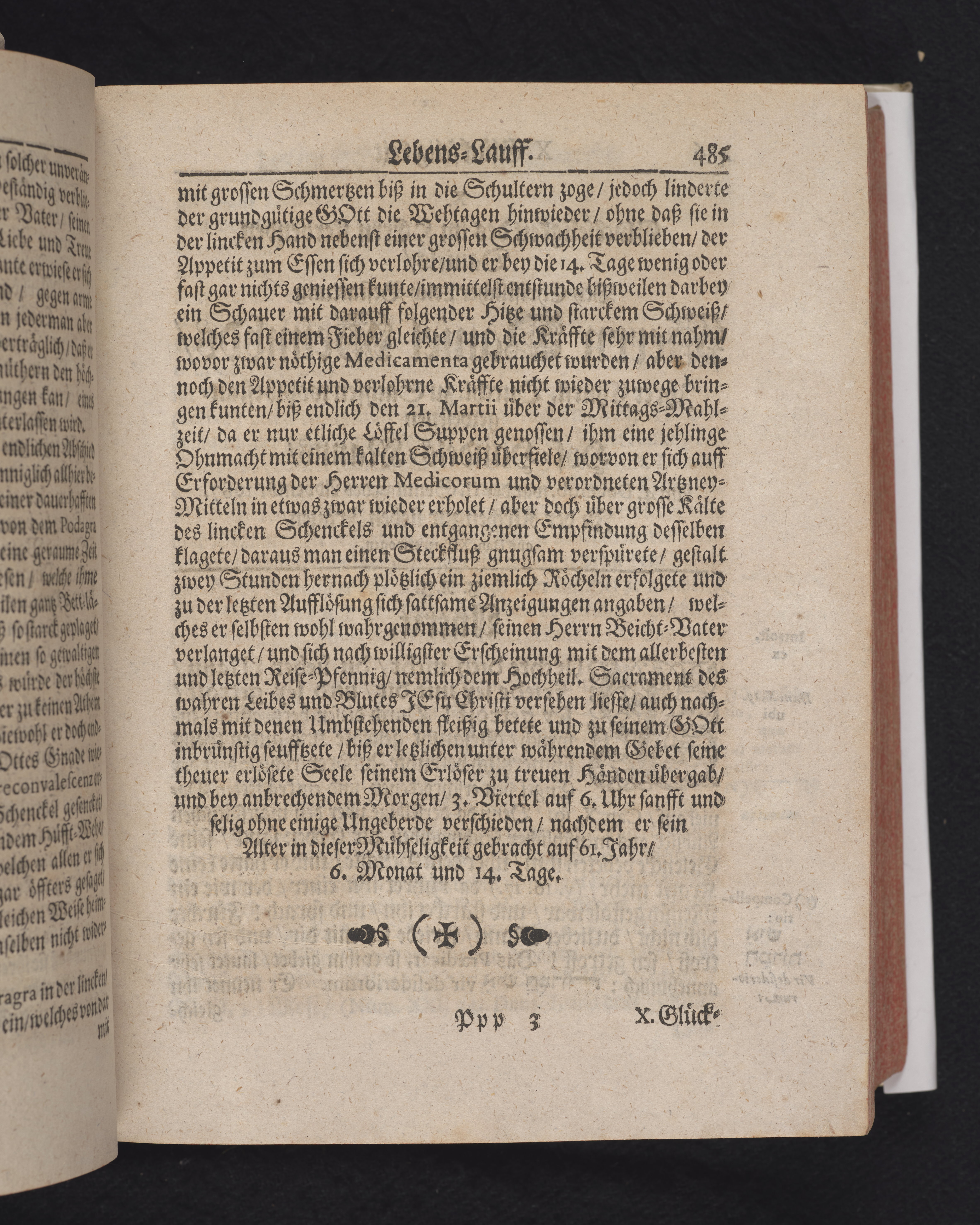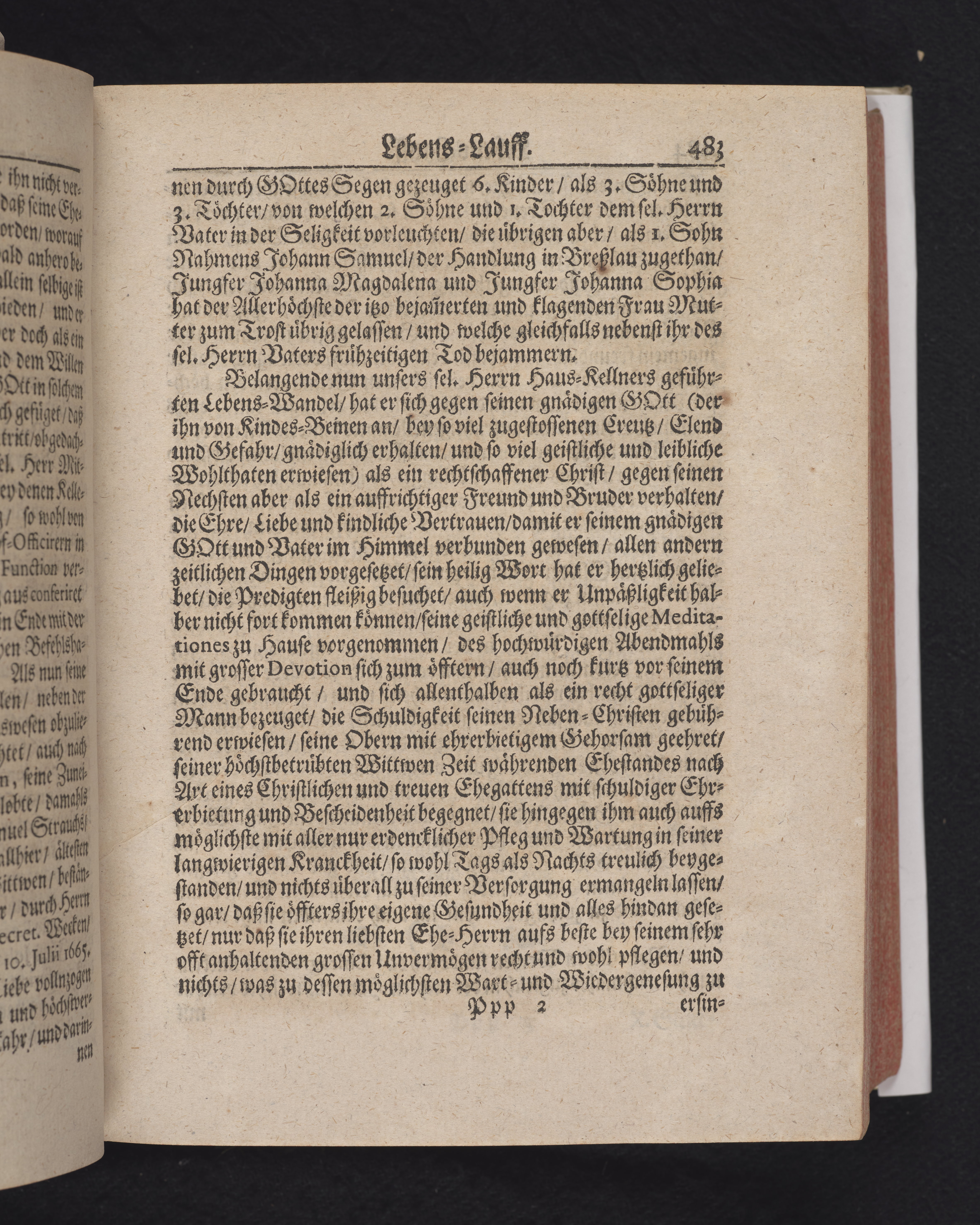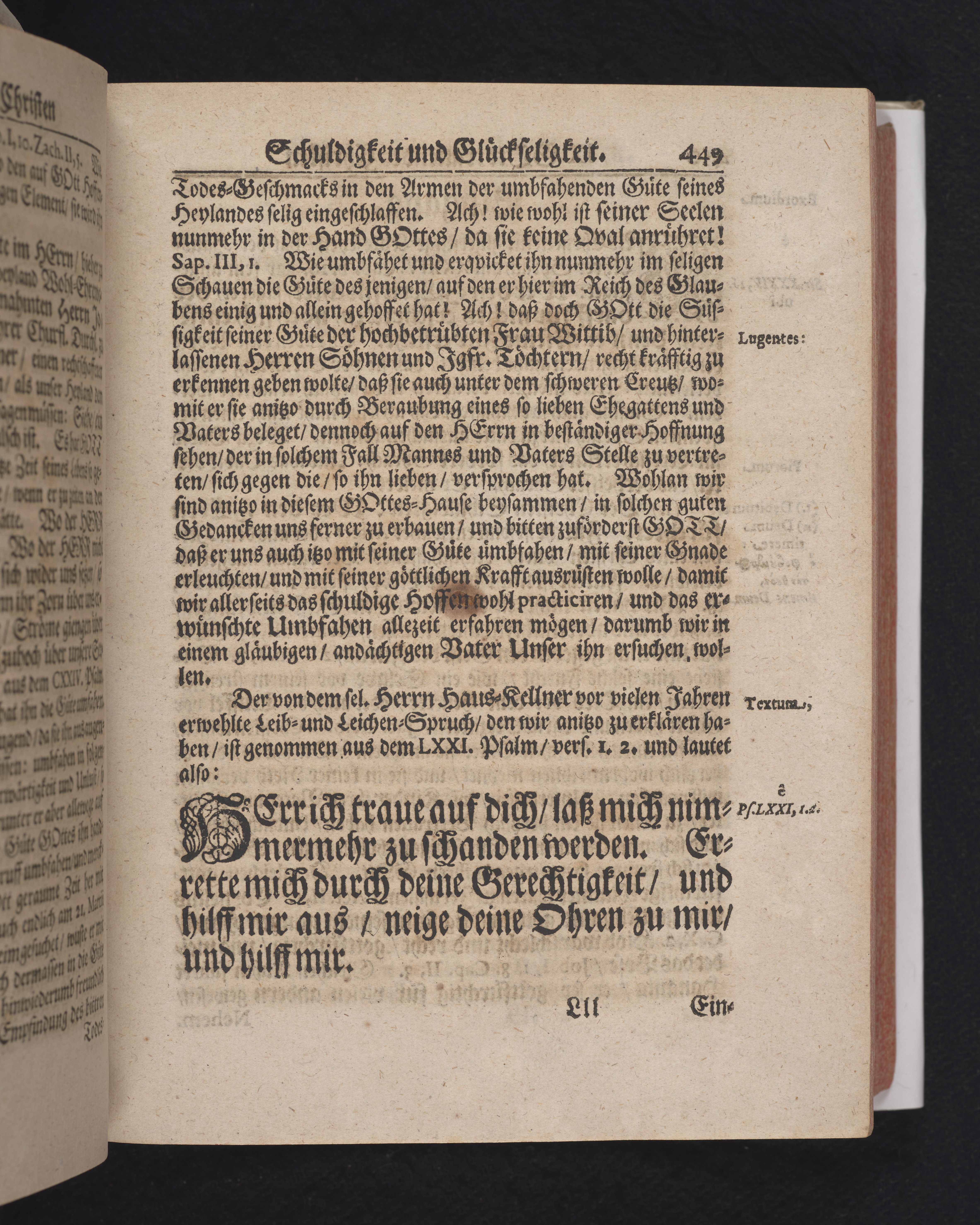 Ingår i en utgiven samling med 28 likpredikningar av Samuel Benedikt Carpzov: Grünende Gebeine, oder Leich-Predigten... Tryckt innehållsförteckning och register. Handskriven innehållsförteckning över de 28 likpredikningarna med bläck på främre försättsbladet (recto och verso).