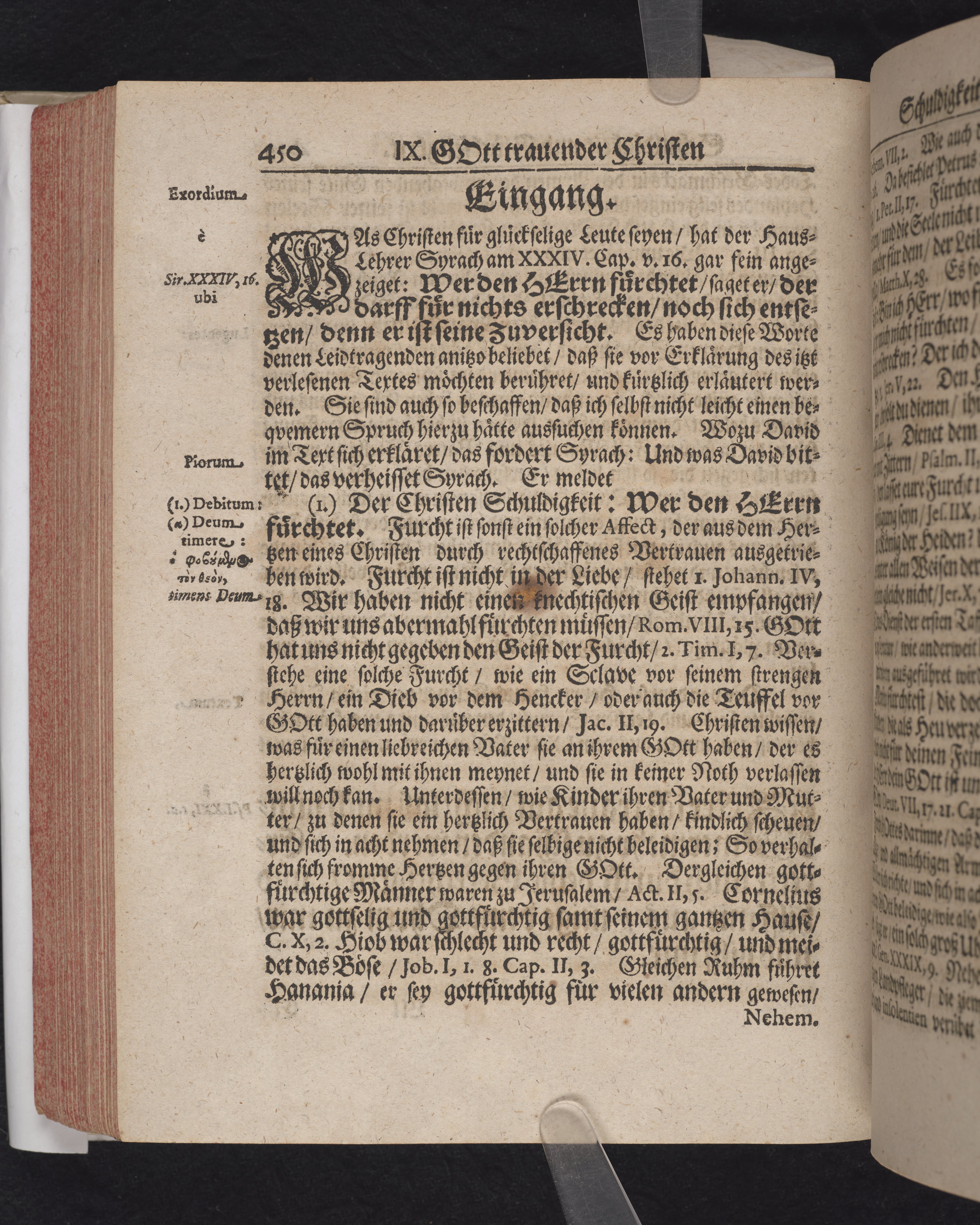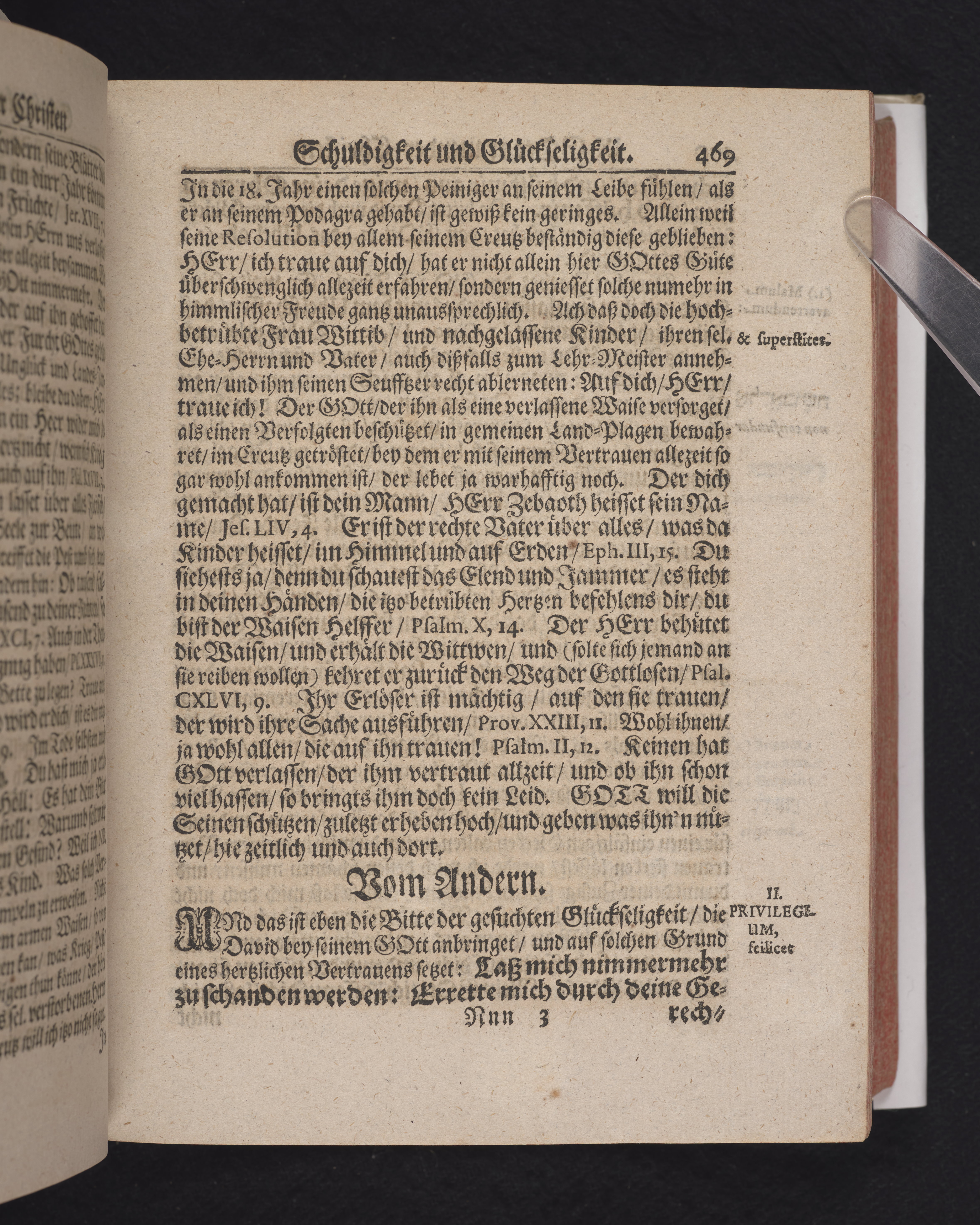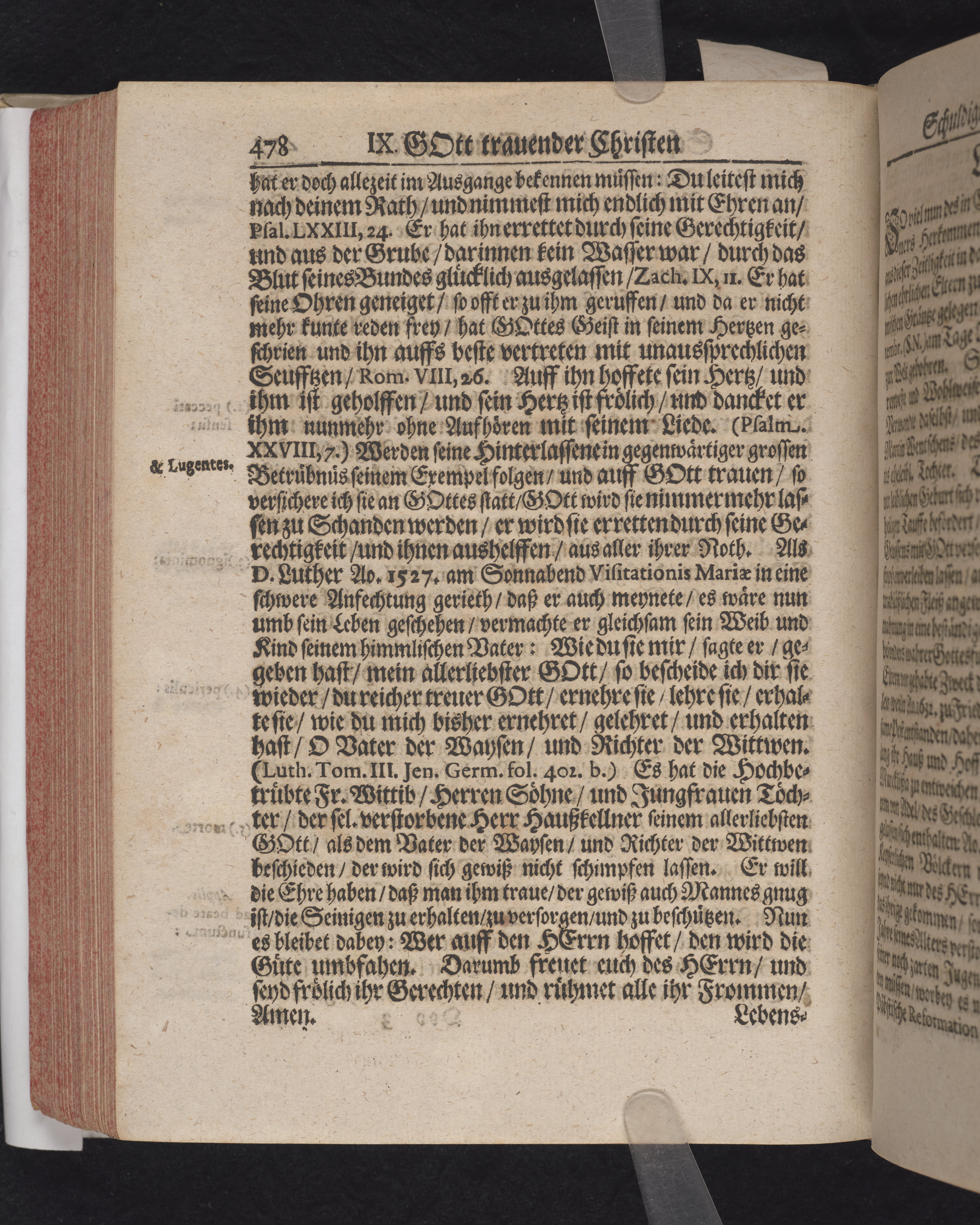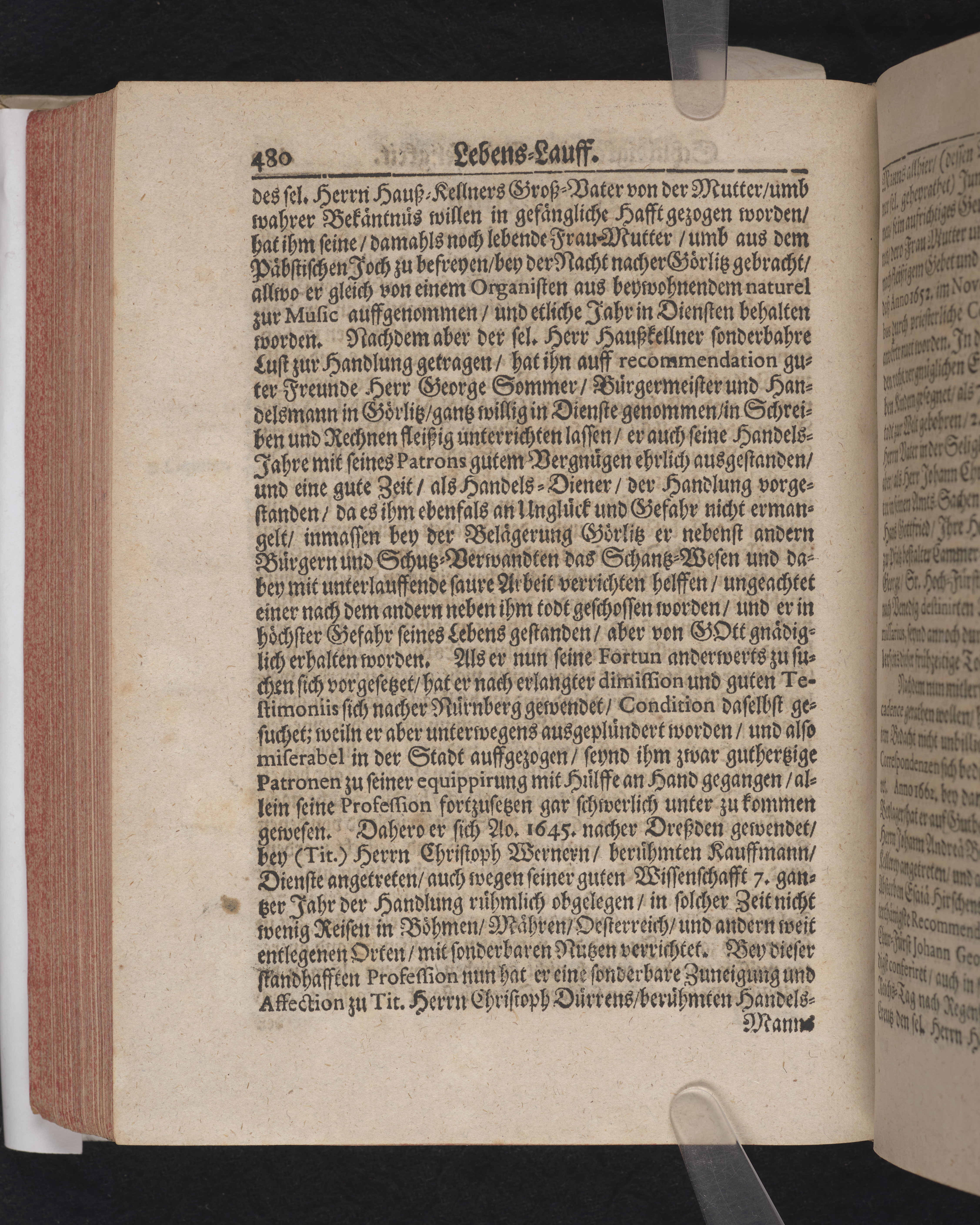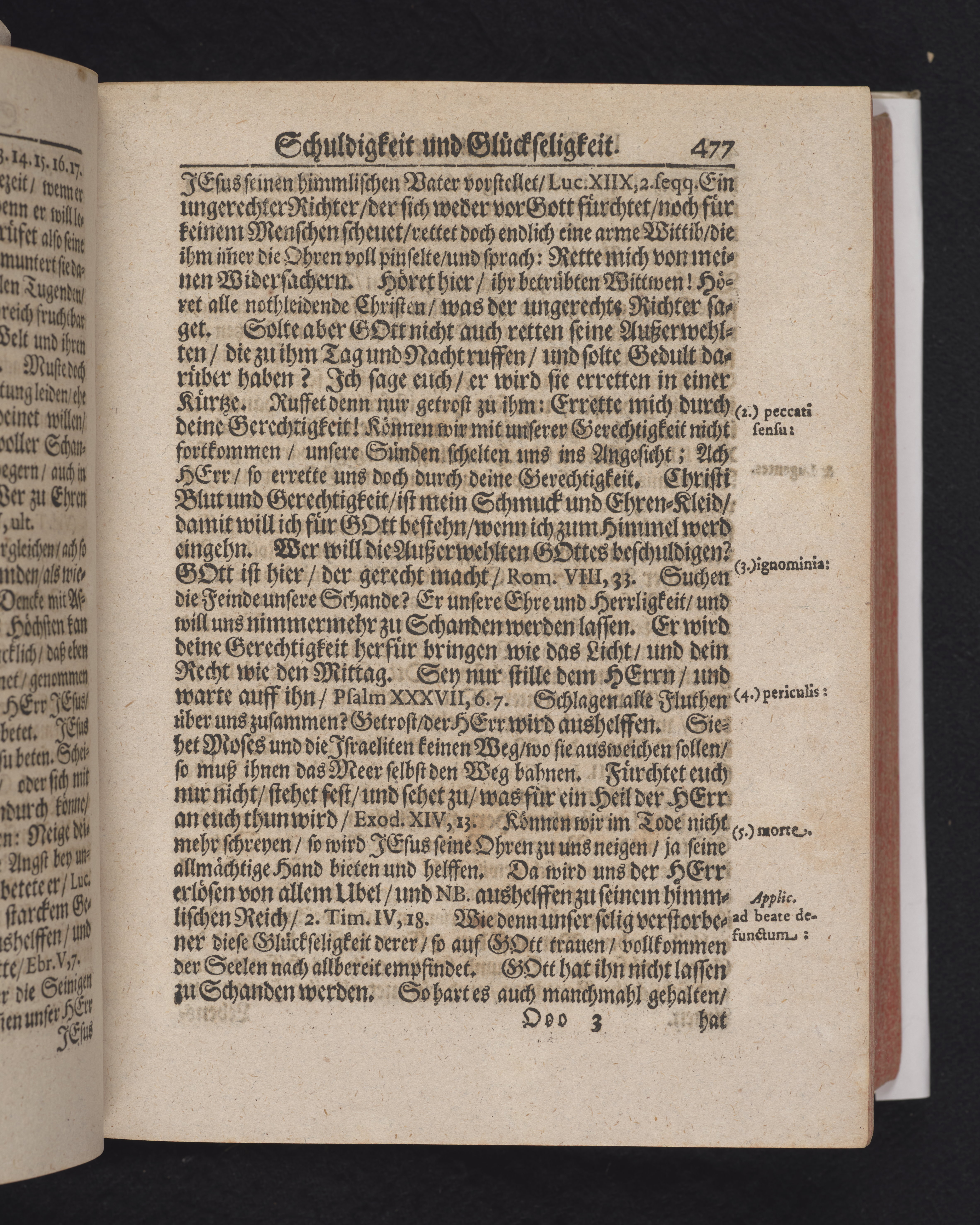 Ingår i en utgiven samling med 28 likpredikningar av Samuel Benedikt Carpzov: Grünende Gebeine, oder Leich-Predigten... Tryckt innehållsförteckning och register. Handskriven innehållsförteckning över de 28 likpredikningarna med bläck på främre försättsbladet (recto och verso).