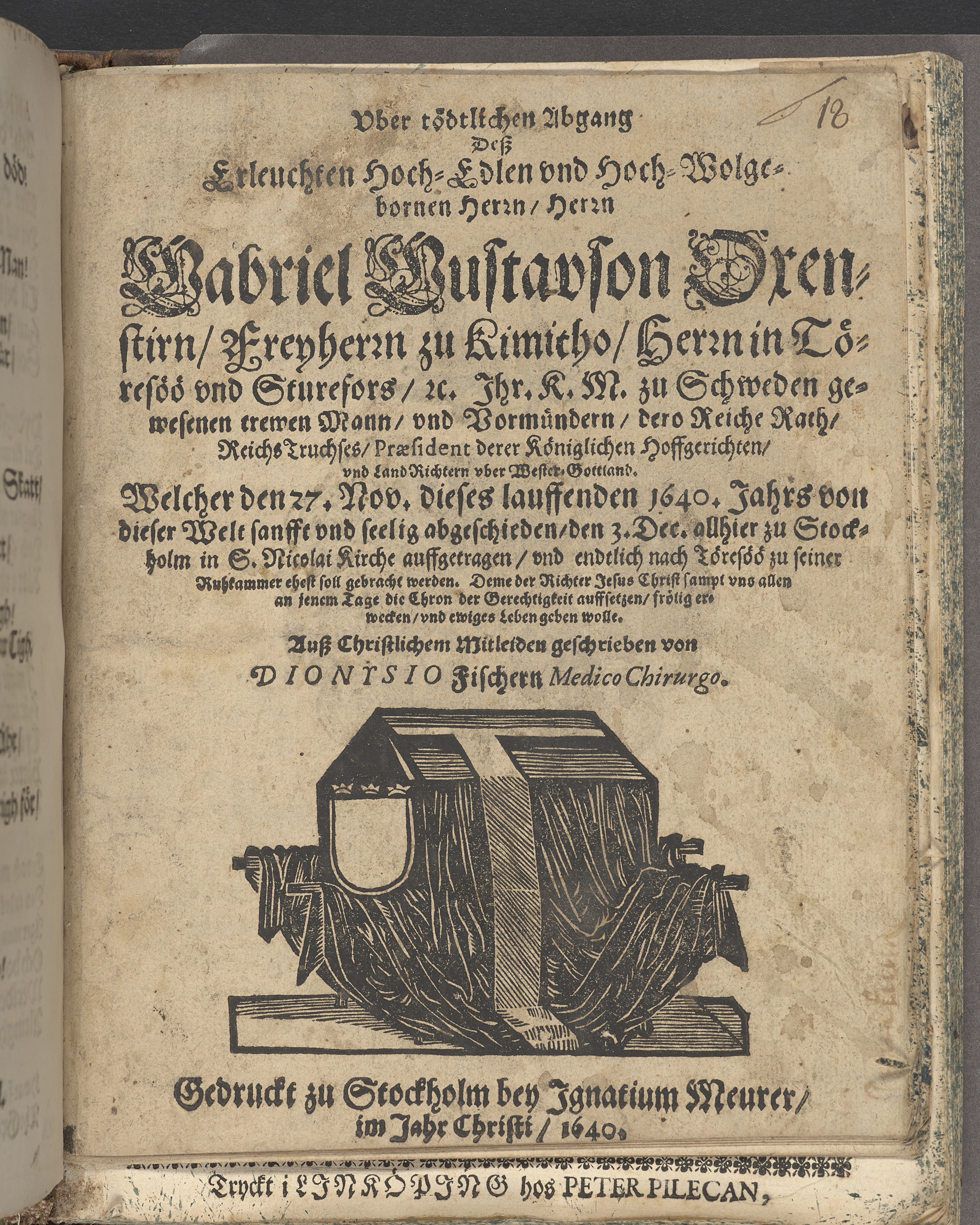 Vber tödtlichen Abgang desz erleuchten hoch-edlen vnd hoch-wolgebornen Herrn, Herrn Gabriel Gustavson Oxenstirn, Freyherrn zu Kimitho, Herrn in Töresöö vnd Sturefors ... welcher den 27. Nov. dieses lauffenden 1640. Jahrs von dieser Welt sanfft vnd seelig abgeschieden, den 3. Dec. allhier zu Stockholm in S. Nicolai Kirche auffgetragen ... ausz christlichem Mitleiden geschrieben von Dionysio Fischern ...