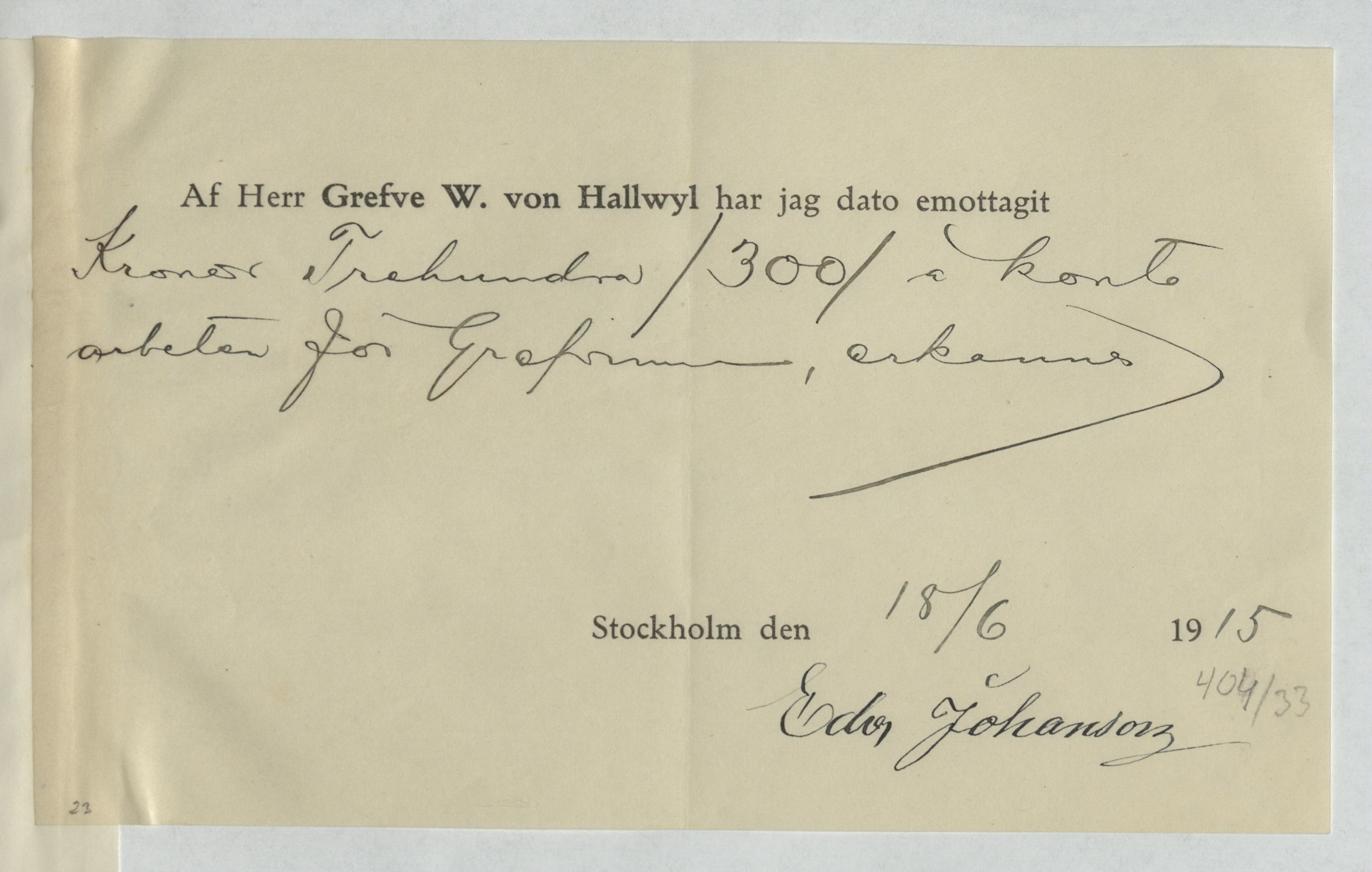 Kvitto från Edv. Johanson, Snickare. Gällande betalning för utfört arbete.