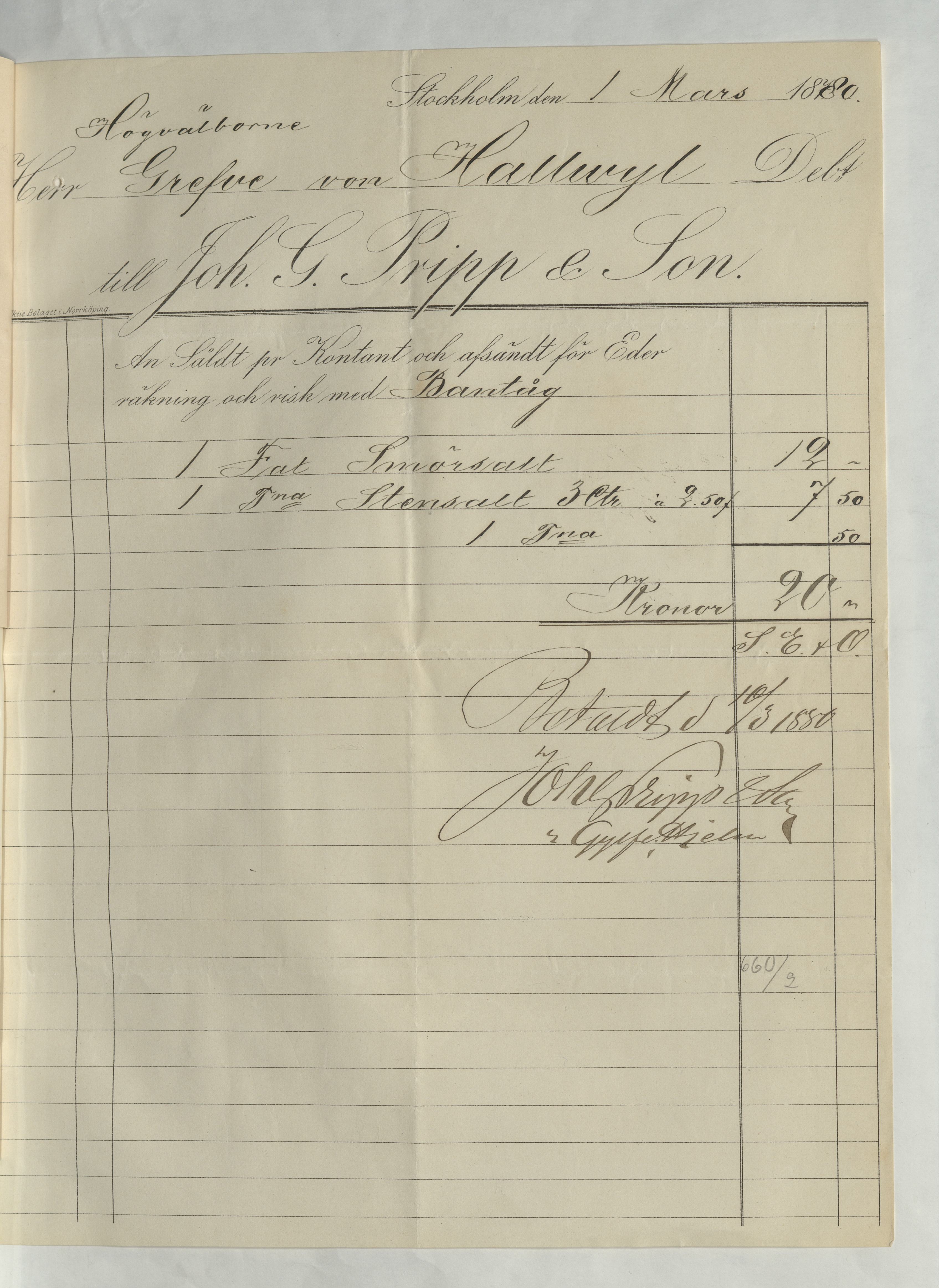 Kvitto från John. G. Pripp & Son. 20Kr betalt, 1 mars 1880.