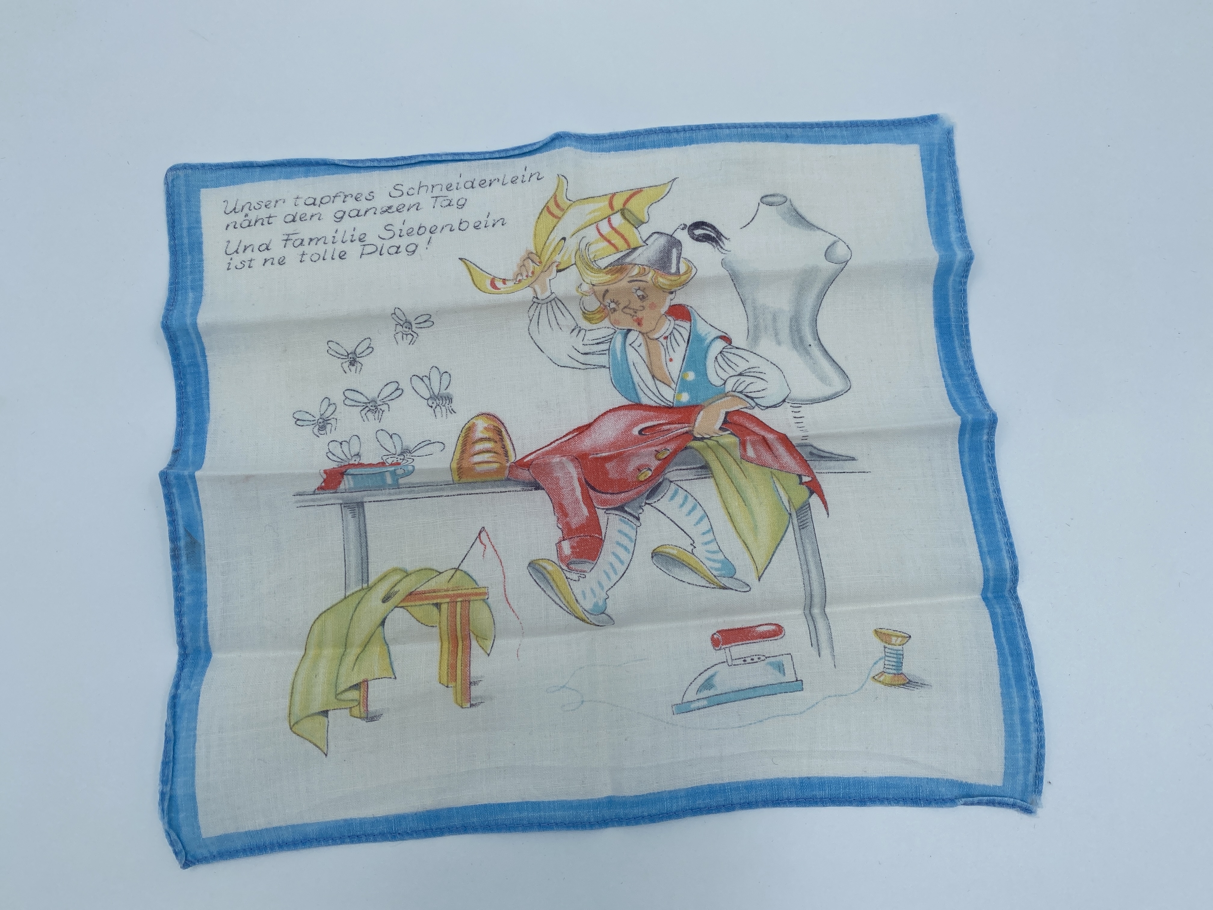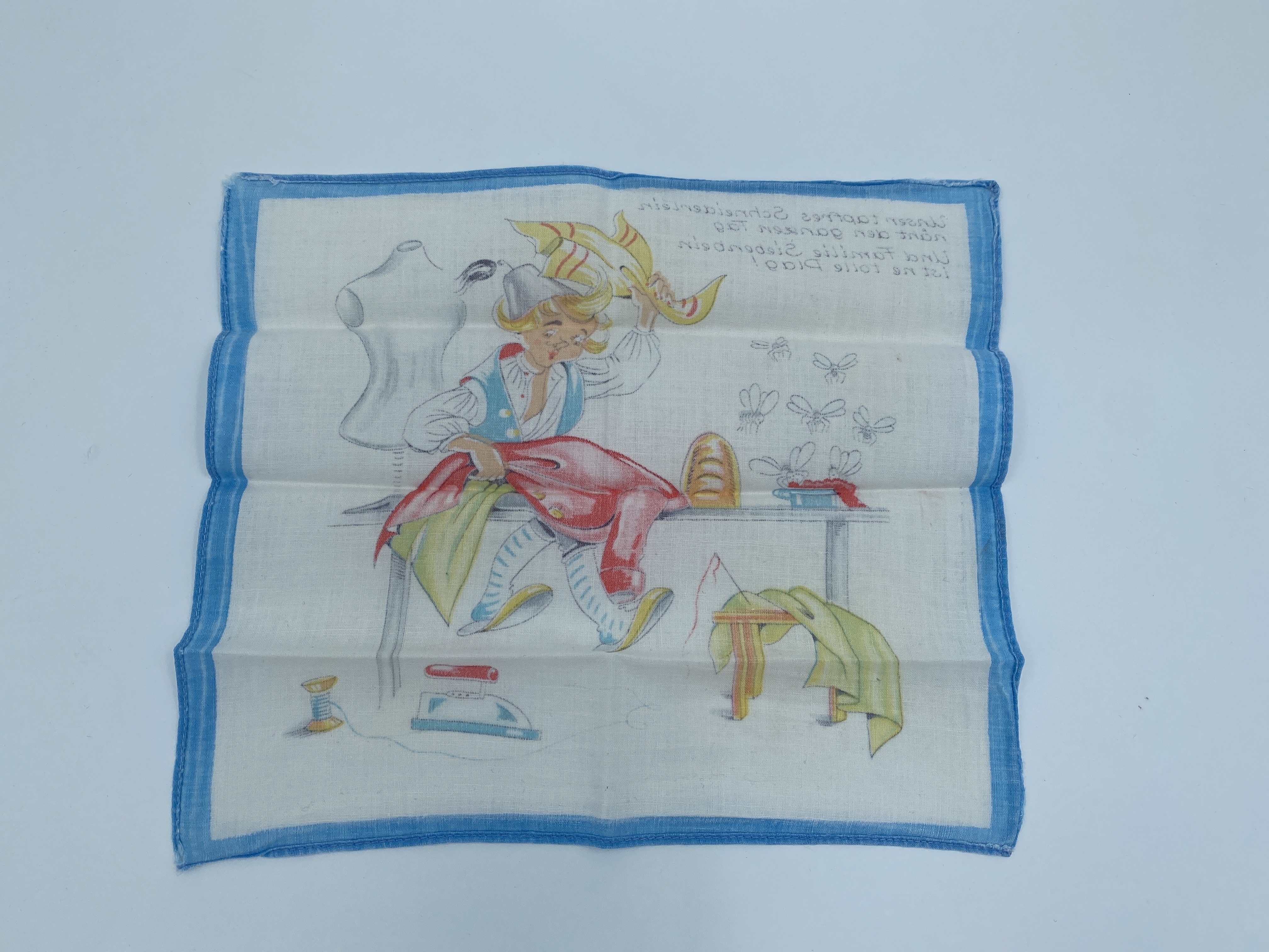 Barnnäsduk i bomull med ett tryckt motiv omgärdat av ljusblå bård. Motivet föreställer en tecknad skräddare som sitter på ett bord omgärdat av sina arbetsredskap. Uppe till vänster finns en tryckt vers på tyska. Var troligen del av packningen då Marion Loewe kom till Sverige med barntransporterna den 1 mars 1939.