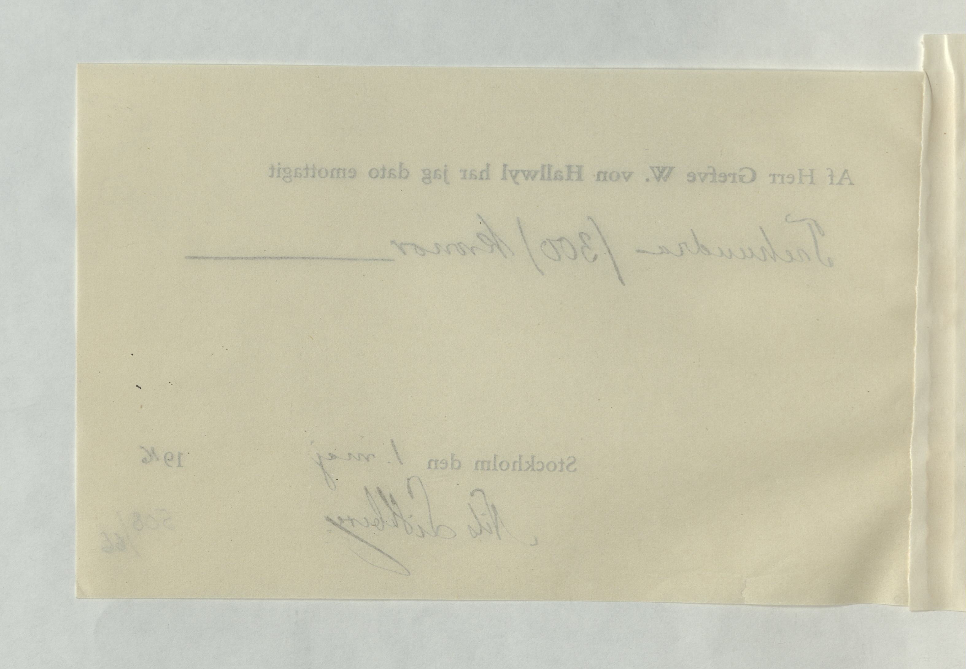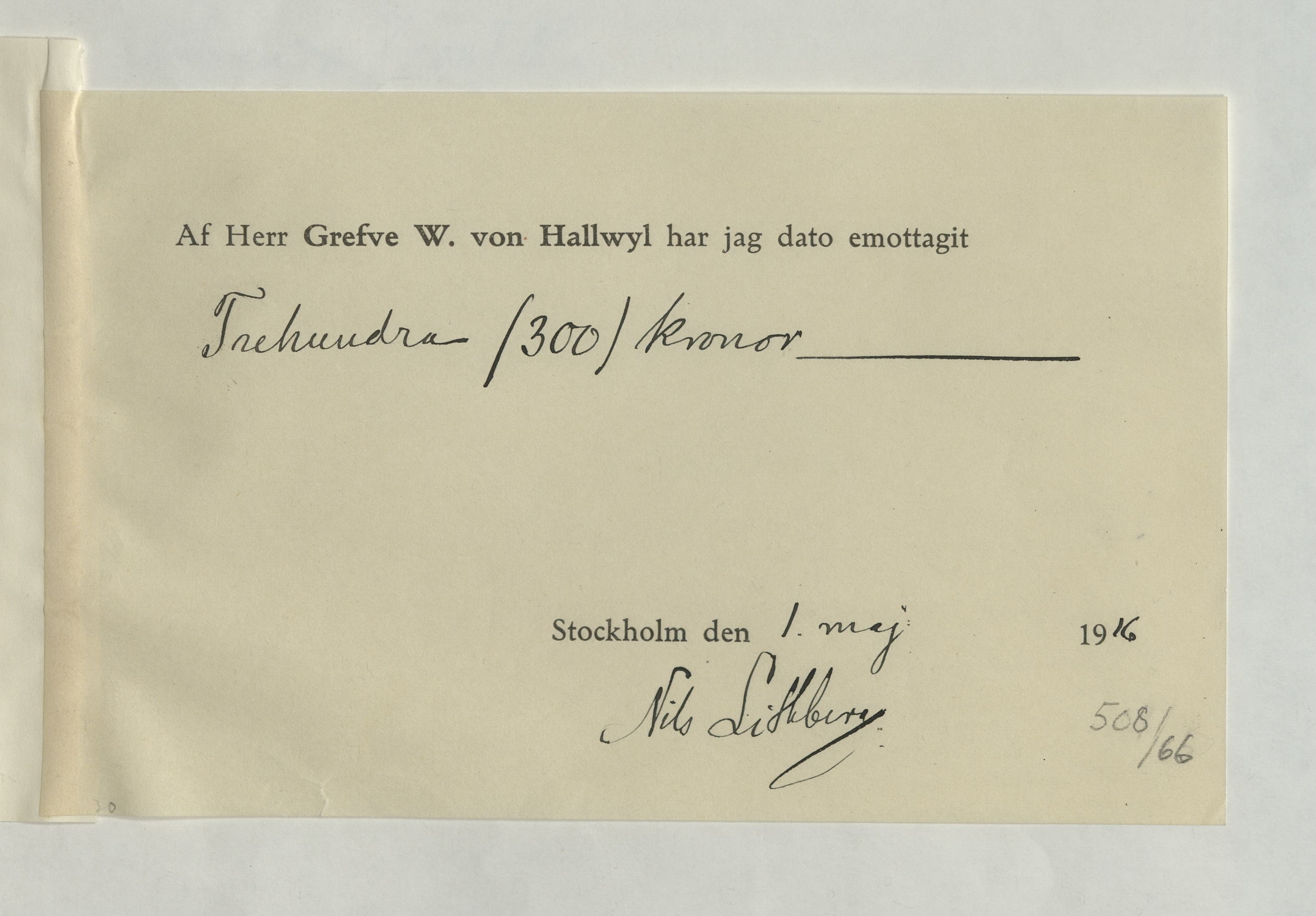 Emottagande av arvode från greven Walther von Hallwyl till Nils Lithberg, 1 maj 1916.