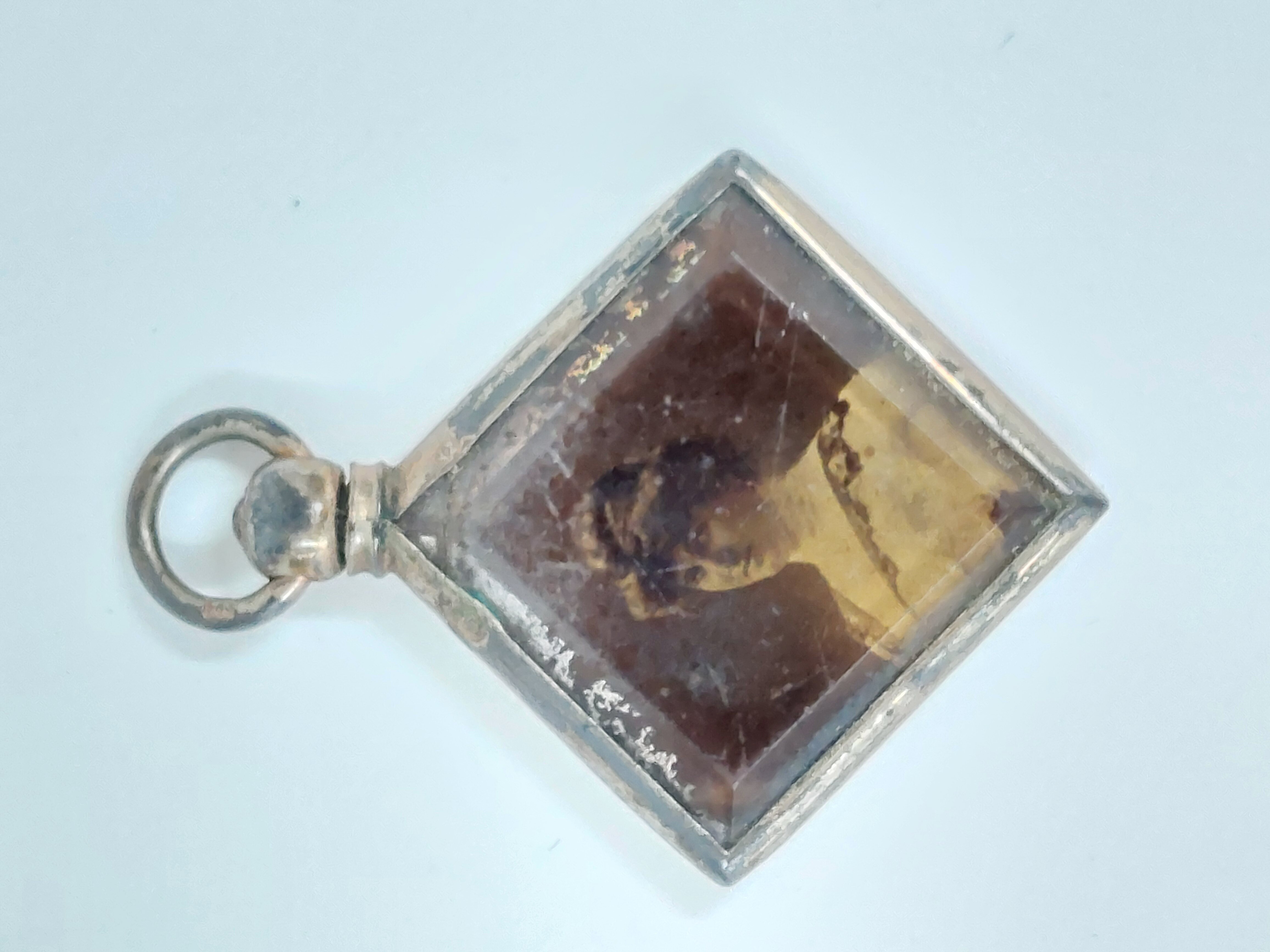 Fyrkantig berlock i hänge med porträttbild av en kvinna. Har troligtvis tillhört Karl eller A F Ullman och ärvts av Otto som kom utan sina föräldrar till Sverige 1939 genom Svenska Israelmissionen. Som 13-åring reste han från Wien där såg sina föräldrar för sista gången. Kontakten upprätthölls genom brev, tills de helt upphörde i och med att föräldrarna fördes bort från Wien till Theresienstadt och sedan Auschwitz där de mördades. Otto kom först till ett barnhem i Tollarp, och hamnade senare som 17-åring som dräng hos familjen Kamprad i Småland.