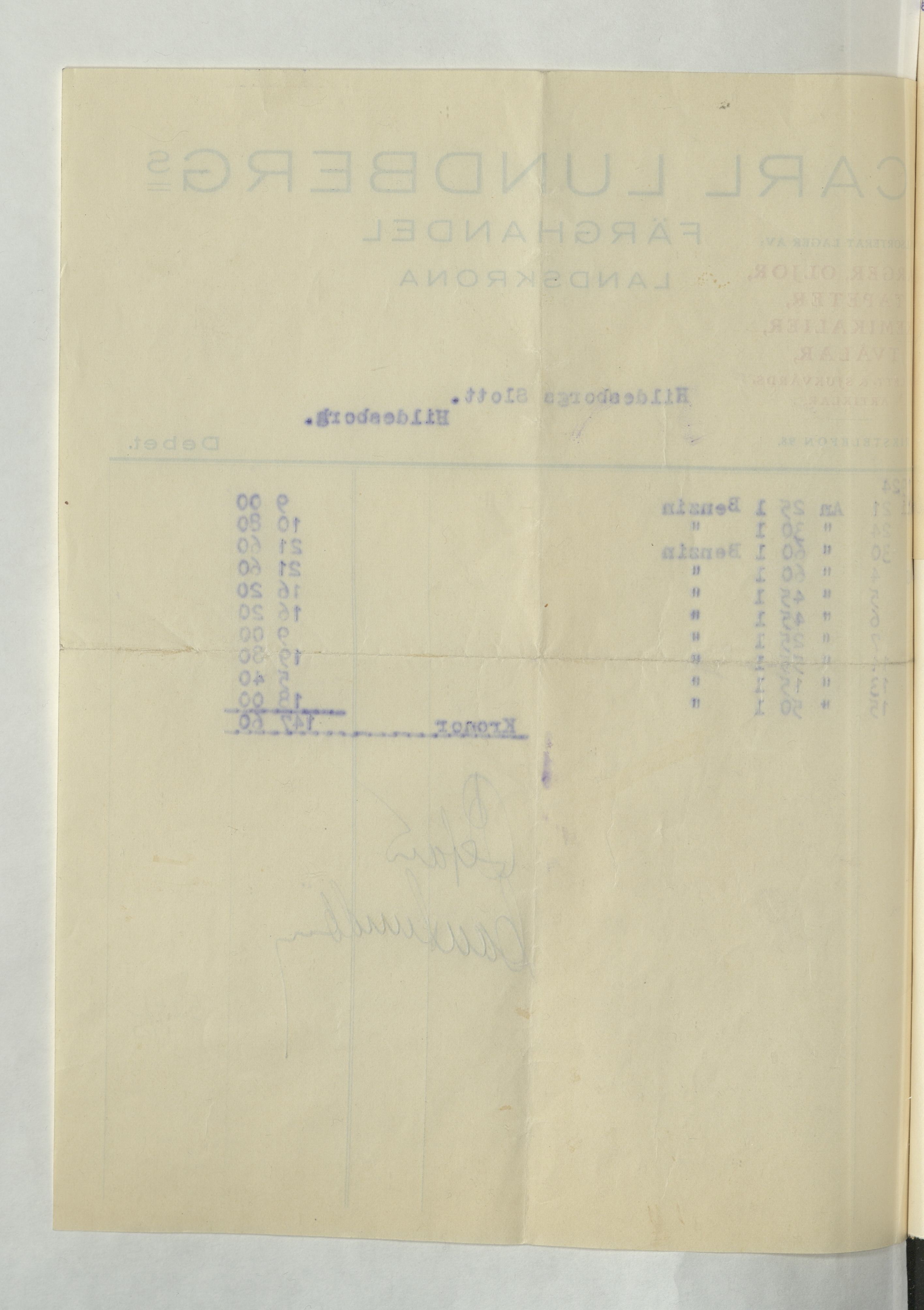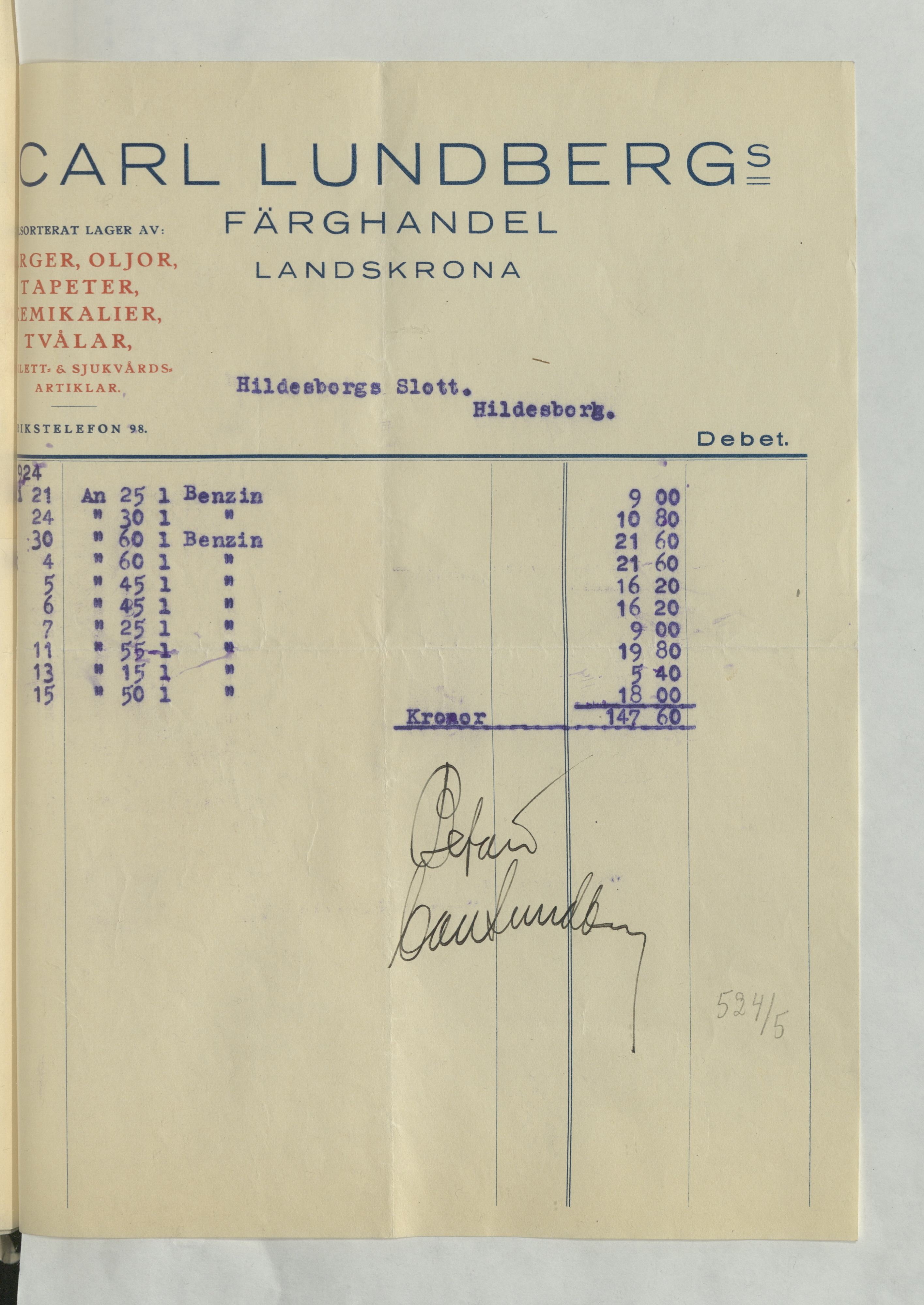 Kvitto från Carl Lundbergs Färghandel, Landskrona, till Hildesborgs slott. Inköpt Benzin för en totalsumma av 147:60Kr. Odaterat.