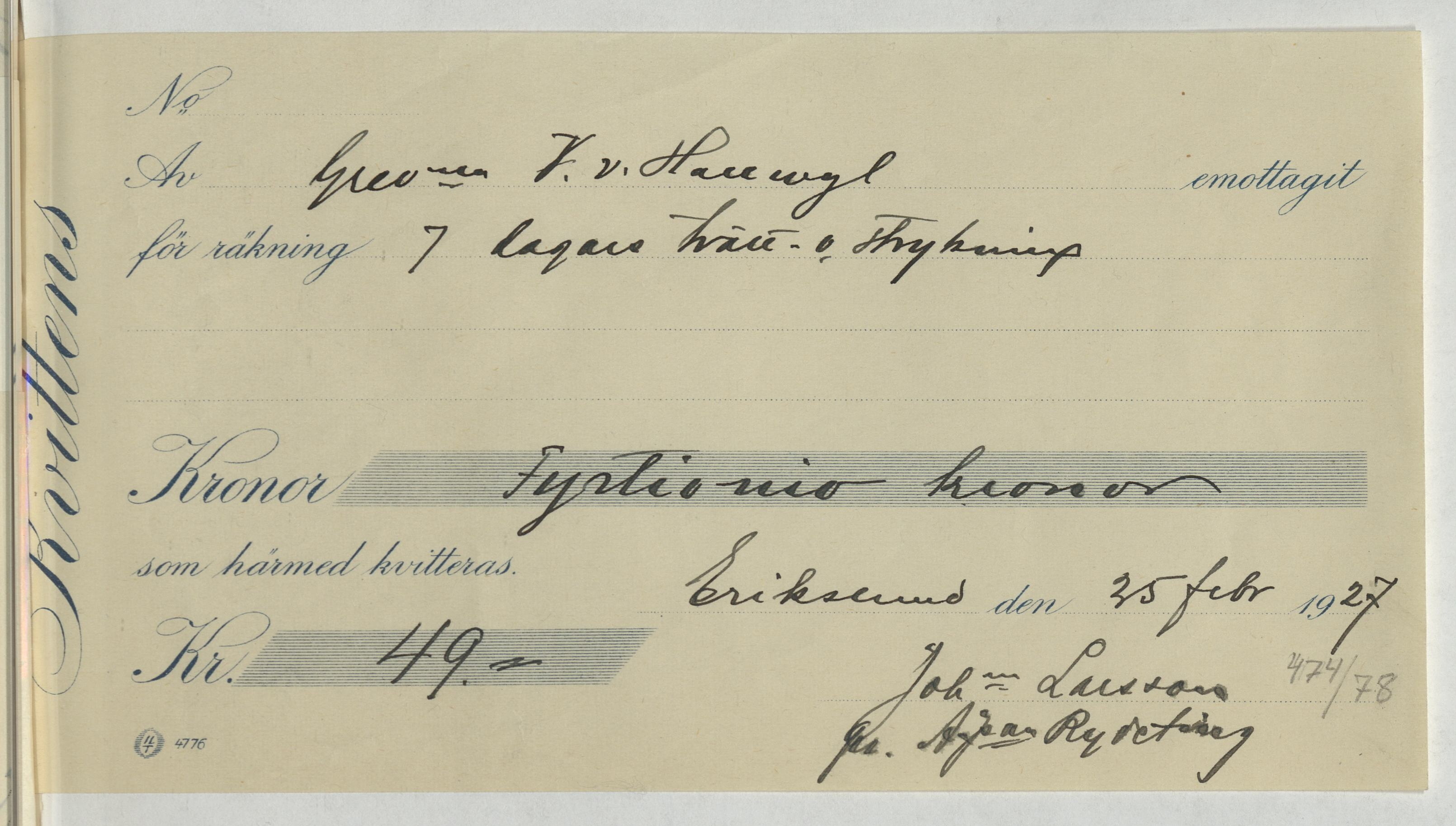 Kvitto från Johanna Larsson i Erikslund. Gällande 7 dagars tvätt- och strykning. Erikslund, 1927.