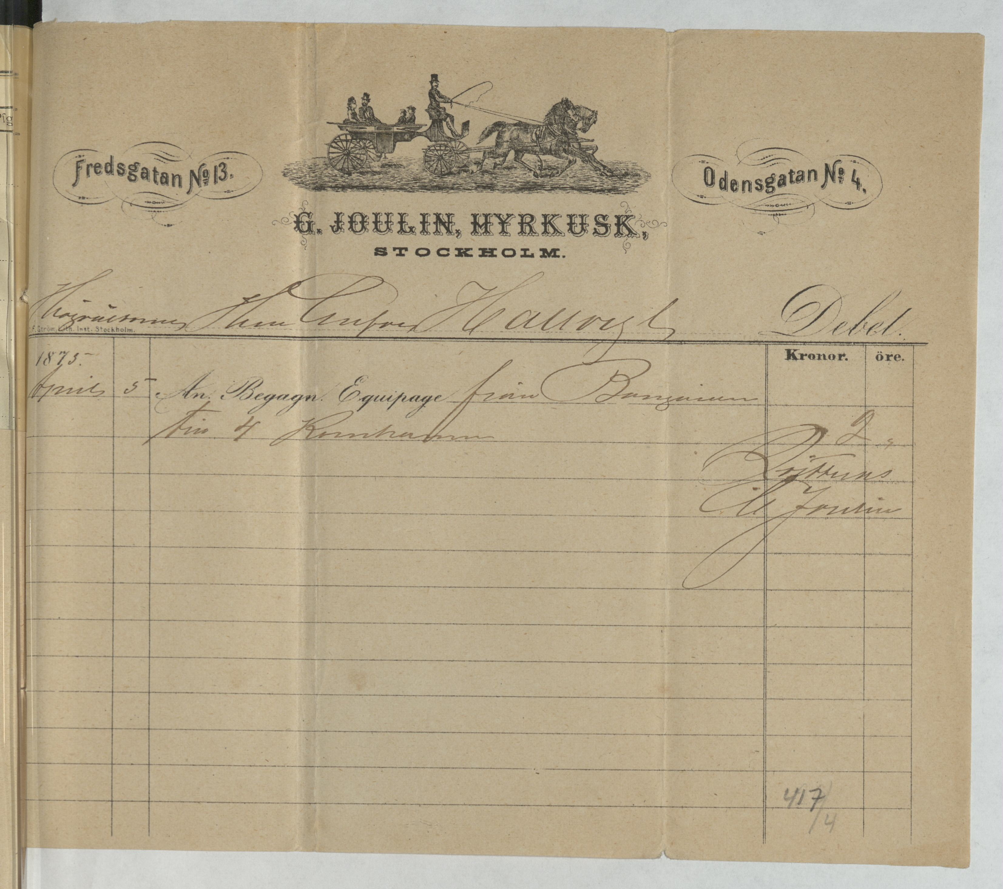 Kvitto från G. Joulin, Hyrkusk. April, 1875.