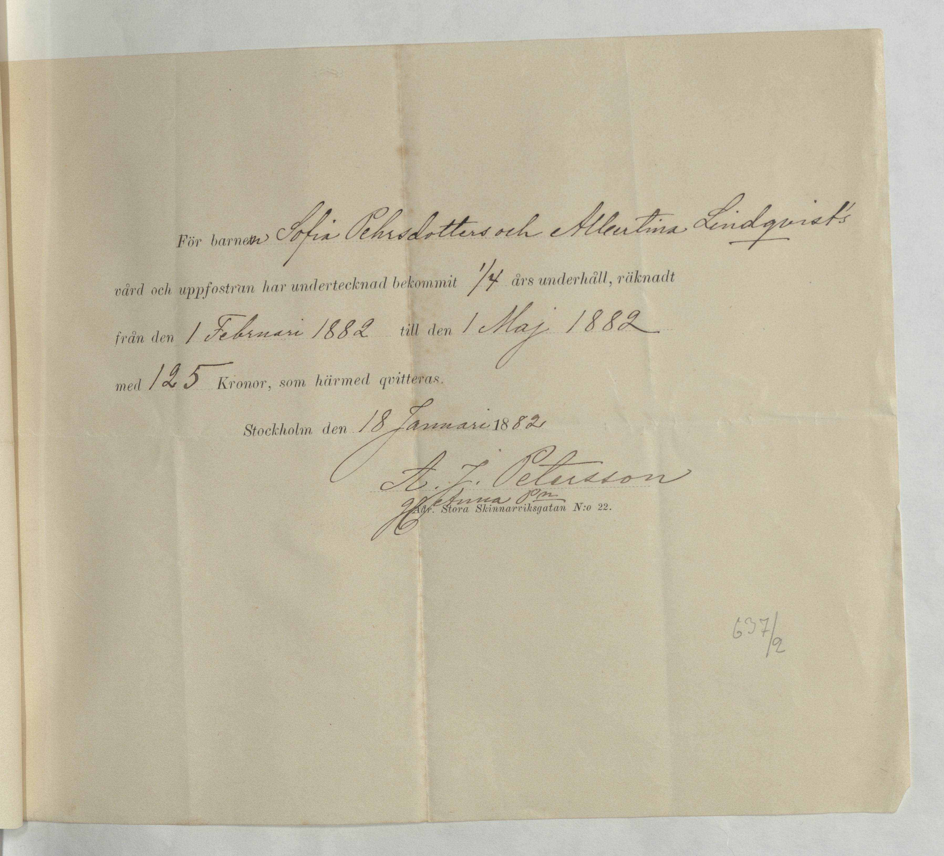 Kvitto från A.J Pettersson, underhåll för barnen Sofia Matilda Petersson och Albertina Lindquist, för vård och uppfostran har A.J Pettersson fått 1/4års underhåll, mellan 1 februari 1882 och 1 maj1882, med 125Kr vilket nu kvitteras. Stockholm 18 januari 1882.