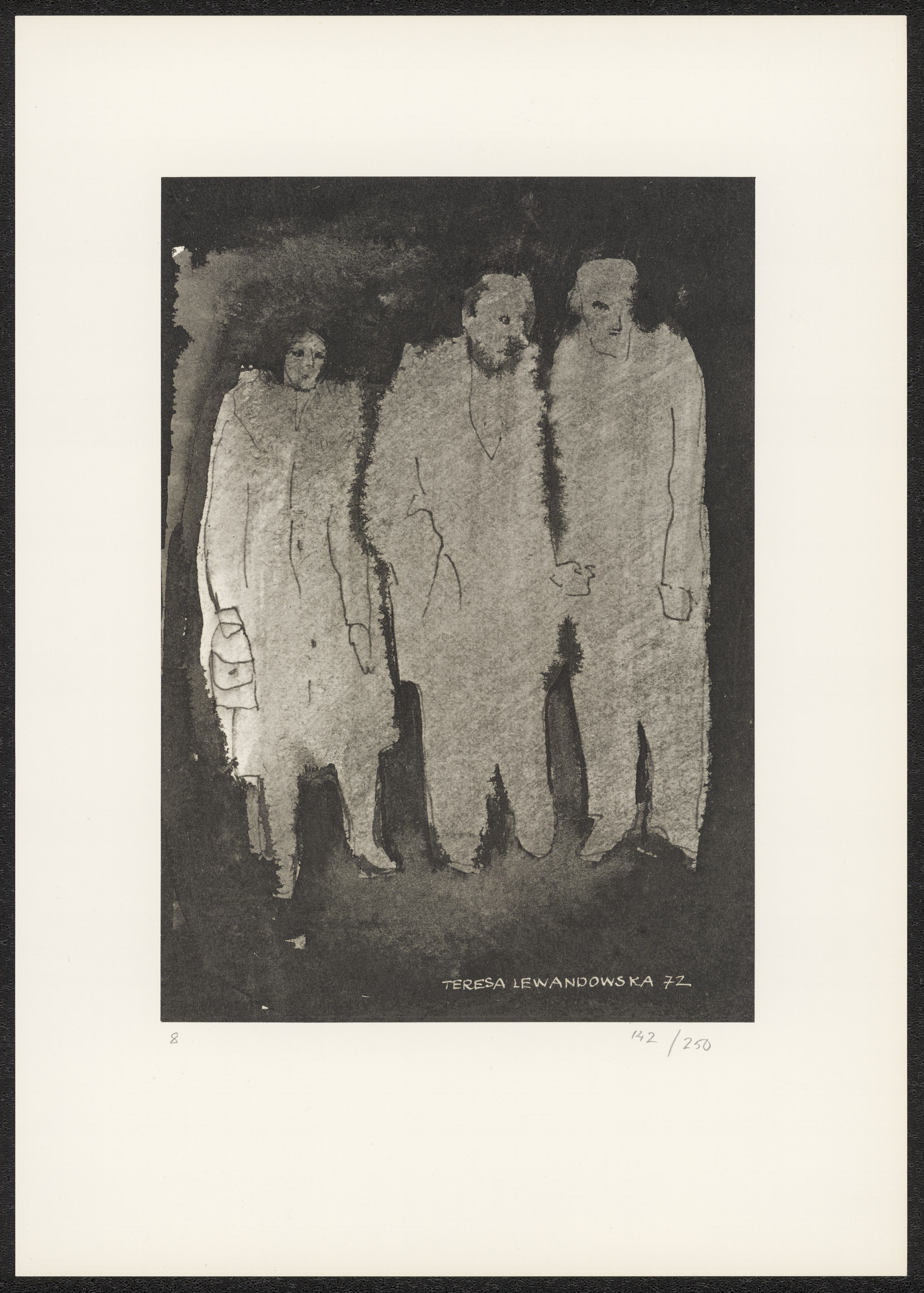 Grafiskt blad av Teresa Lewandowska, gjort för Amnesty International 1973. Konstverken speglar hennes erfarenheter av Förintelsen i Polen.