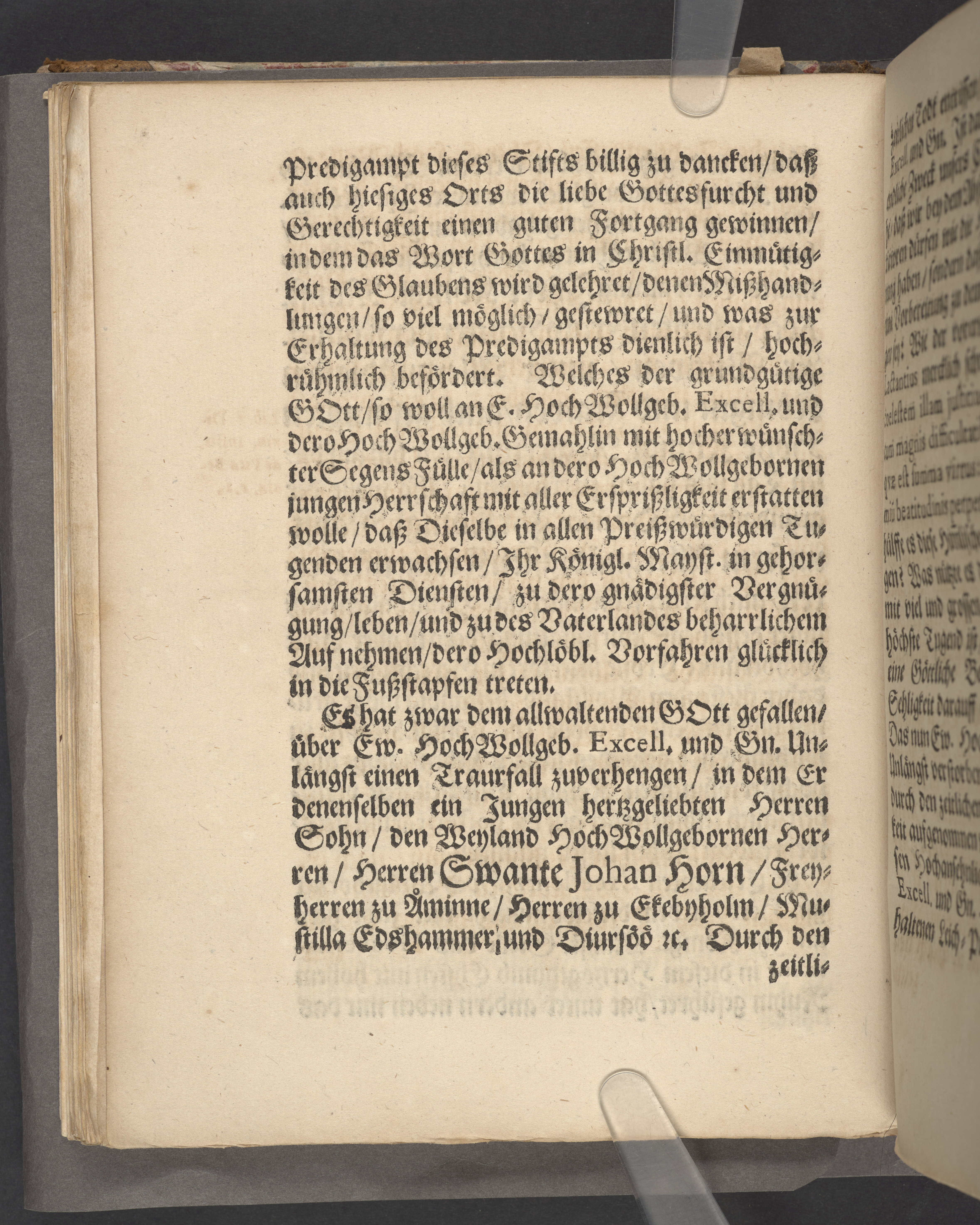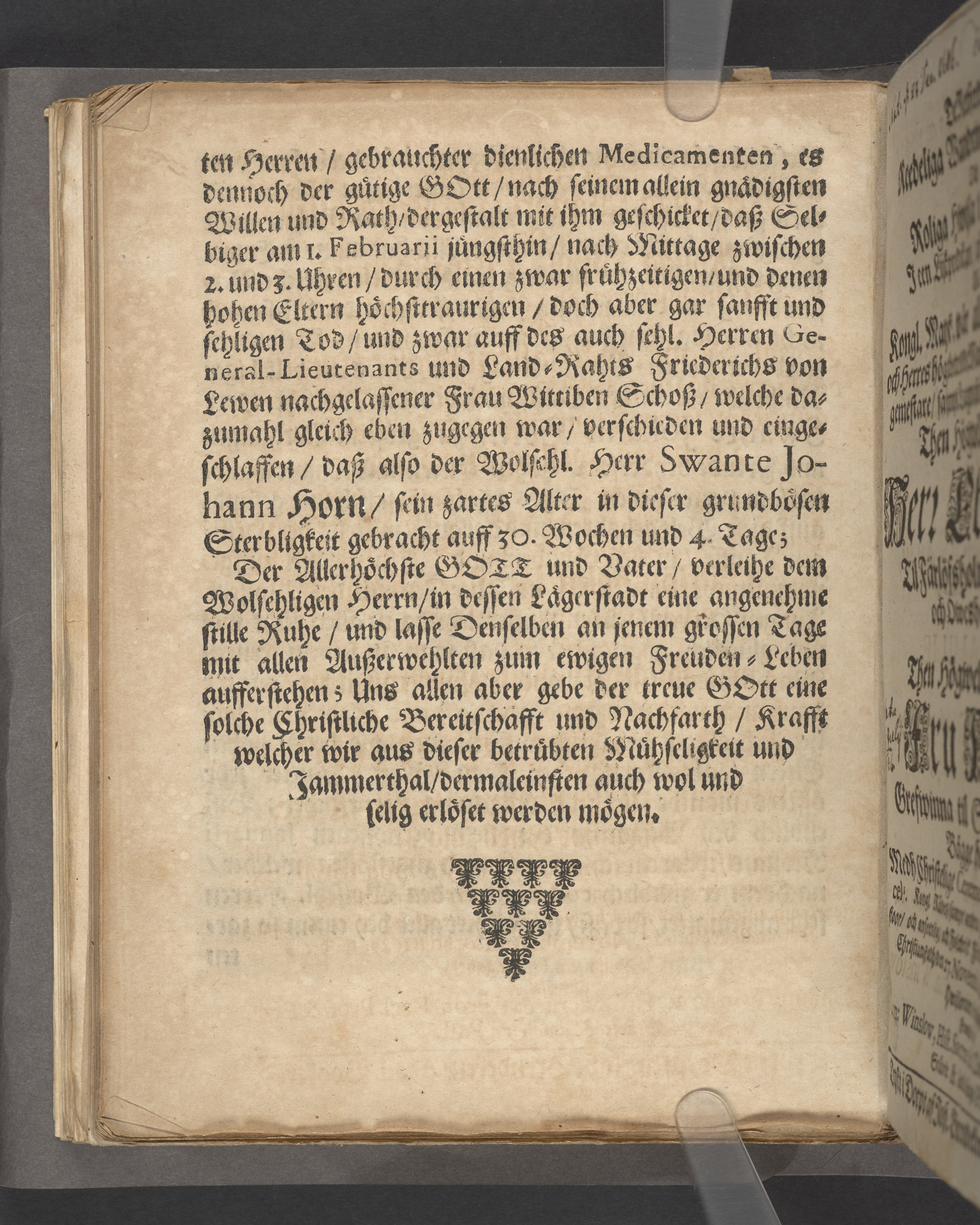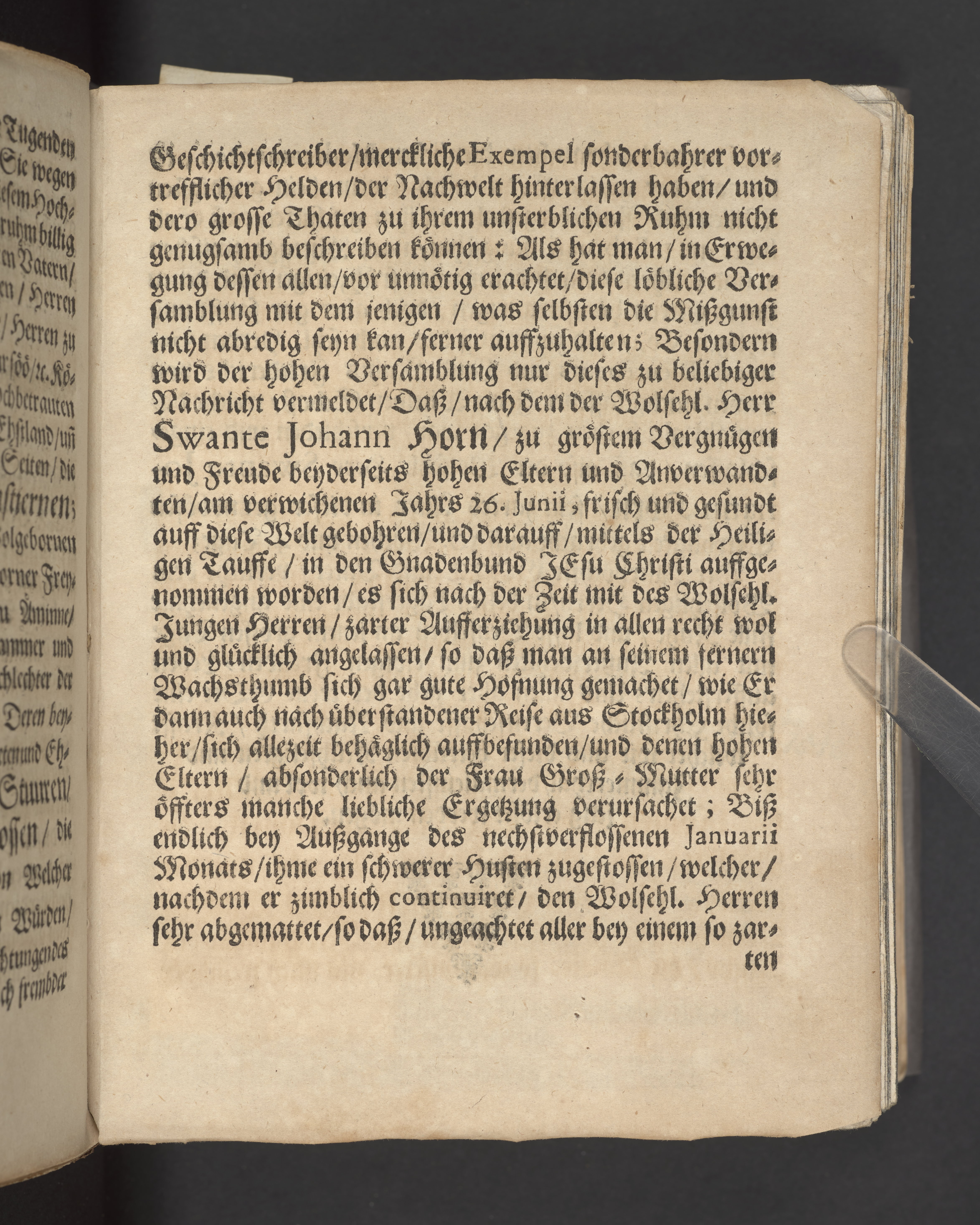 Die Kraft der heiligen Tauffe ... bey hochansehnlich-gehaltener Leichbegeignüß, des ... Herren Swante-Johan Horns, Frey-Herren zu Åminne ... ihrer Excellentz des ... Herren Bengt Horns, Frey-Herren zu Åminne ... Sohns, welcher den I. Februarii dieses 1671sten Jahres in Gott ... verschieden ... in einer Christl. Leichpredigt fürgestellet und erklehret durch Johannem Jacobum ...