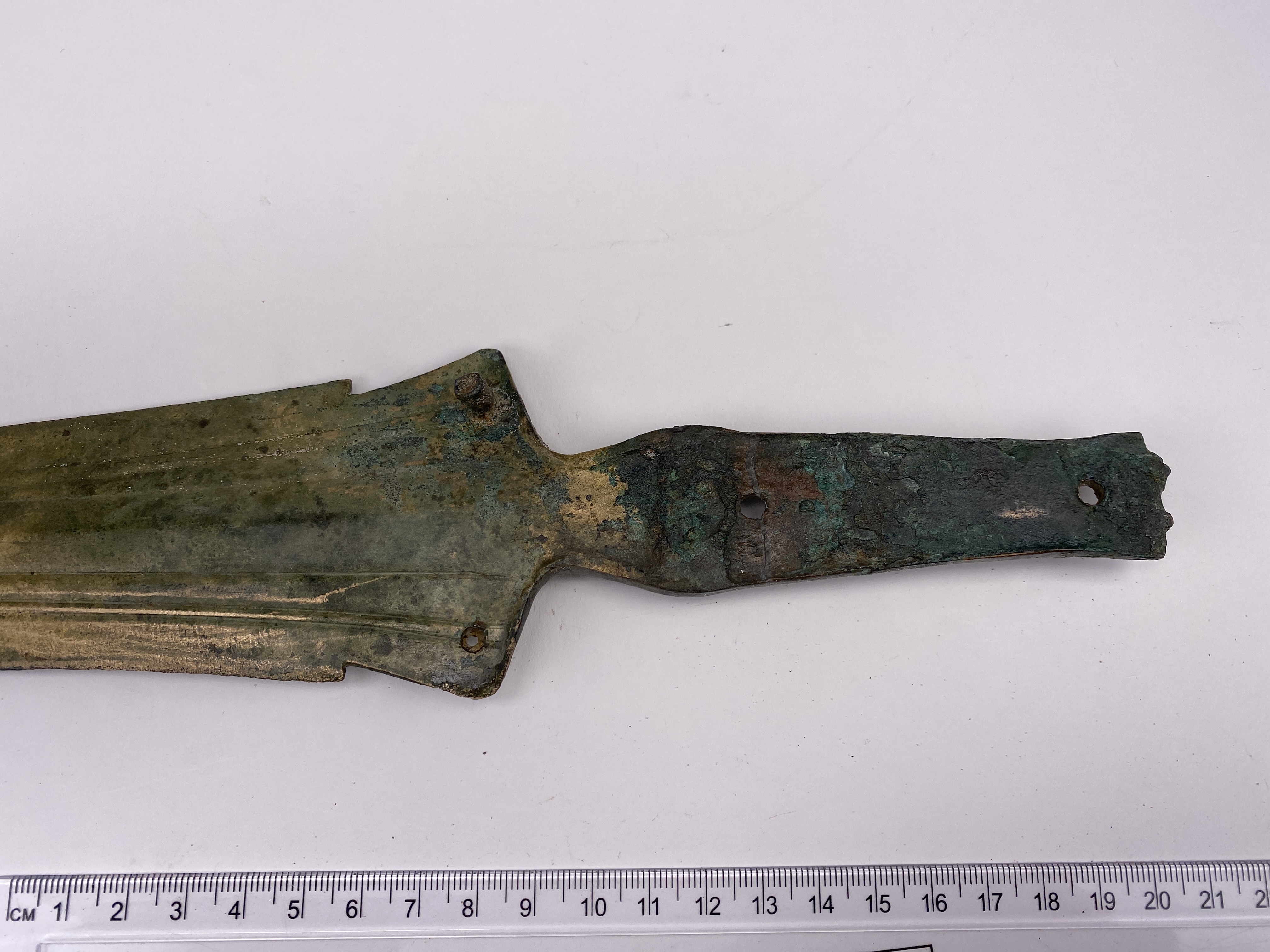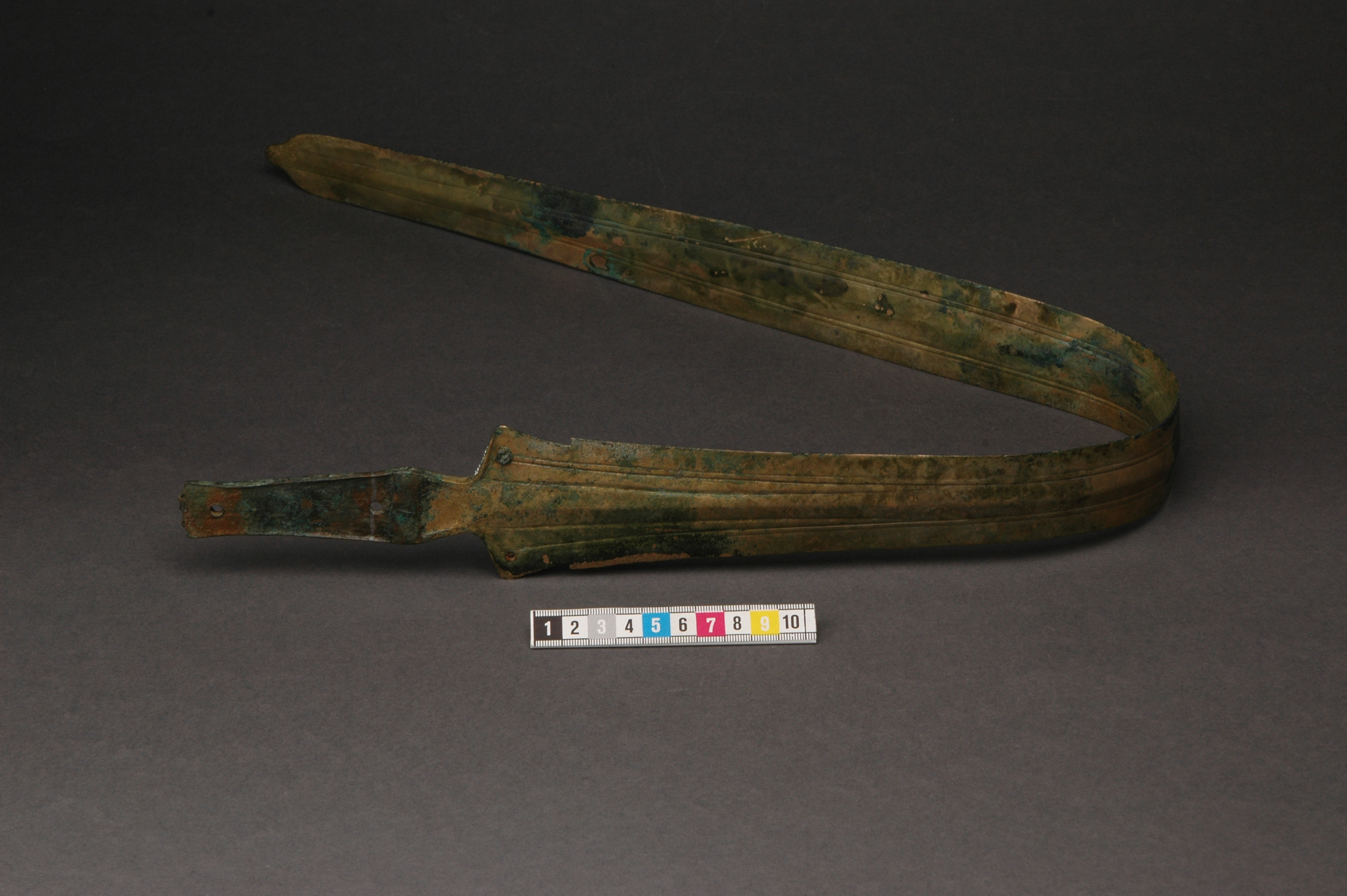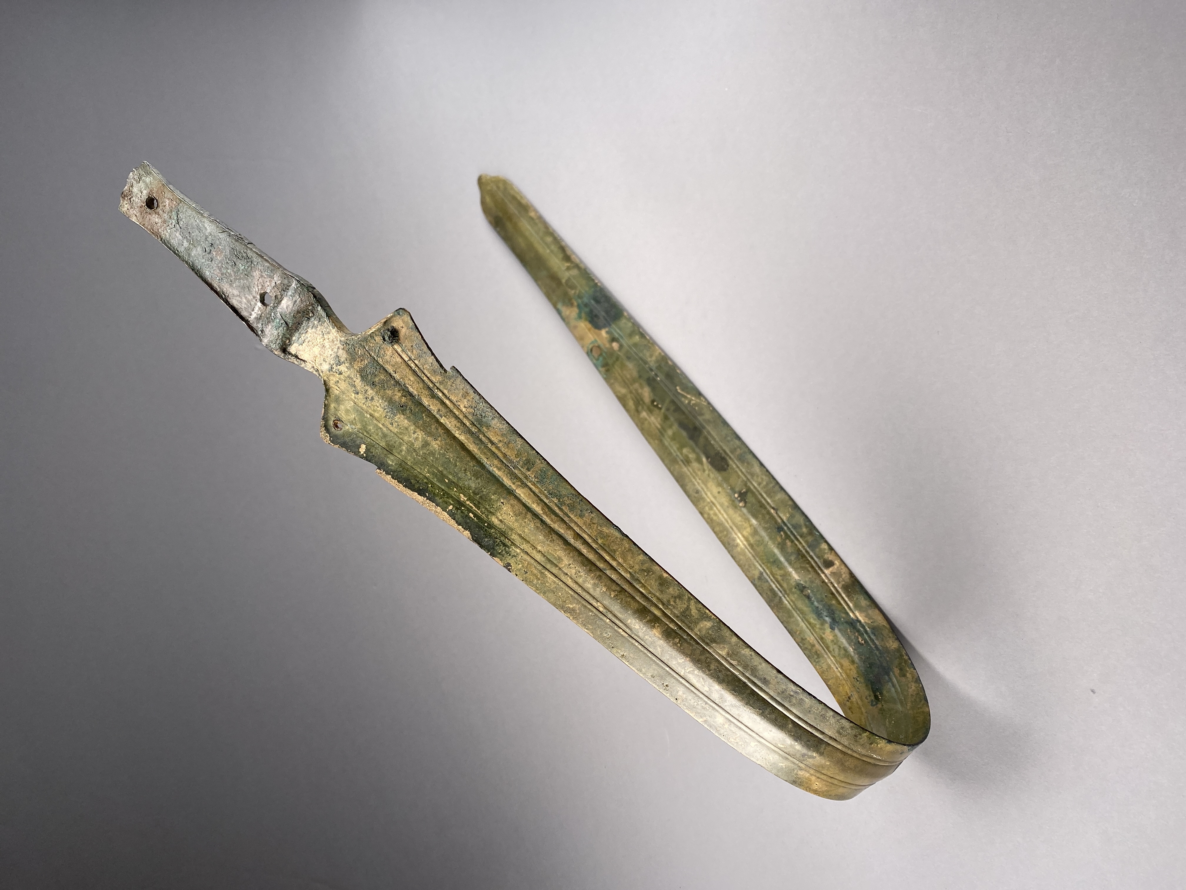 Ett hallstattsvärd av brons, böjd på mitten med urnupen spets och trubbig udd. Svärdet är på vardera sidan av bladet försedd med en mittvulst och upphöjda ränder. Fästet har fyra nithål med en bevarad nit in situ. sprötet på fästet saknas. Förefaller vara något hårdare uppskärpt och välanvänt än det andra svärdet.