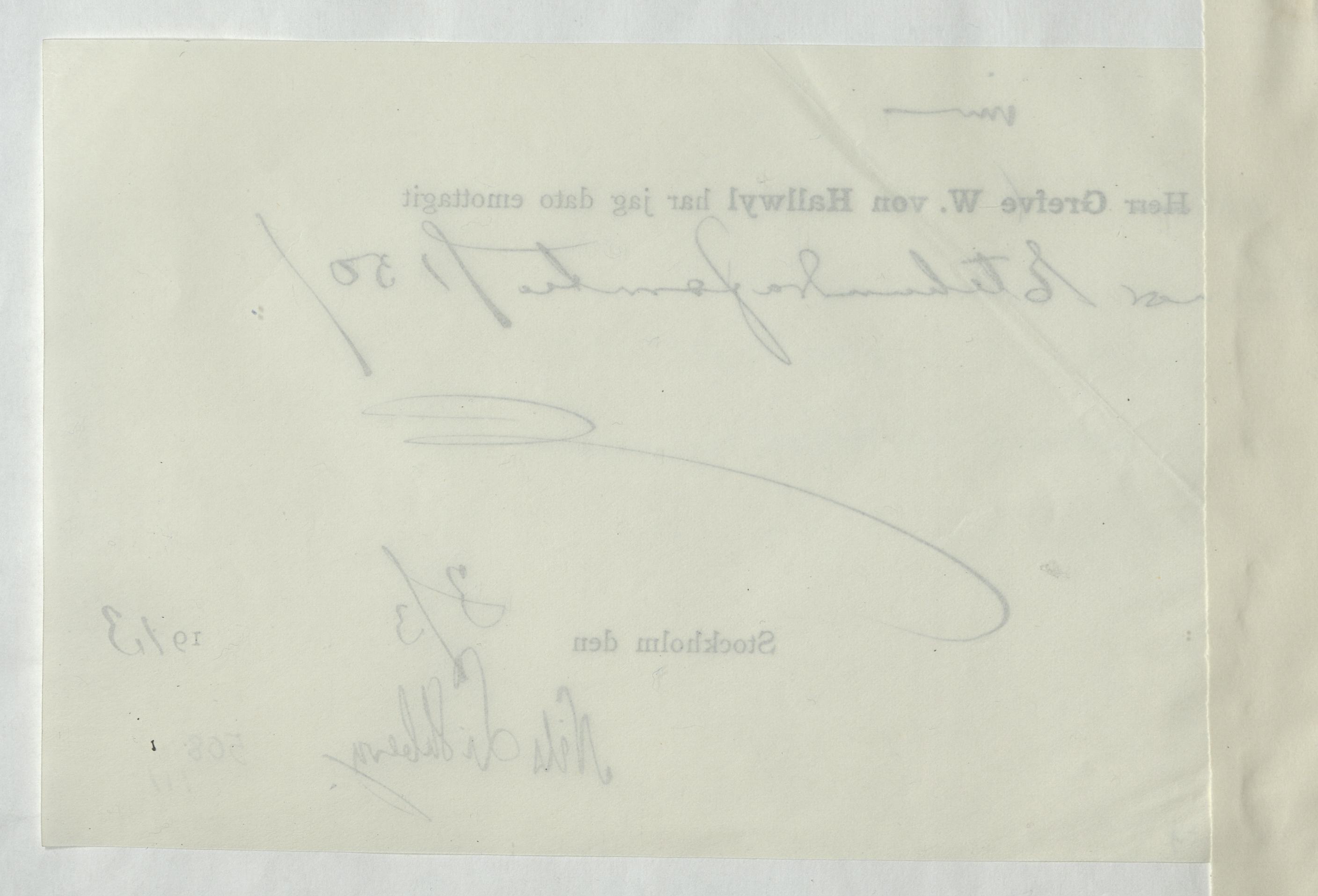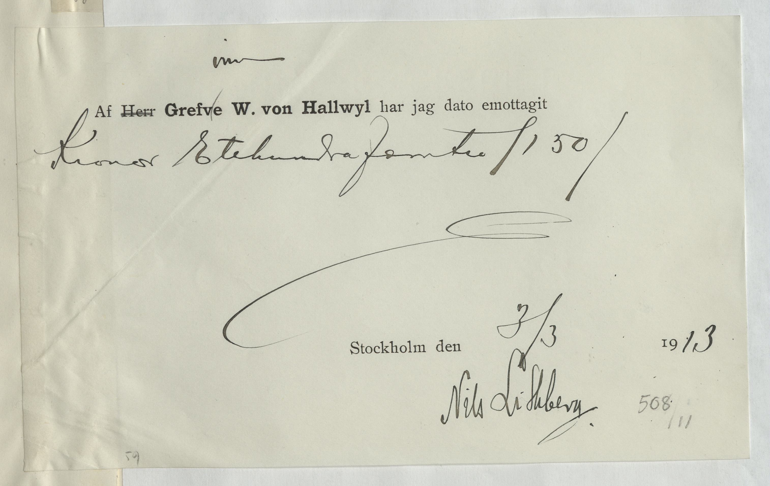 Kvitto gällande pengatransaktion mellan Wilhelmina von Hallwyl och Nils Lithberg. Stockholm, 1913.