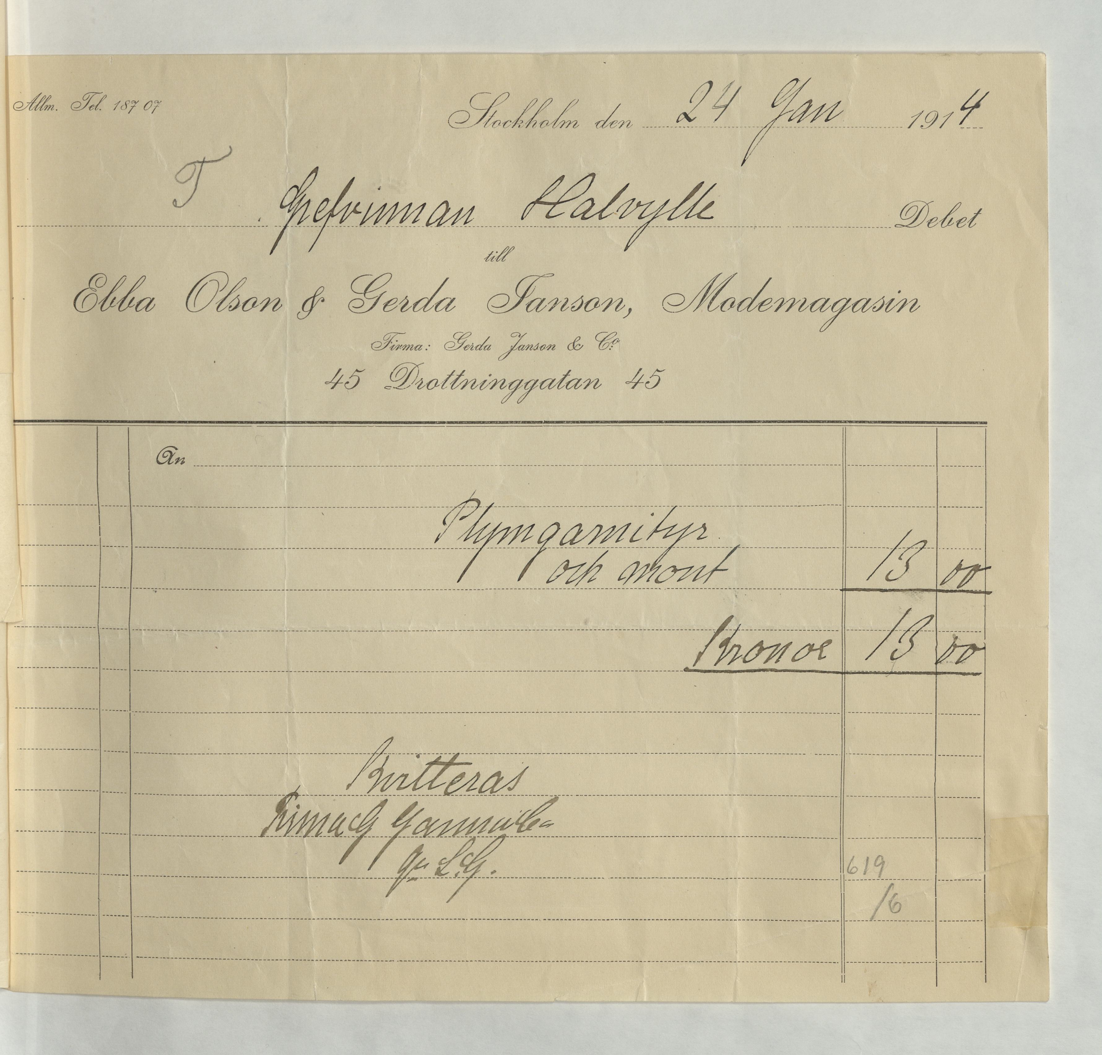 Kvitto från Ebba Olson & Gerda Janson, Modemagasin. Inköpt Plymgarnityr och montering, totalsumma av 13Kr. Betalt Stockholm 24 januari 1914.