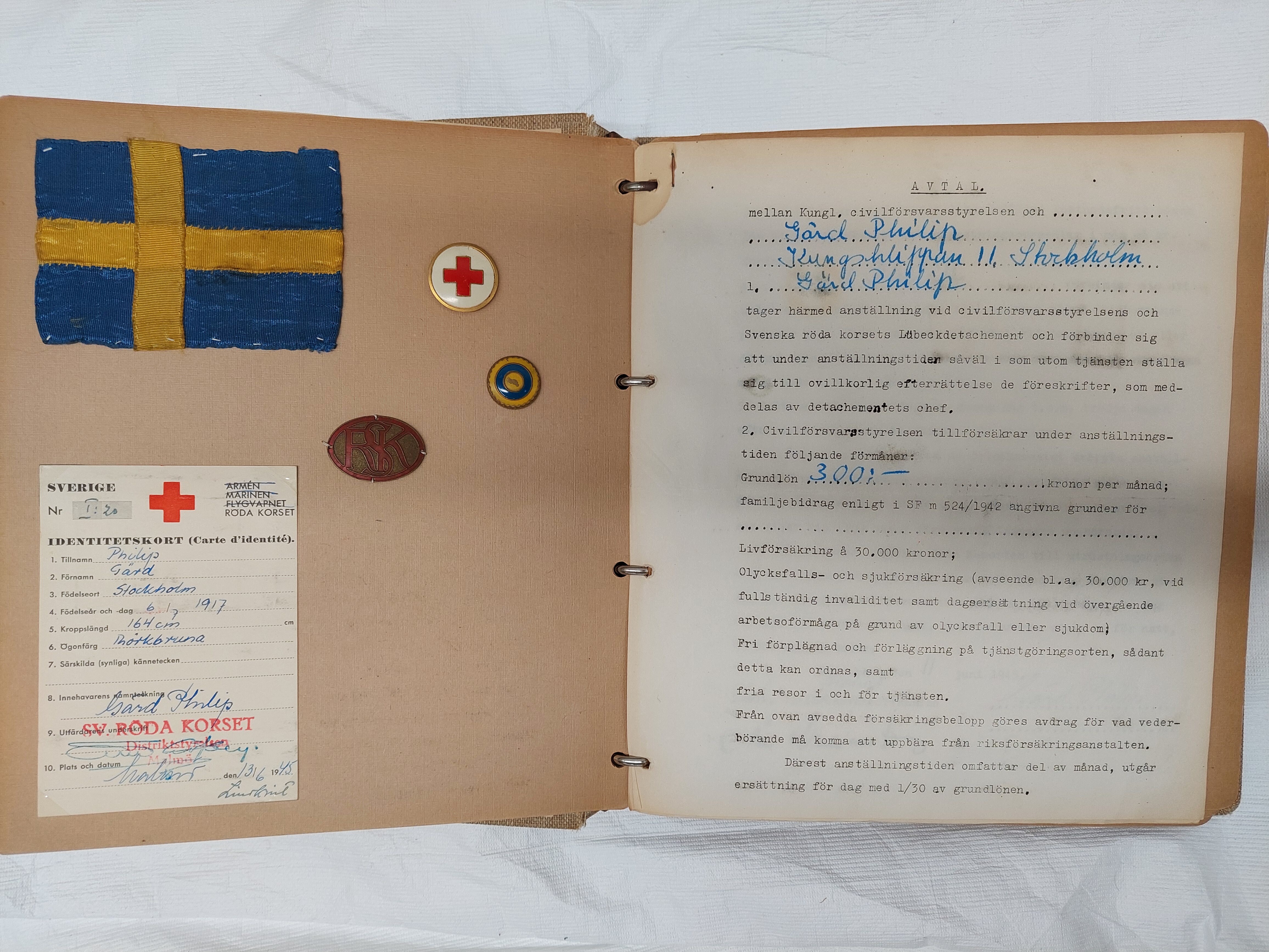 Album klätt i brunt linnetyg som innehåller bilder, dokument och betraktelser från hennes resa till Tyskland sommaren 1945 som rödakorssyster. Gärd Philip reste till Lübeck och arbetade i det brittiska fältsjukhuset under juni och juli månad och följde med patienter till Sverige på Kronprinsessan Ingrid som anlände till Helsingborg 25 juli. Fotografierna skildrar Cambraikasernerna där fältsjukhuset låg, de olika behandlingsstegen som patienterna genomgick, den brittiska och svenska personalen samt sönderbombade byggnader. Utöver fotografier finns även tjänstgöringsintyg, kartor, minnesmärken, tidningsklipp och medlemslista för föreningen "Utlandskamraterna" - de som tjänstgjorde under insatsen.
