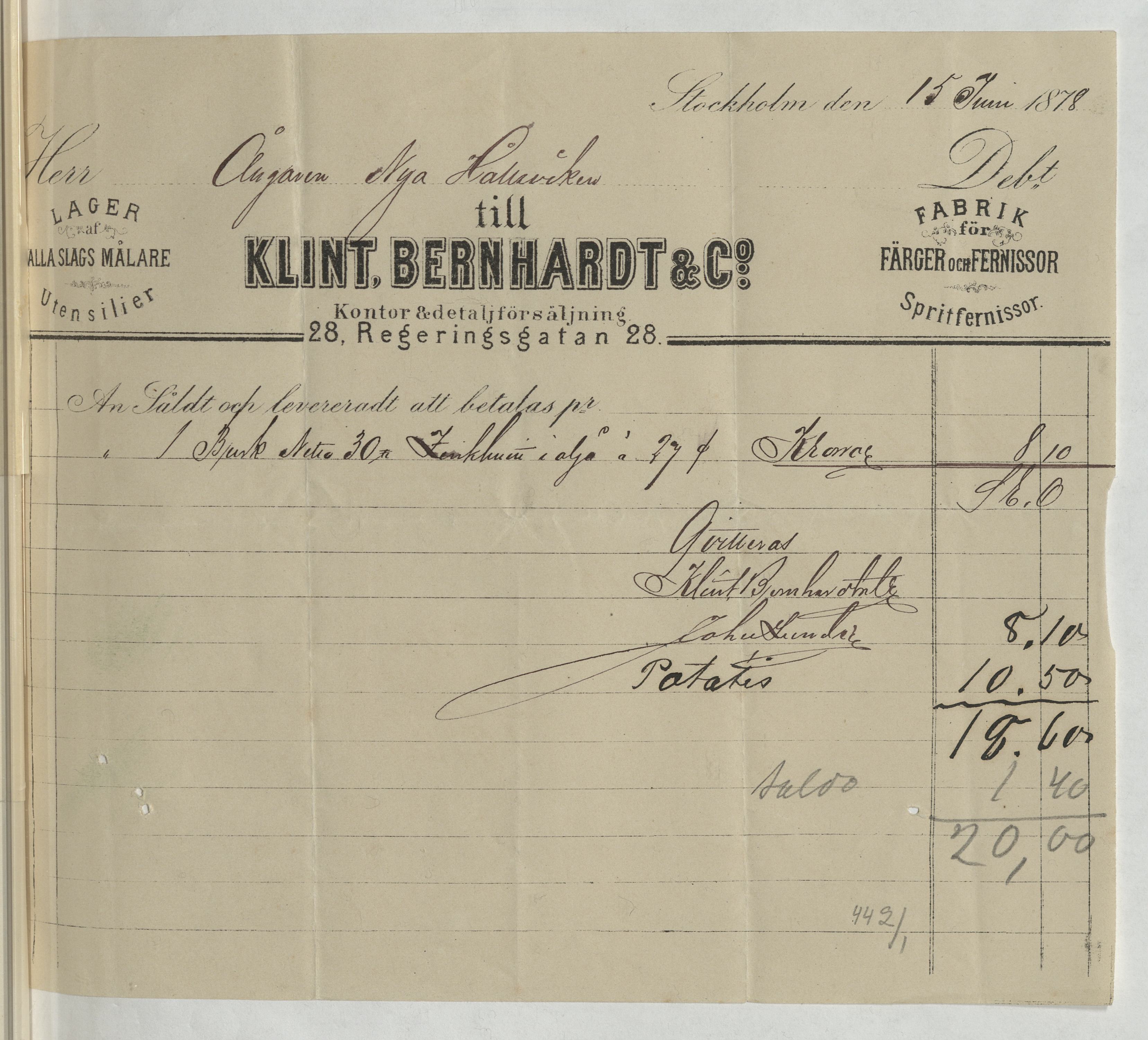 Kvitto från Bernhardt Klint & Co. Stockholm, 1878.