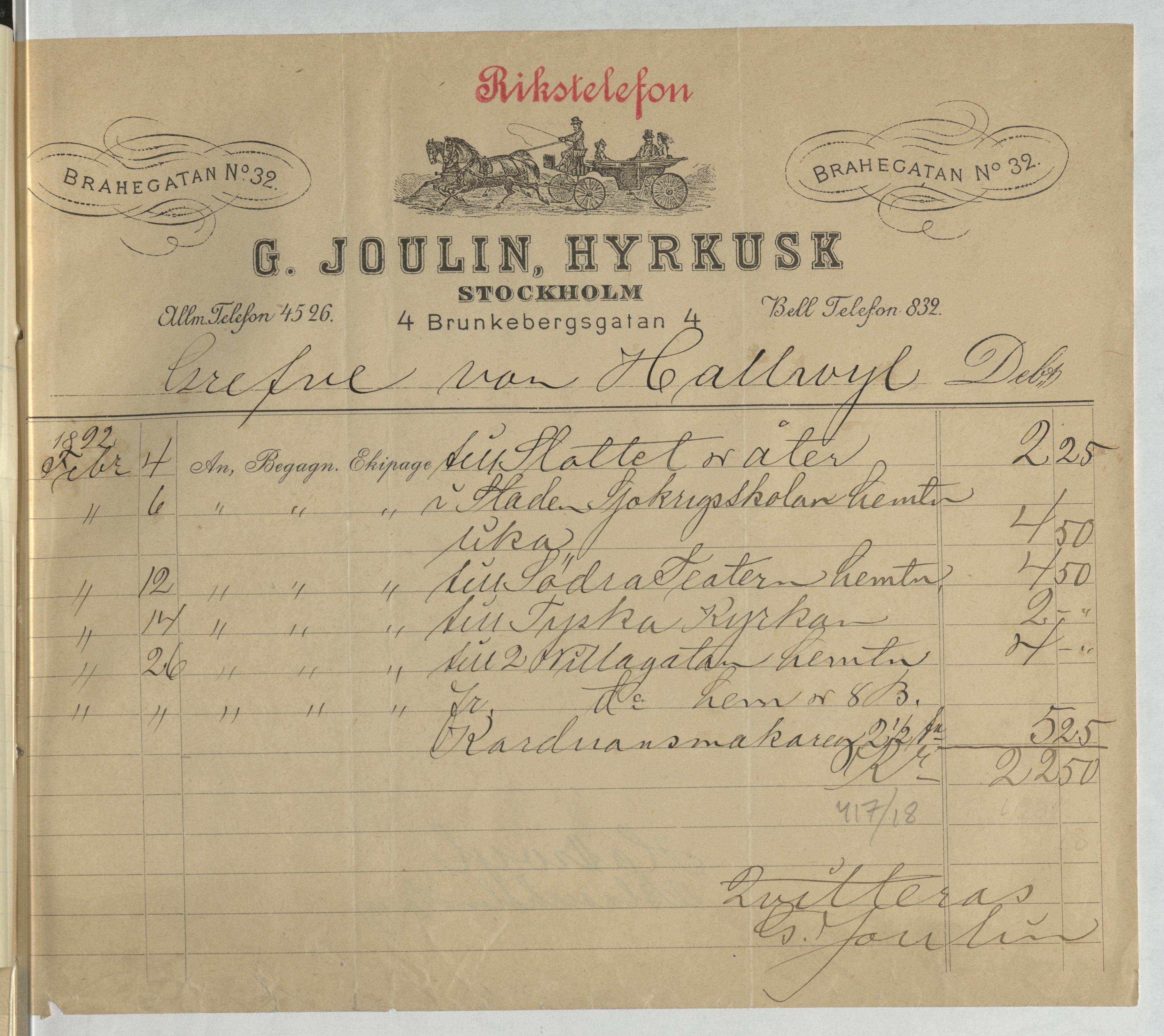 Kvitto från G. Joulin, Hyrkusk. Gällande resor till och från platser så som stallet, Sjökrigsskolan, Södra teatern och Tyska kyrkan. Stockholm, 1892.