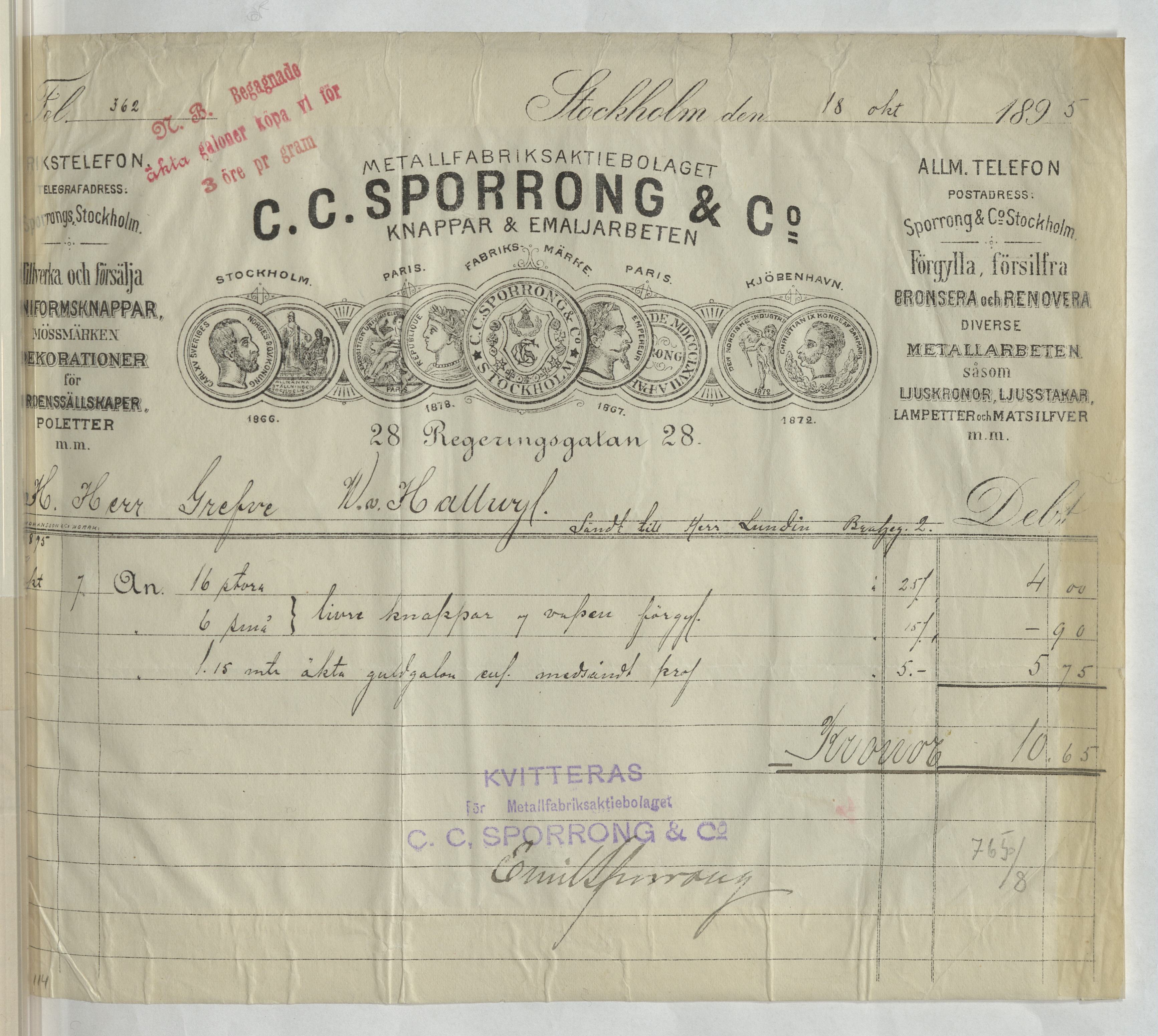Kvitto från C. C. Sporrong & Co. Gällande bland annat förgyllning av livréknappar. Stockholm, 1895.