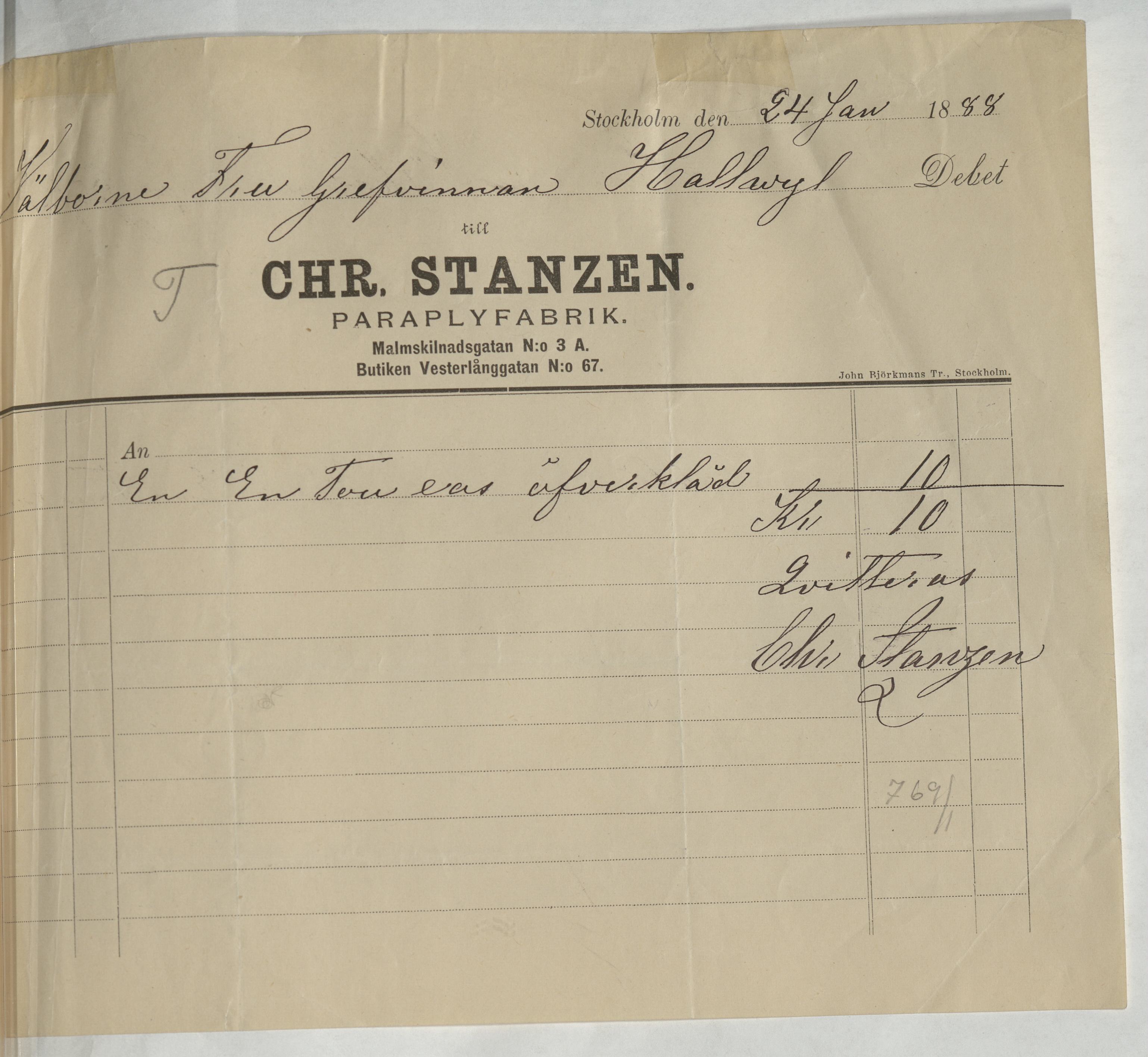 Kvitto från Chr. Stanzen Paraplyfabrik. Stockholm, 1888.