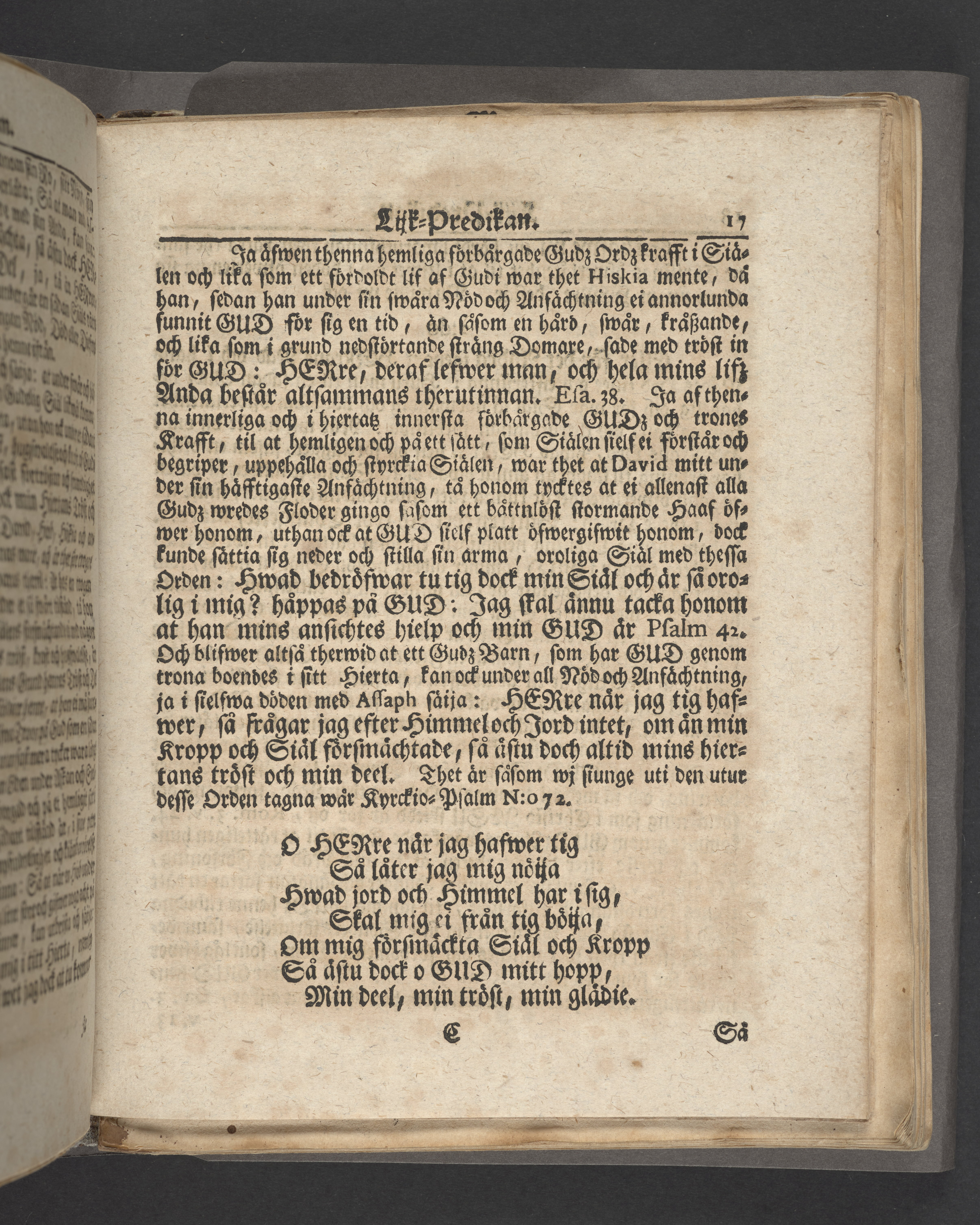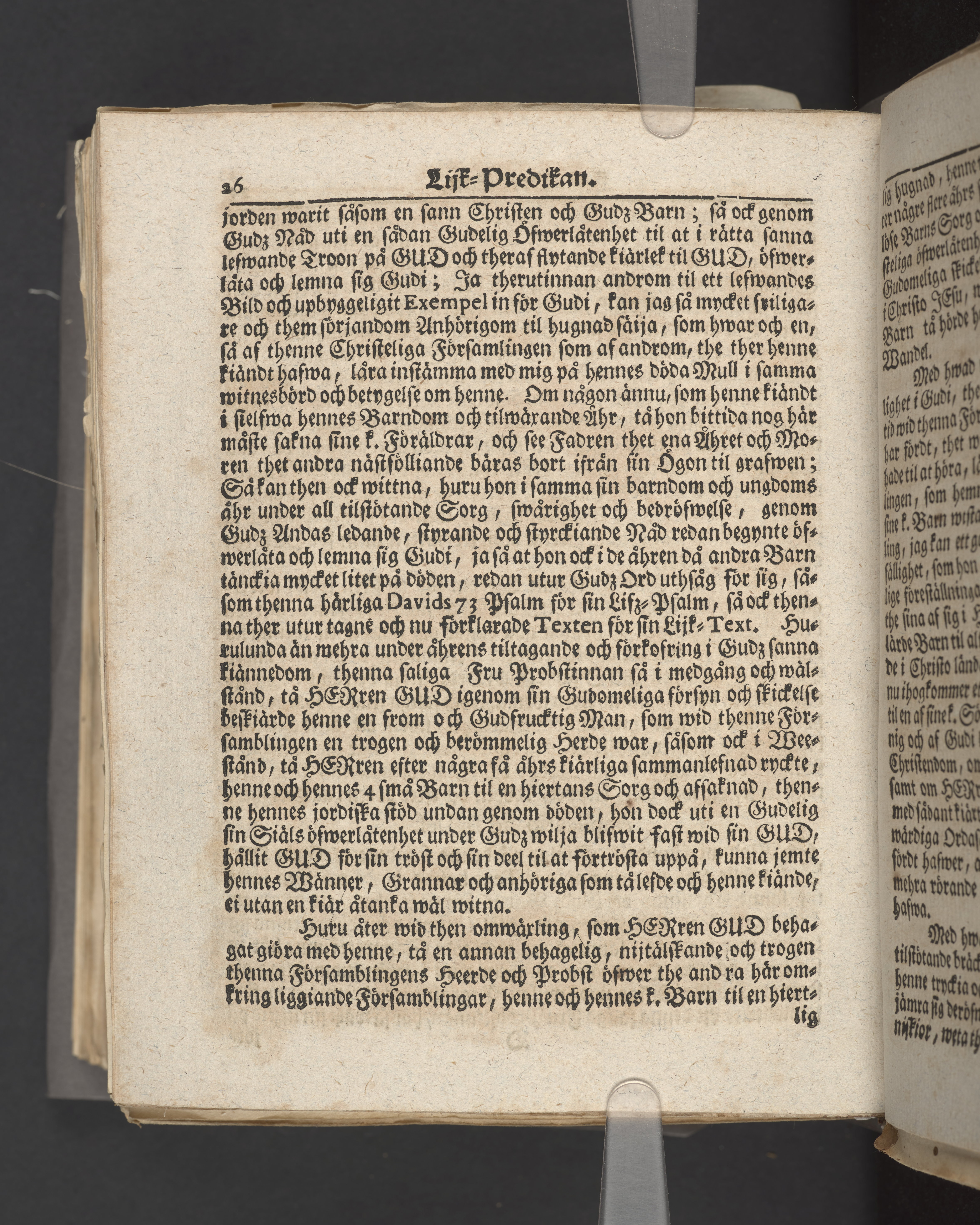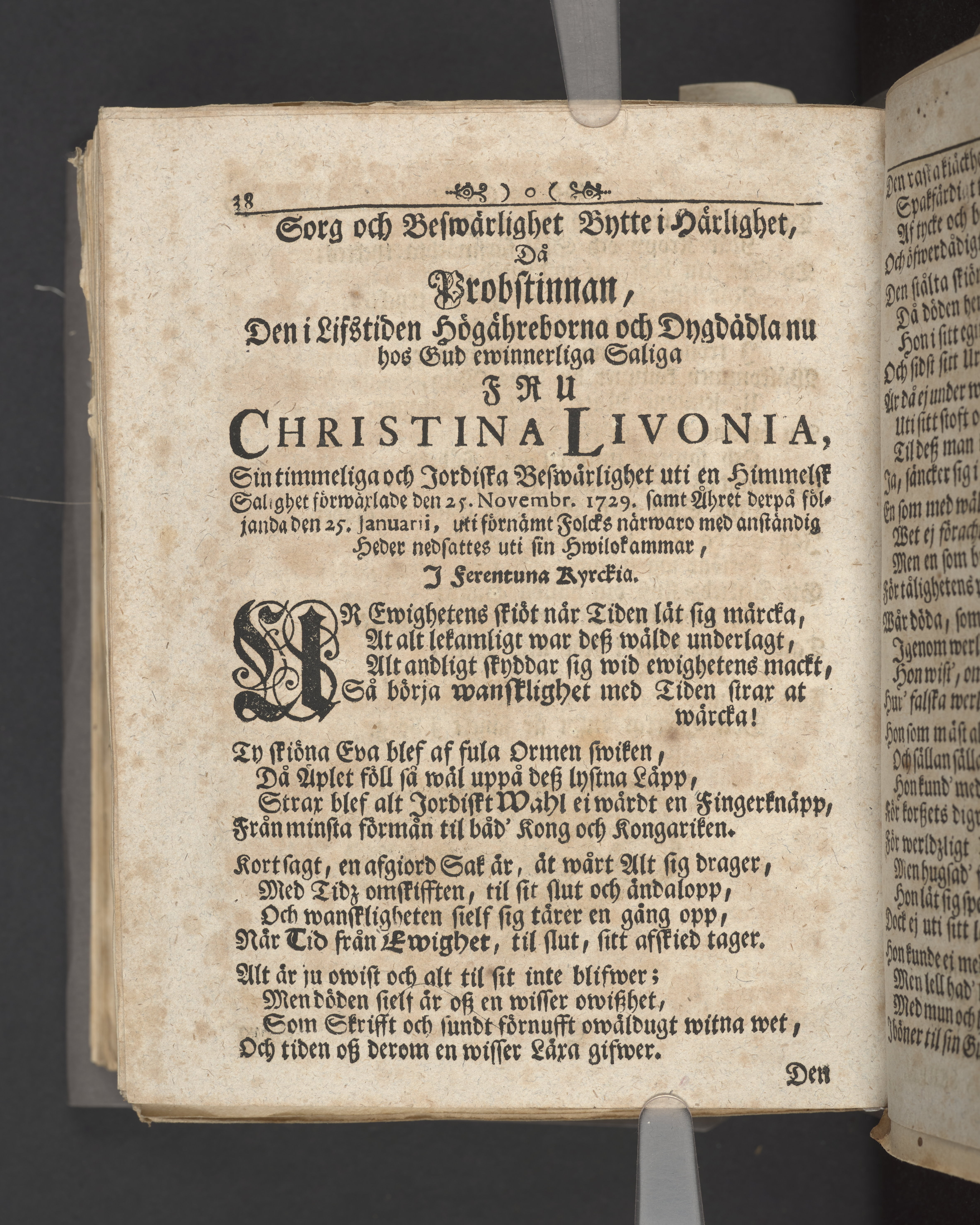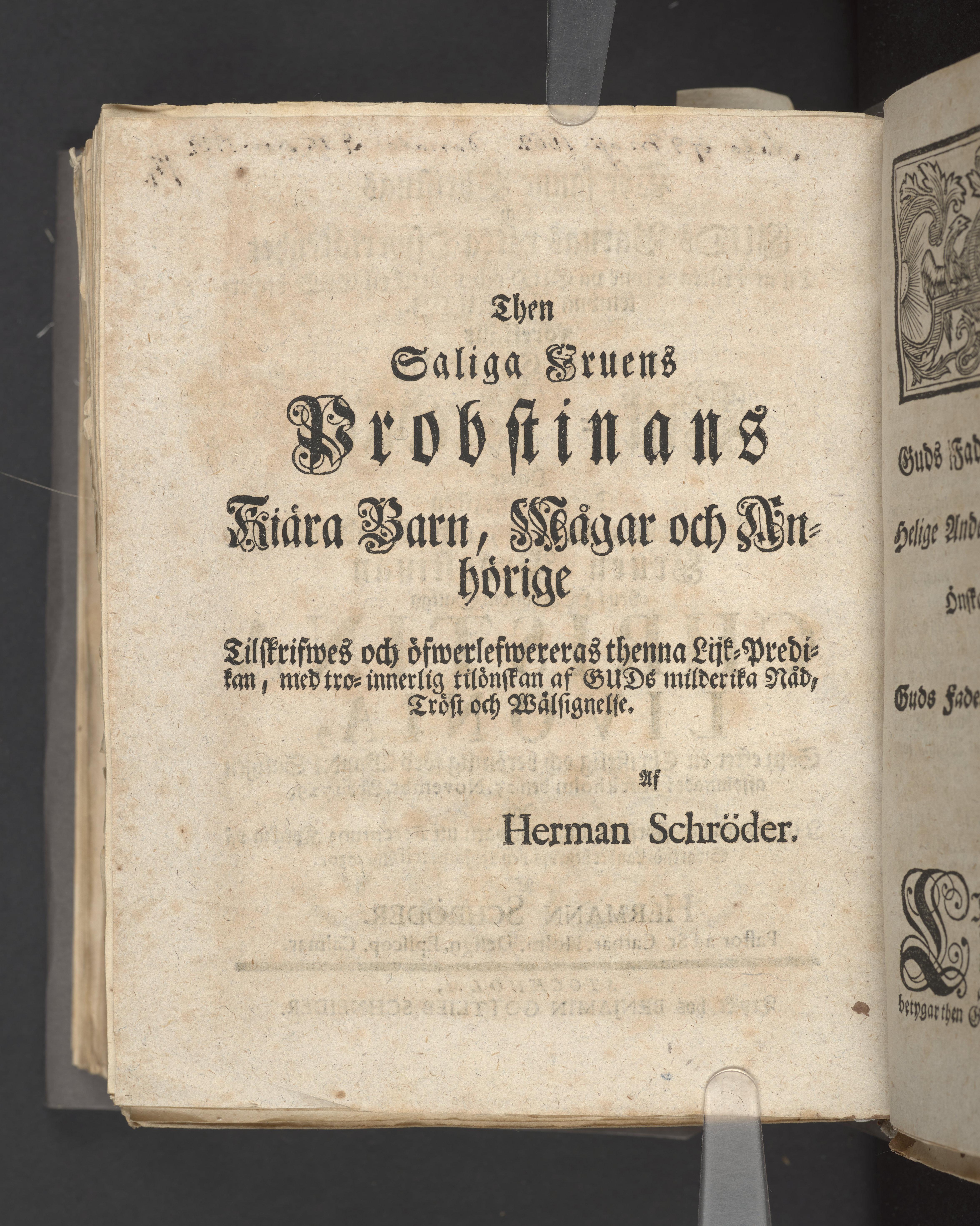 The sanne Christnas och Guds Barnas rätta Öfwerlåtenhet til at i rätta Trone på Gud och Kiärlek til Gud öfwerlembna sig Gudi. Föreställt uti en Christelig Lijk-Predikan öfwer then i Lifstiden Hög-Ehreborna, Gud, och Dygd-älskande Fruen Probstinnan Nu i Herranom Saliga Christina Livonia, Som efter en Christelig och berömlig förd Wandel Saligen afsomnade i Stockholm den 25. Novembr. Åhr 1729. Och I en hederwärd Församblings närwaru uti Ferentuna Kyrckia på Swartsiö-Landet begrofs den 25. Januarii Åhr 1730. Af Hermann Schröder. Pastor ad Cathar. Holm. Design. Episcop. Calmar. Stockholm, tryckt hos Benjamin Gottlieb Schneider.