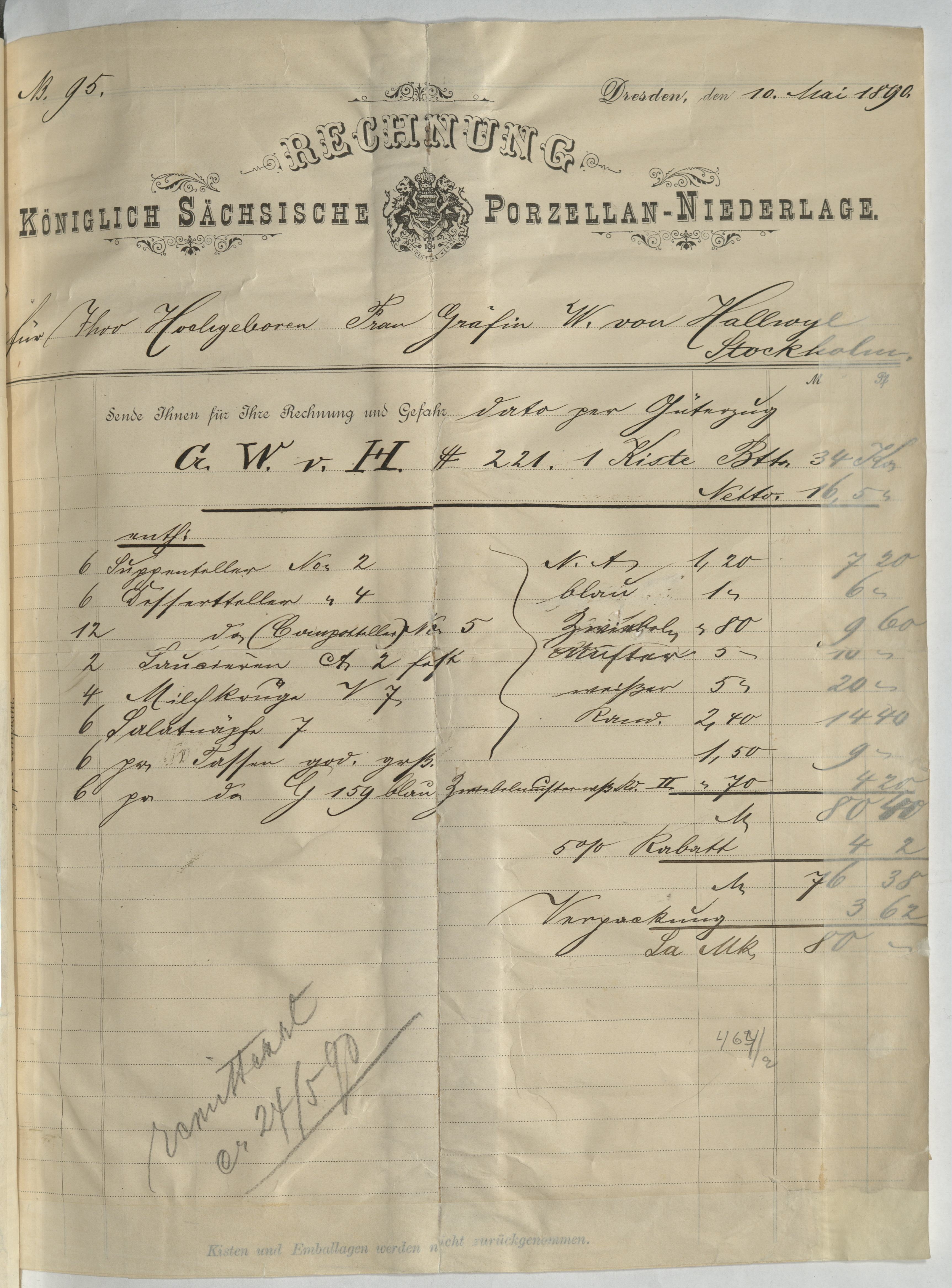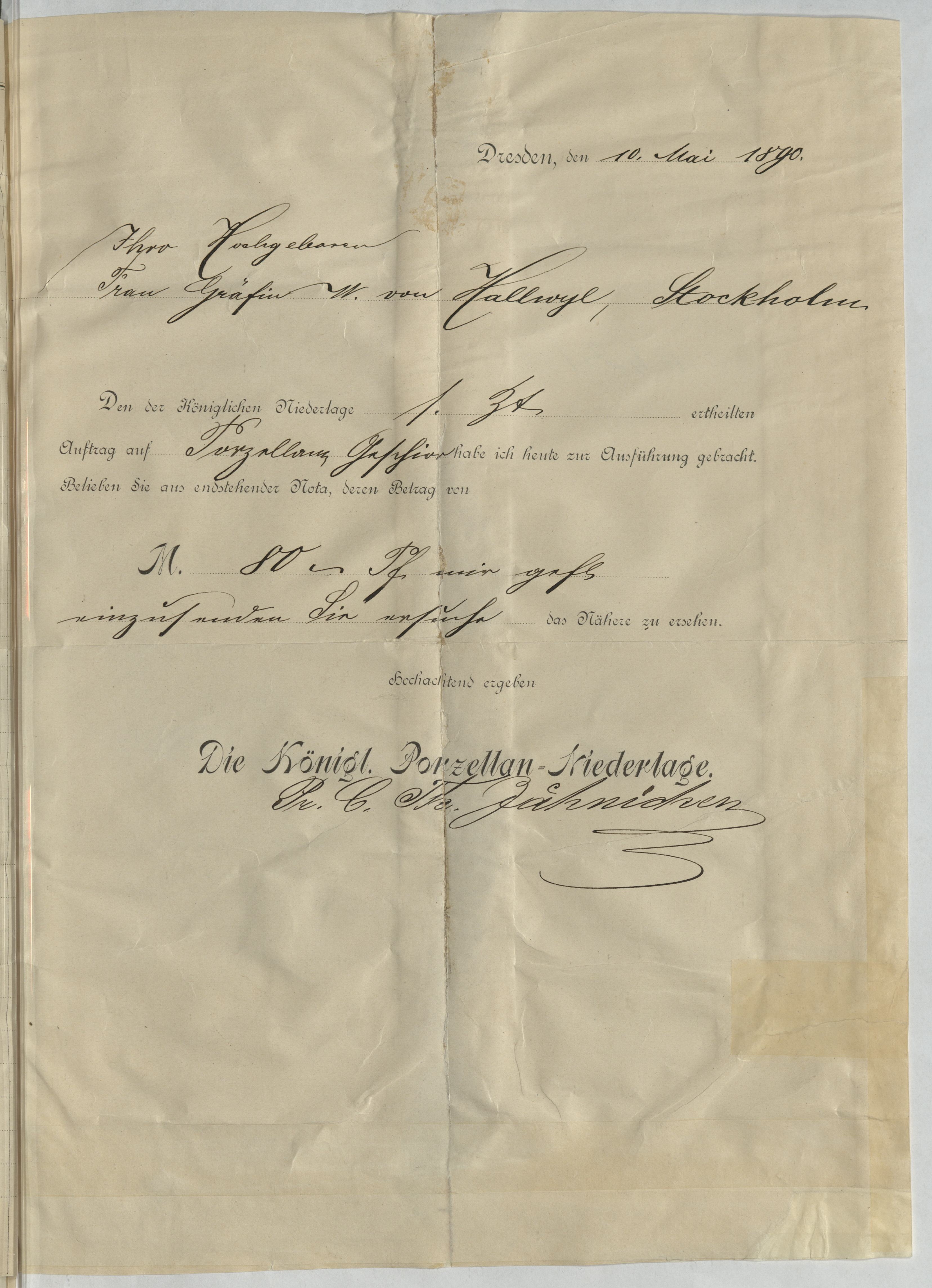 Kvitton och verifikationer från Königlich Sächsische Porzellan Niederlage. Dresden 1890.