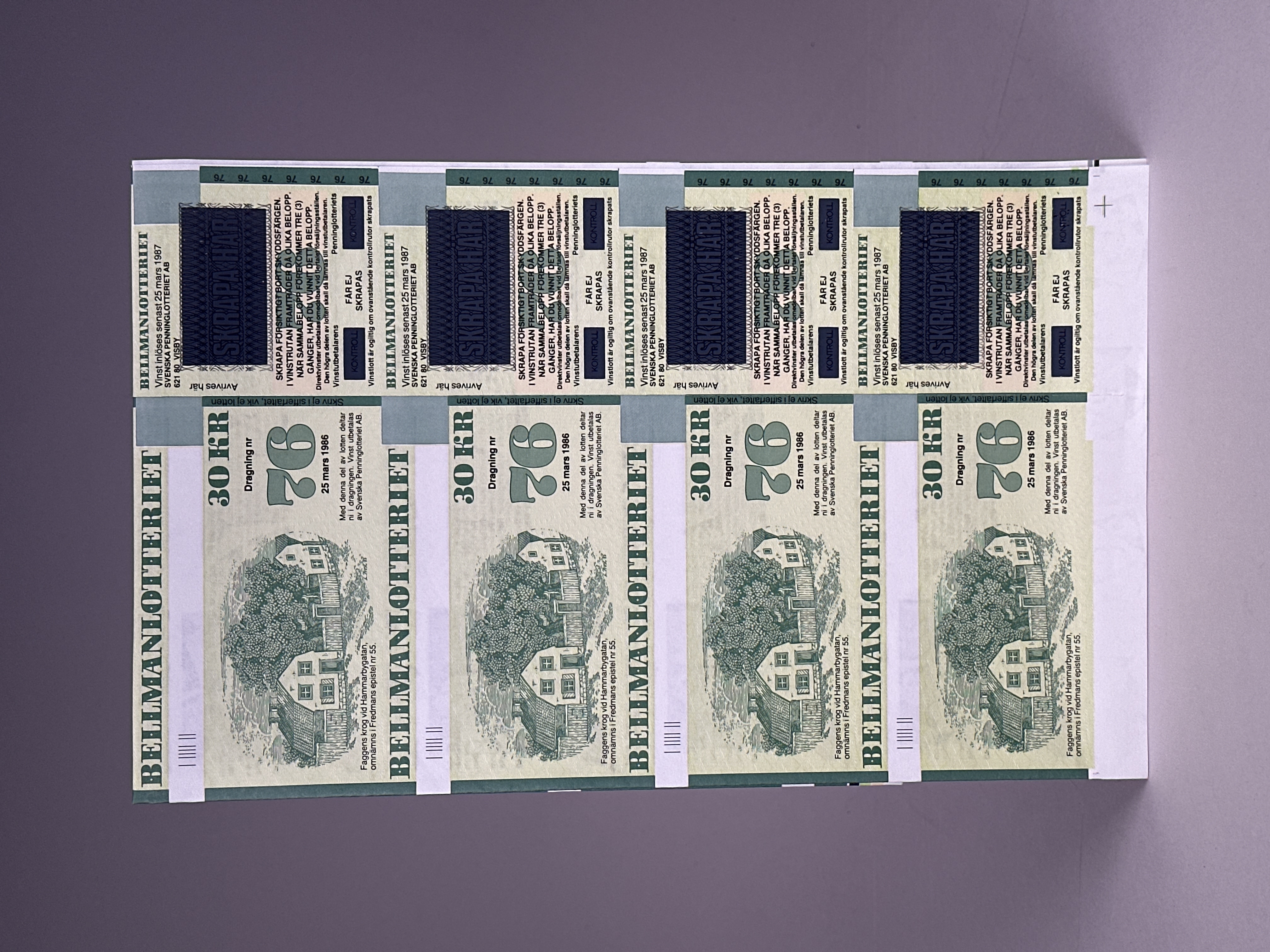 Detta pappersark tillhör en grupp prov- och arkivark som vid deposition från Riksbanken fanns i en stor trälåda innehållande Bellmanlotter med dragningsdatum 1984-1989 (alla år ej representerade, 41 st.). Inskription på lådan: "Riksbankens (från Tumba Bruks sedeltryckeri) deposition i KMK / 2002-12-12". |