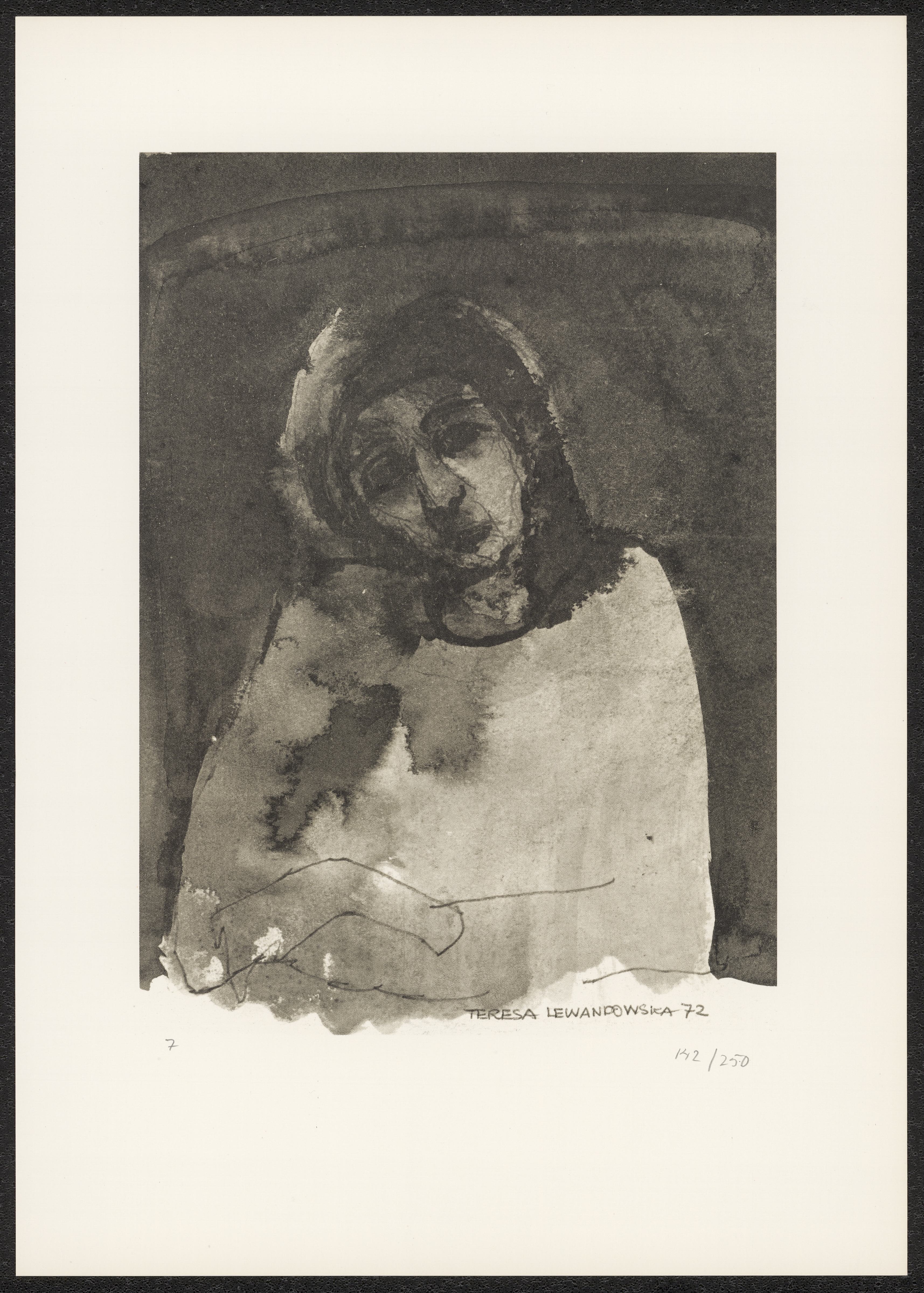 Grafiskt blad av Teresa Lewandowska, gjort för Amnesty International 1973. Konstverken speglar hennes erfarenheter av Förintelsen i Polen.