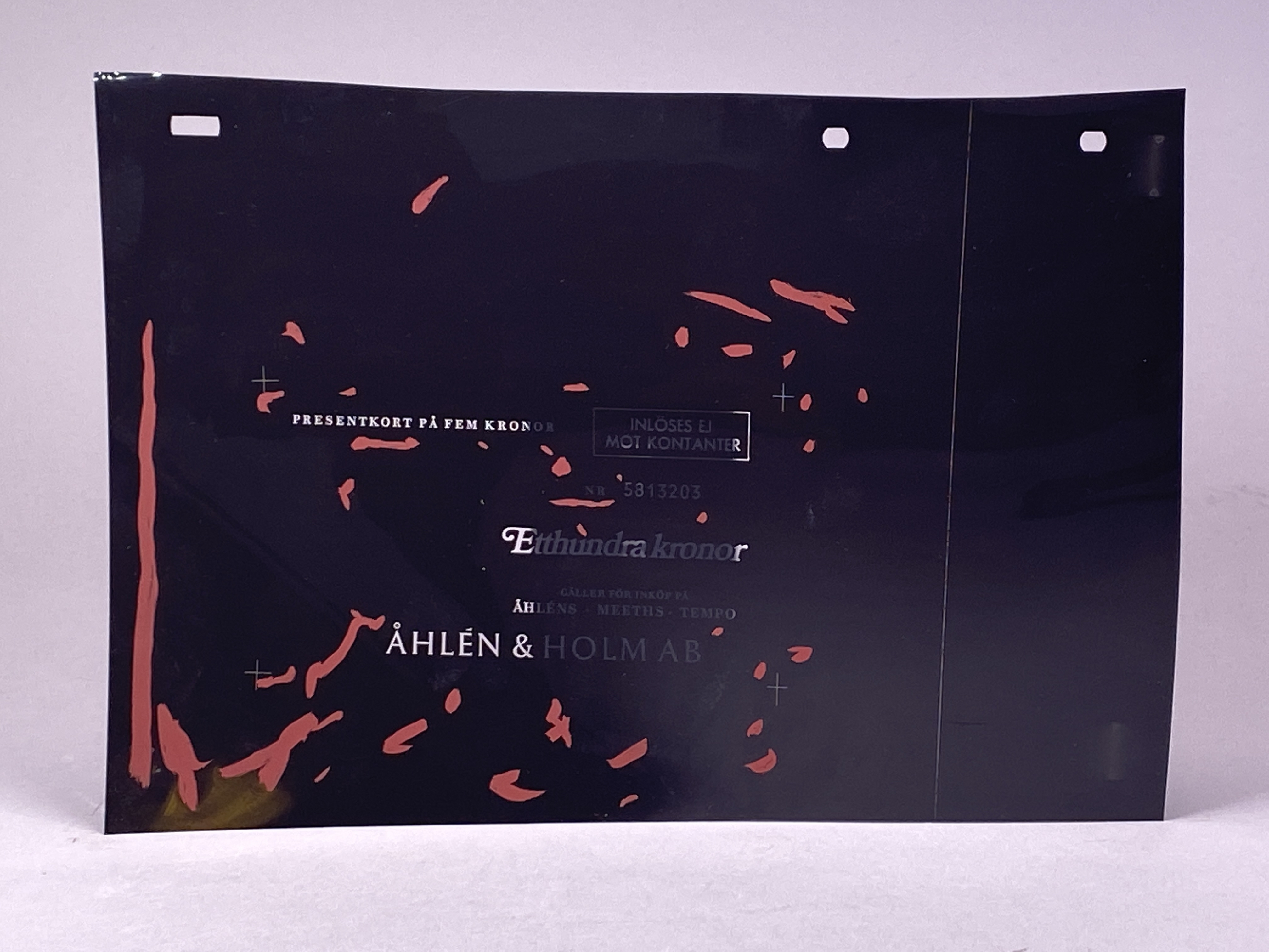 OH-film. Ett designförslag på presentkort (endast text) som gäller för inköp på Åhléns mm, nr 5813203. Inverterade färger: svart bakgrund och genomskinlig text. Rättelser/maskering på ytan i rött. Jfr. med slutprodukt 3145701.