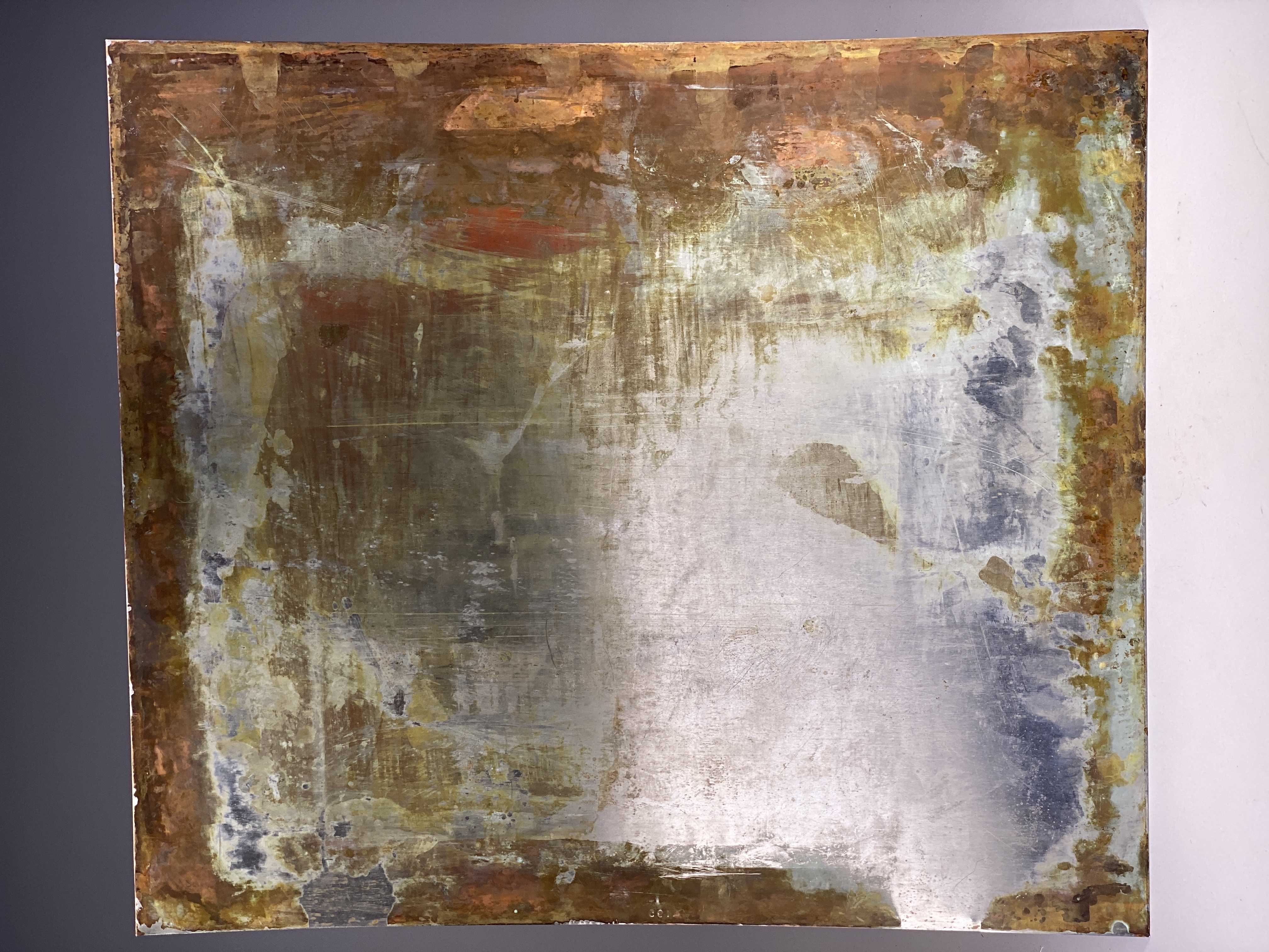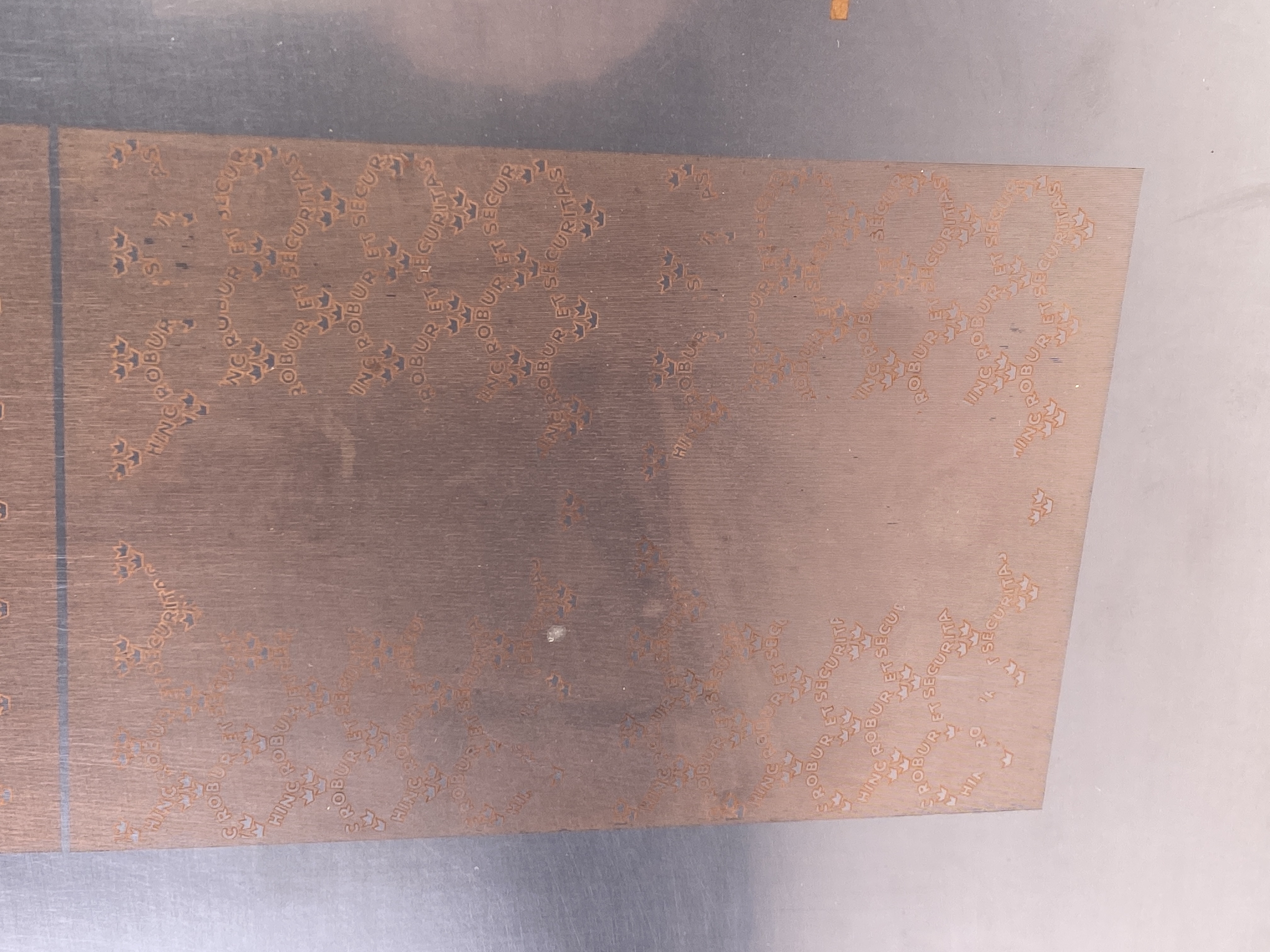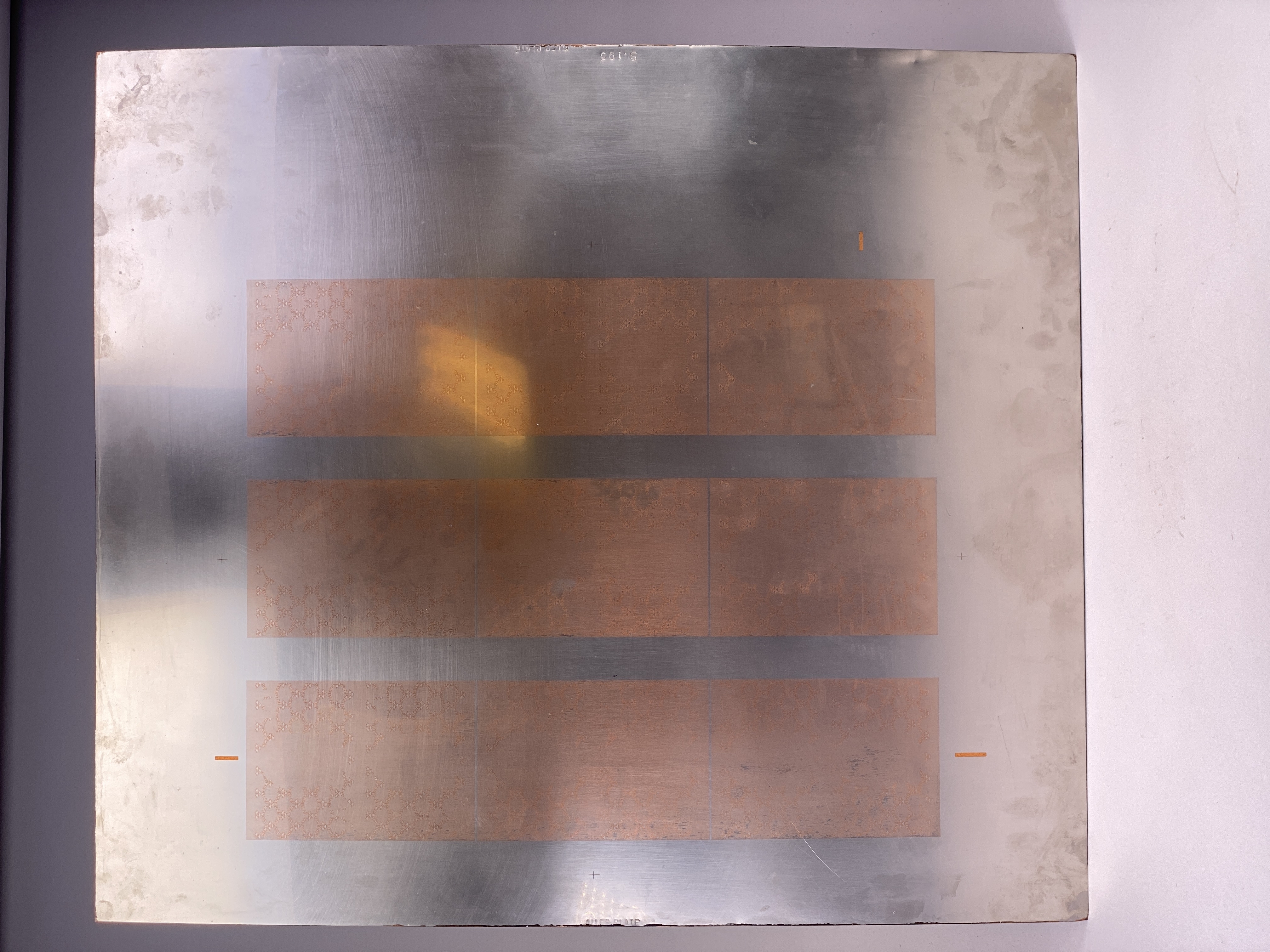 Tryckplåt av okänd funktion, möjligtvis för sedeltryck. Med tillhörande kuvert. Rektangulär plåt tillverkad rostfritt stål, delvis med överdrag i koppar. Framsidan med graverat upprepningsmönster föreställande tre kronor samt svenska Riksbankens valspråk: "Hinc robur et securitas". Plåten stämplad: "S.195".