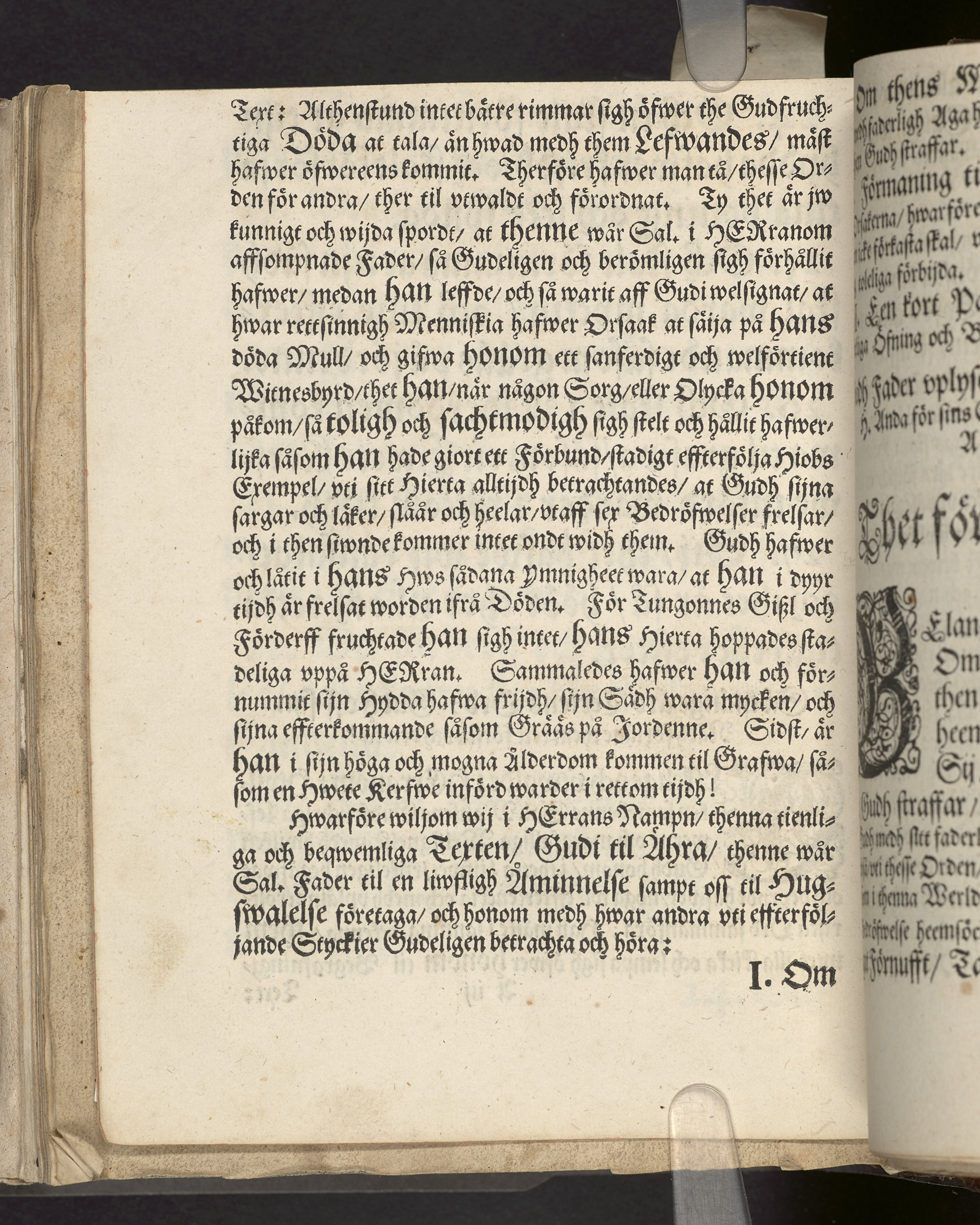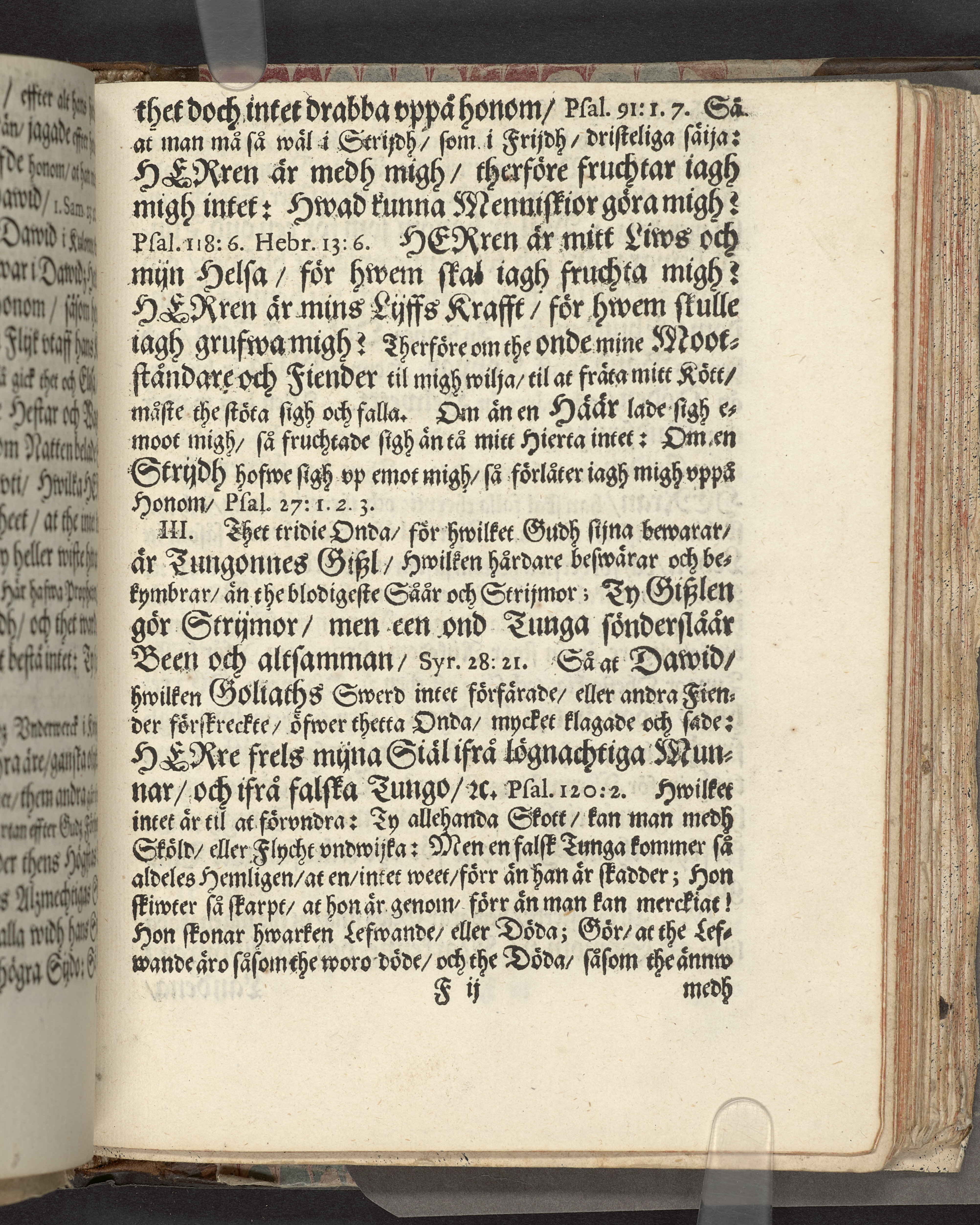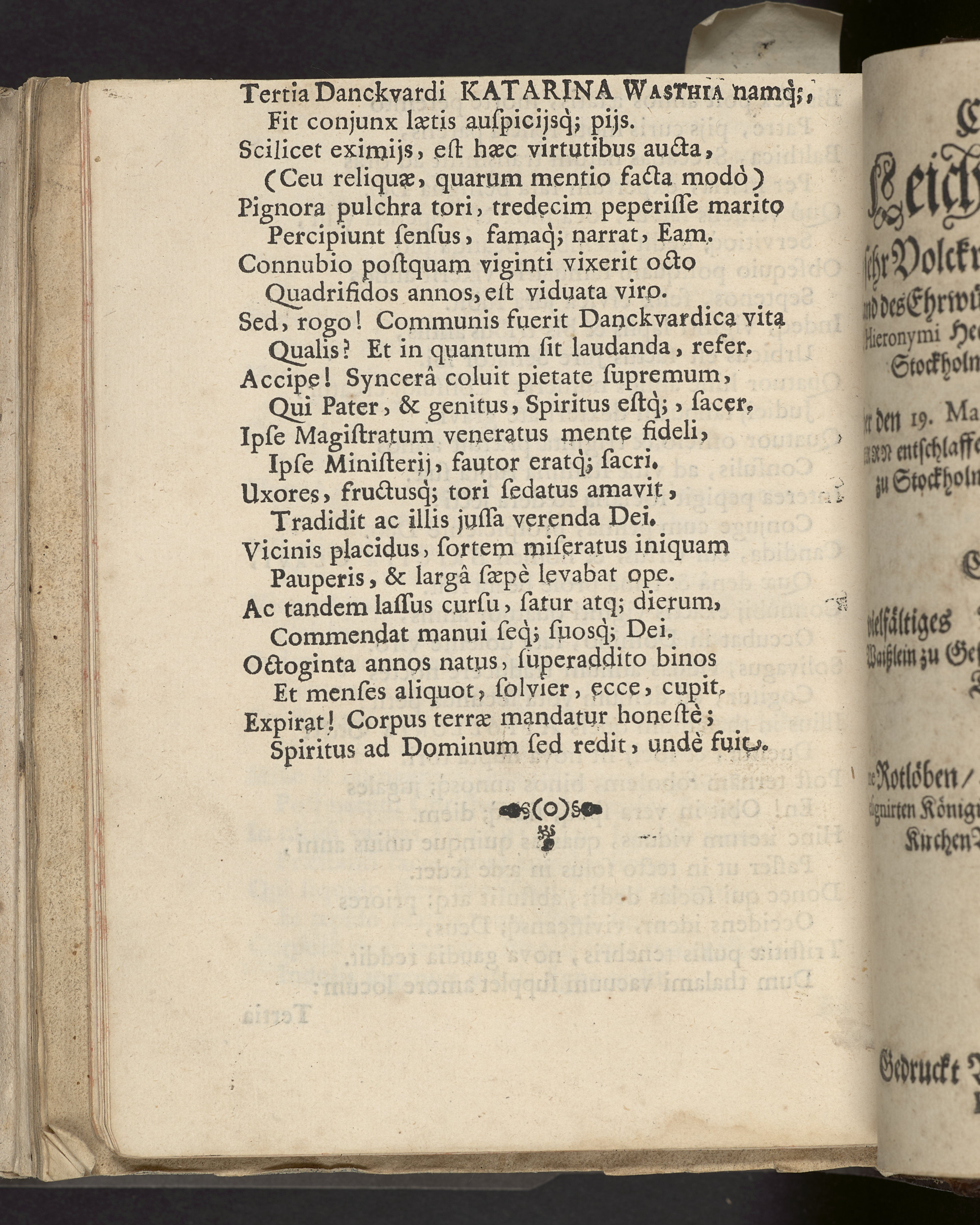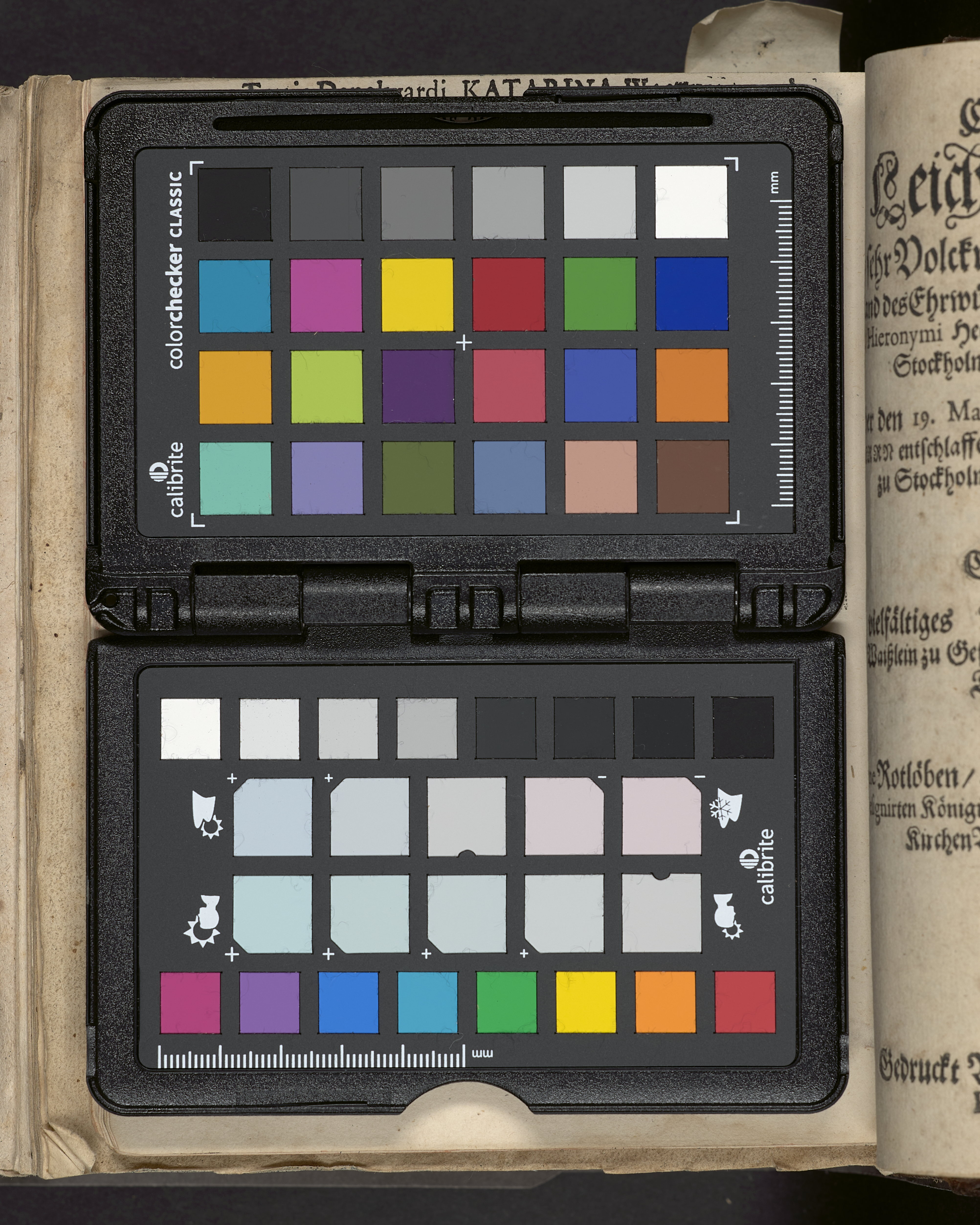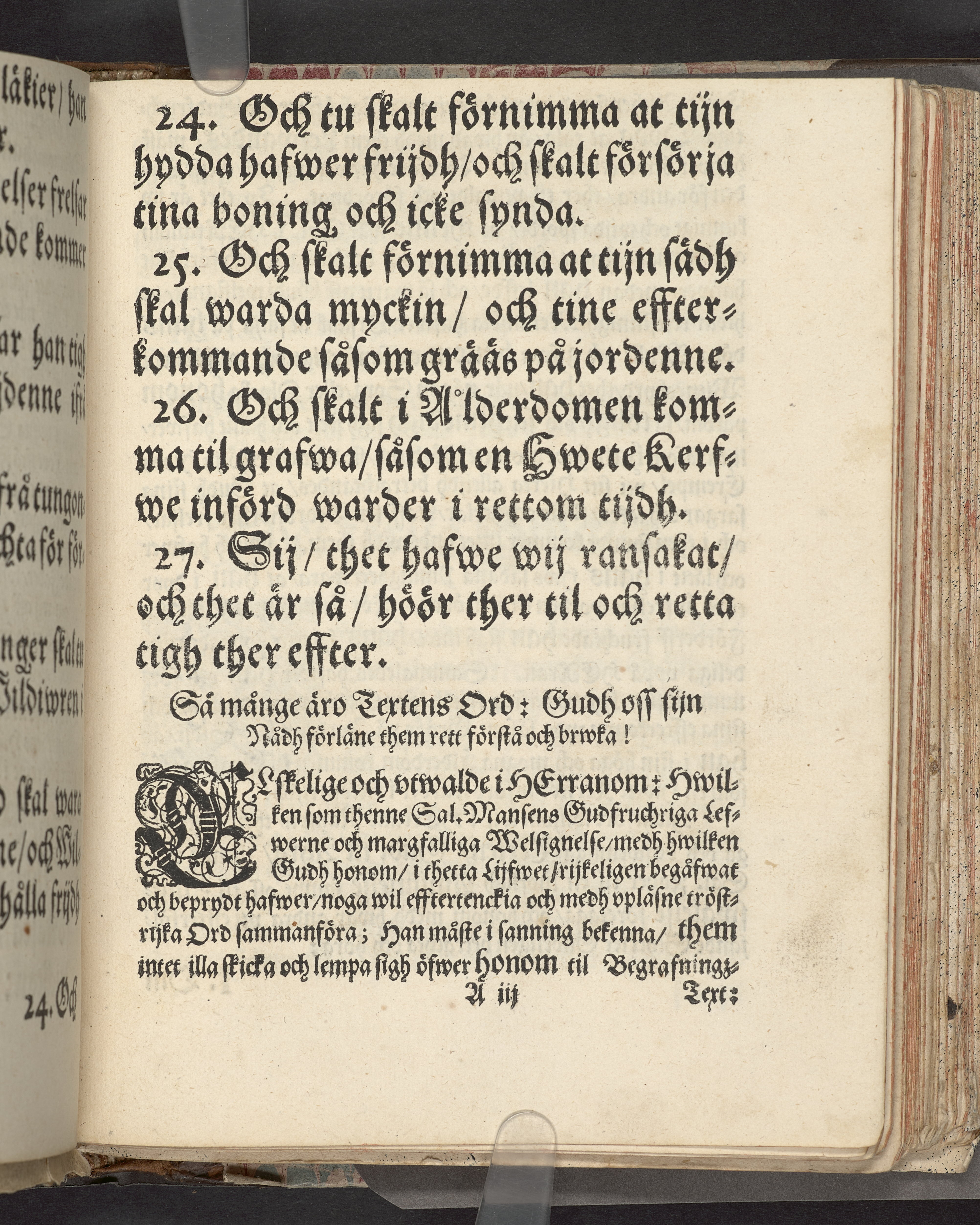 I sammelband med 26 tryck. Högst upp på titelsidan anteckning i bläck med uppgifter om födelse- och dödsdatum för den avlidna. Övre och nedre snitten stänkta i blått. På främre snittet ursprunglig röd färg.