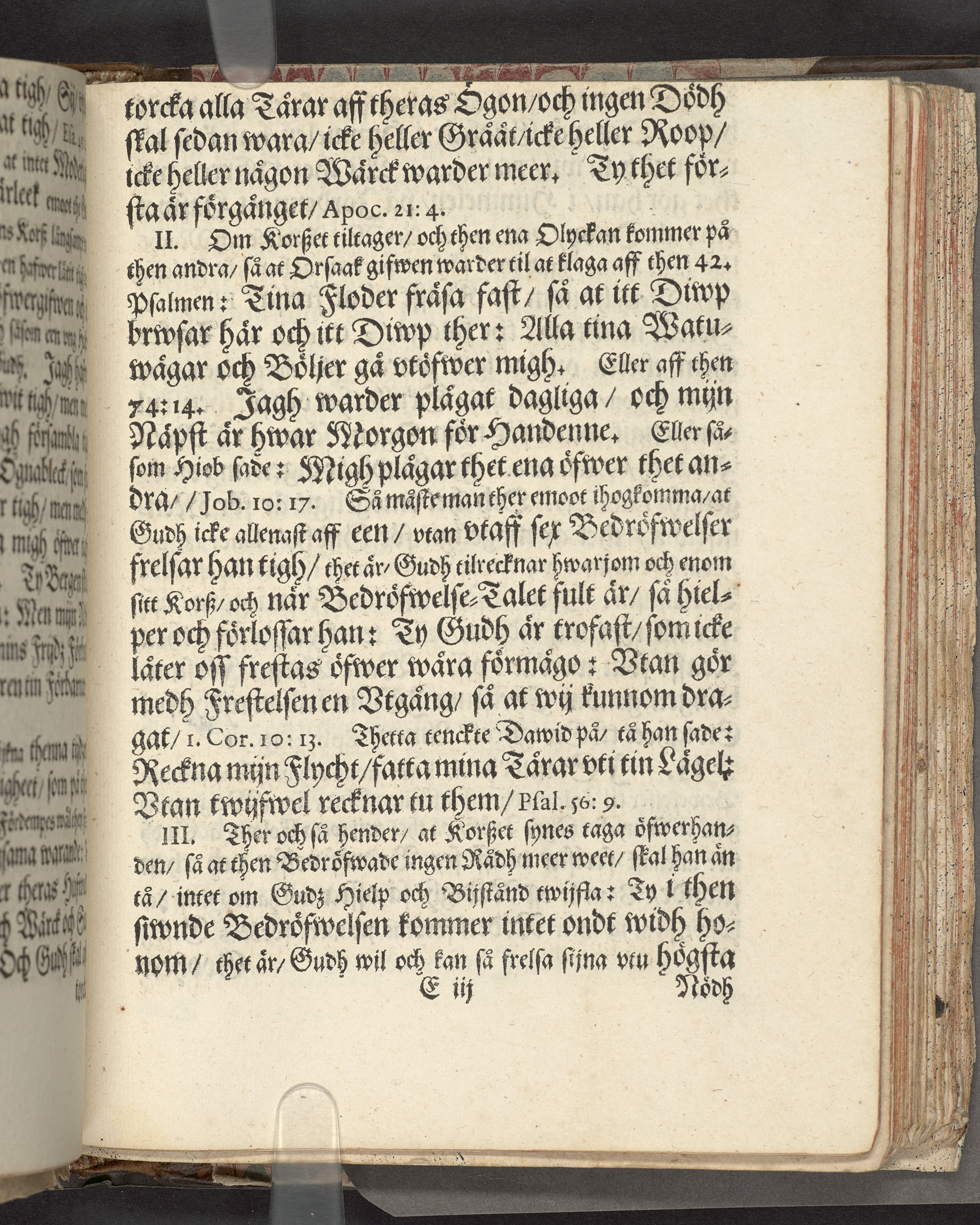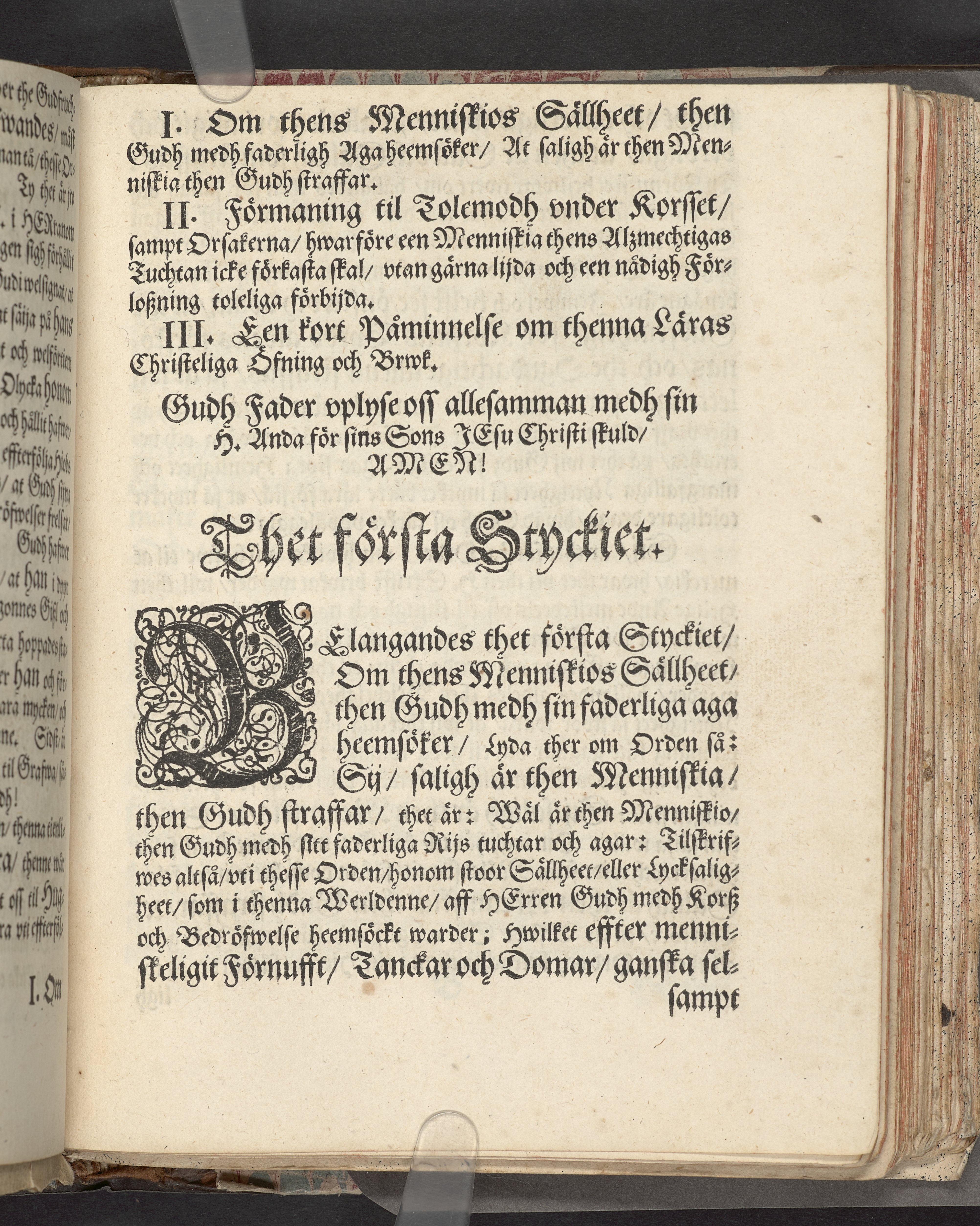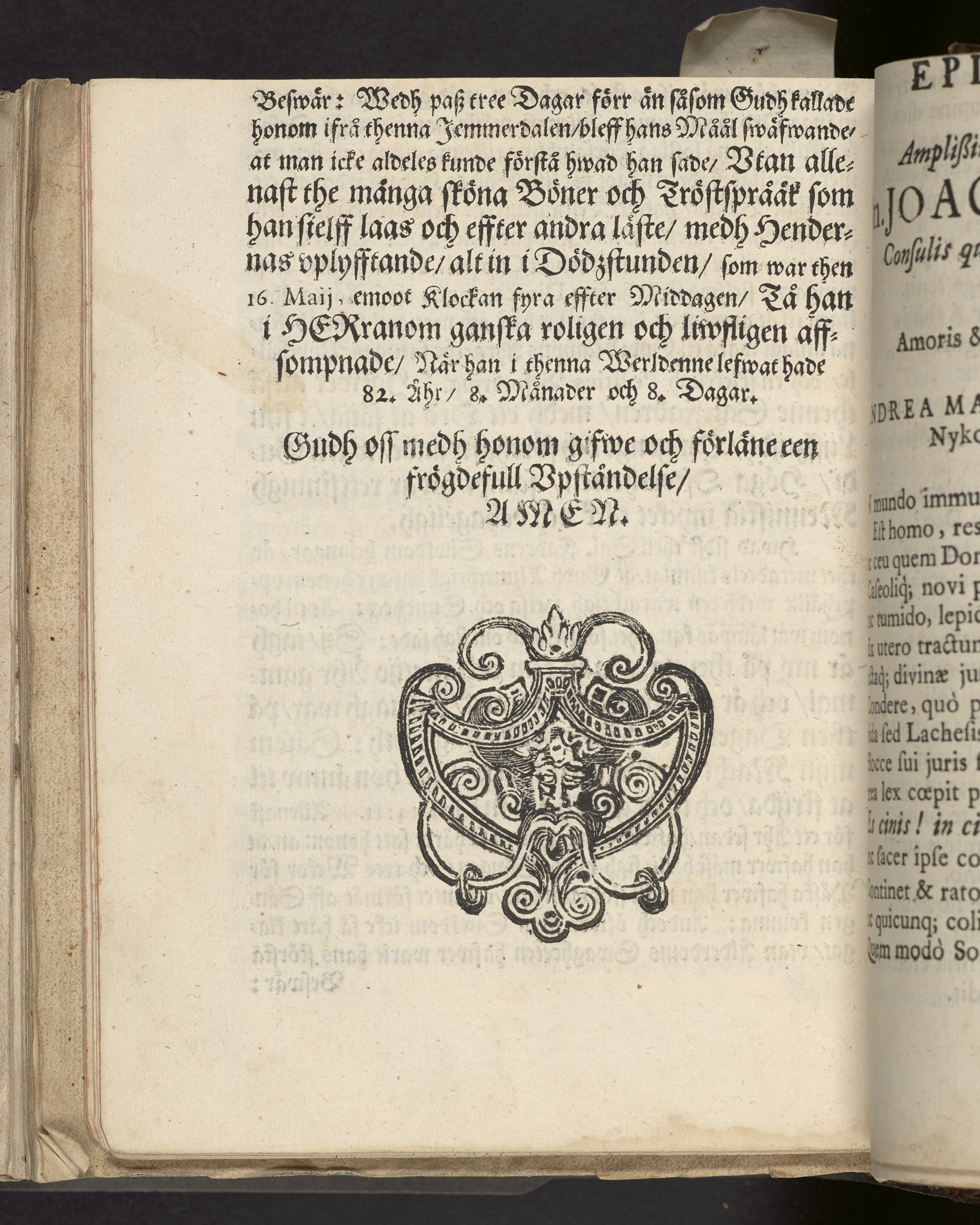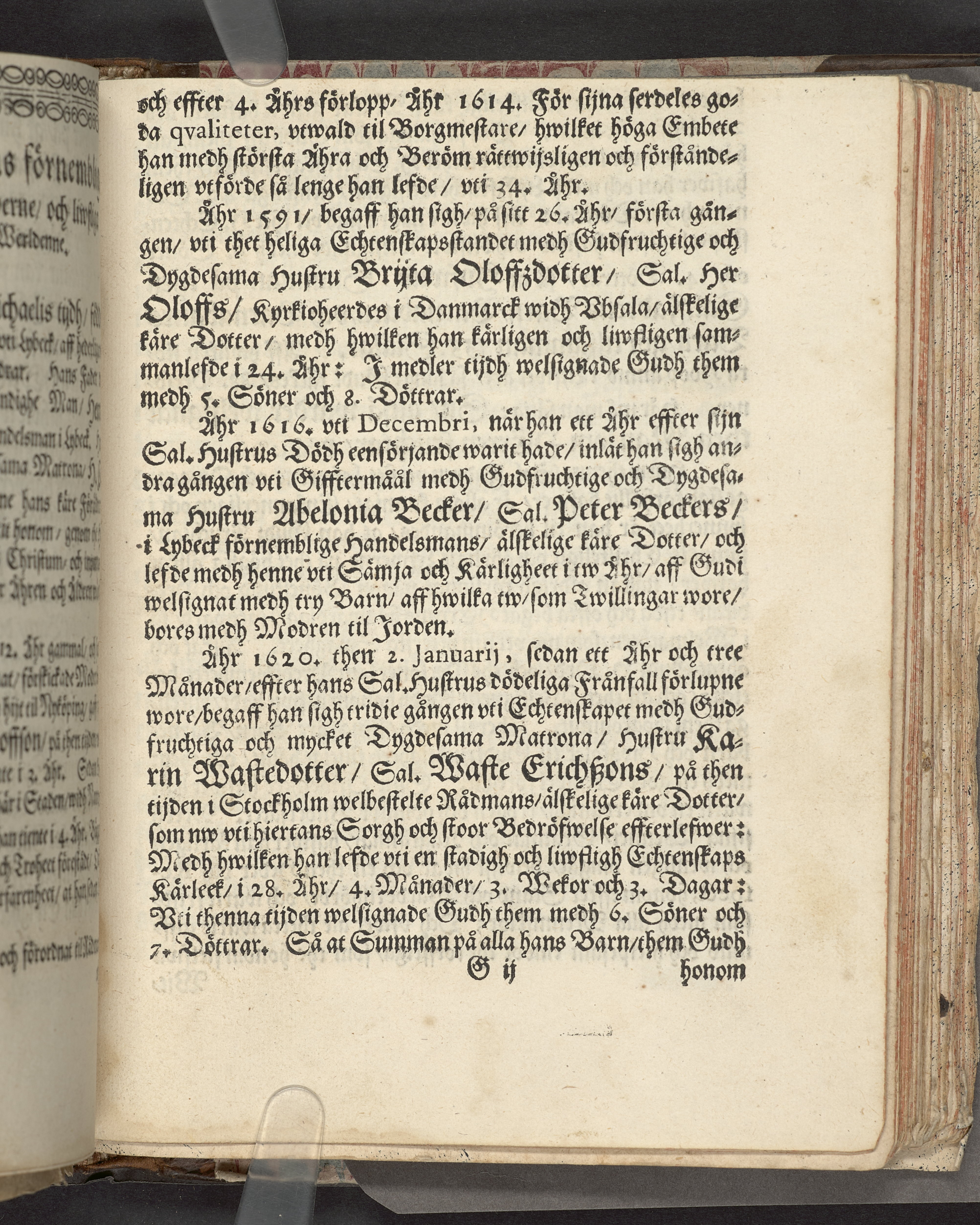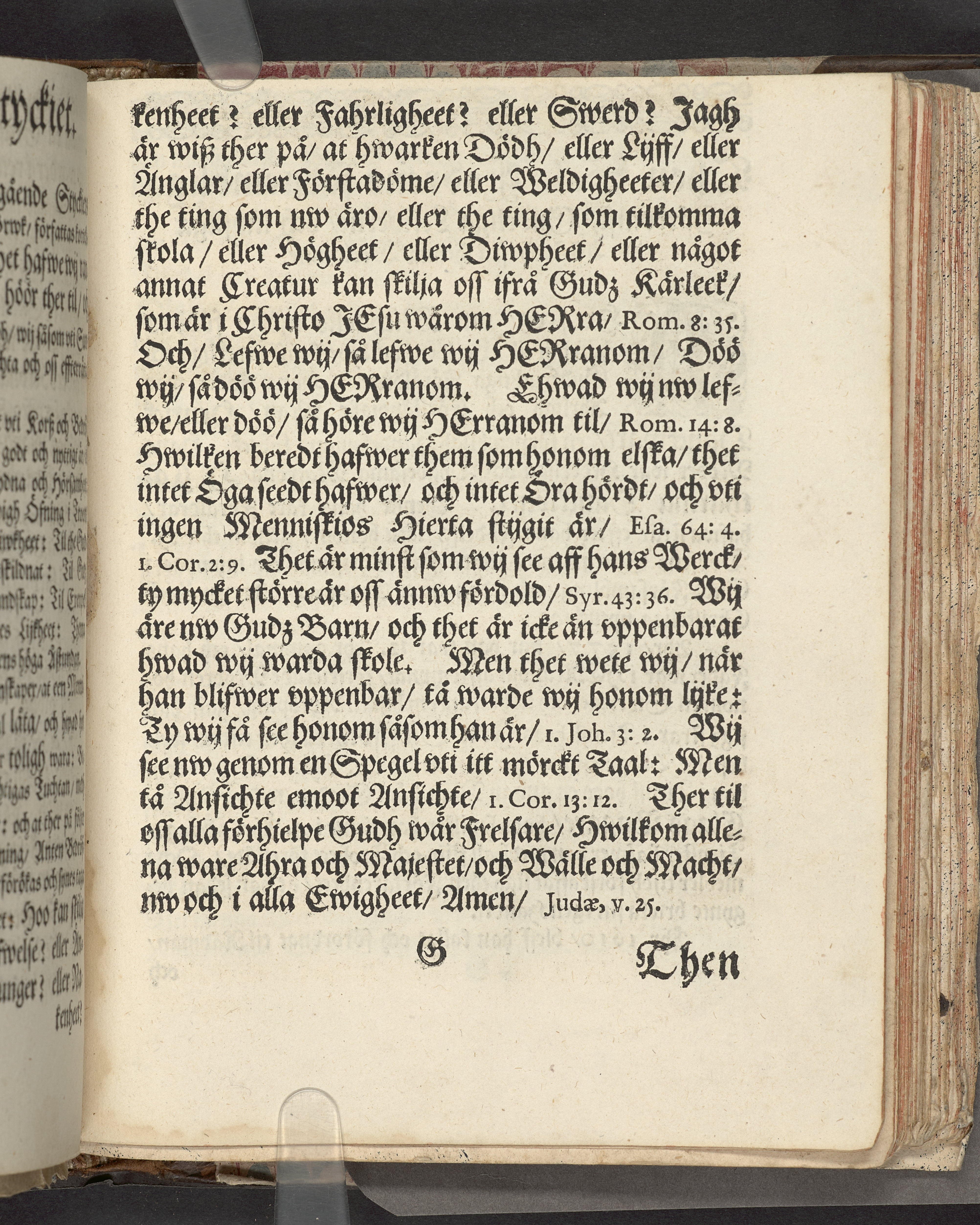 I sammelband med 26 tryck. Högst upp på titelsidan anteckning i bläck med uppgifter om födelse- och dödsdatum för den avlidna. Övre och nedre snitten stänkta i blått. På främre snittet ursprunglig röd färg.