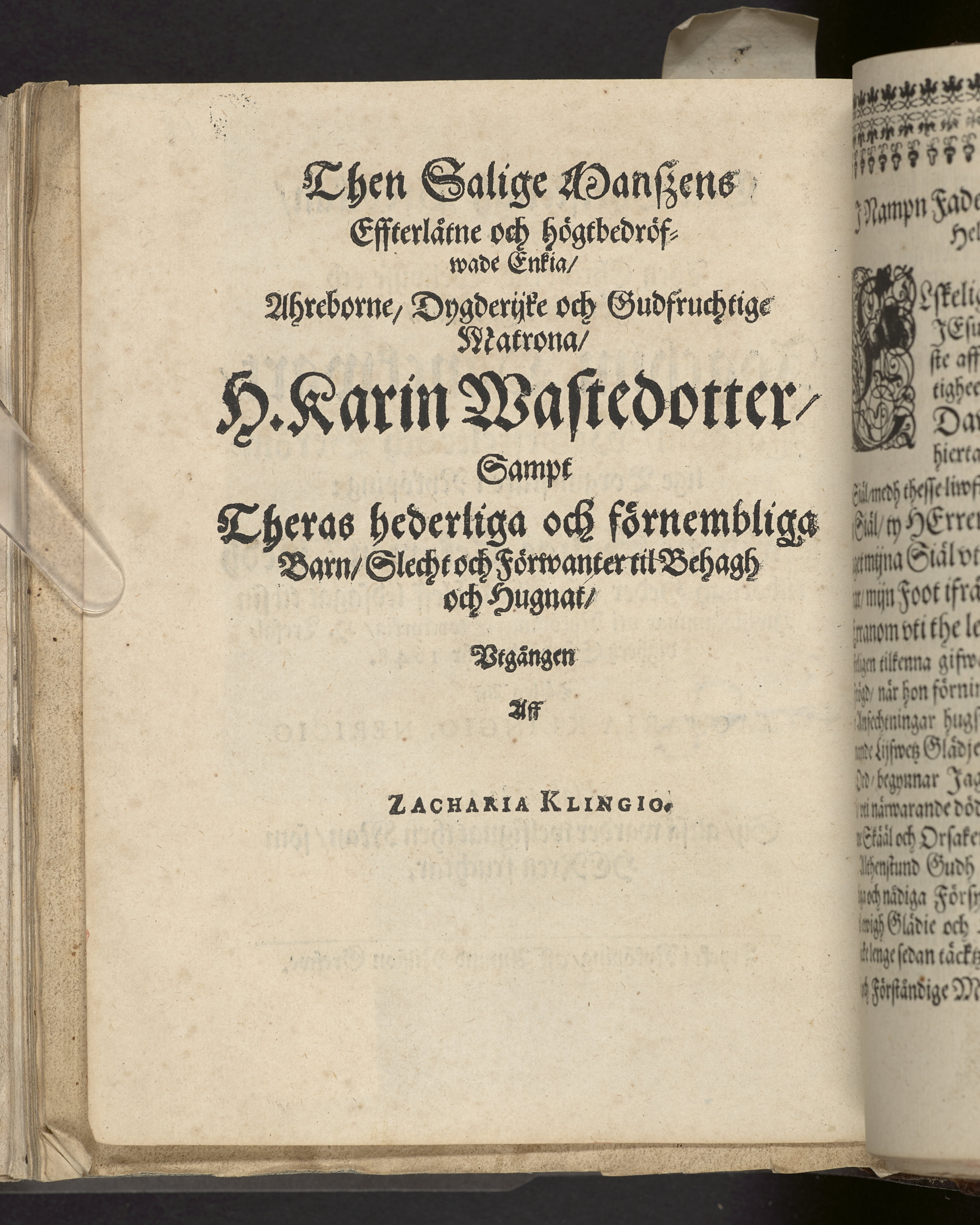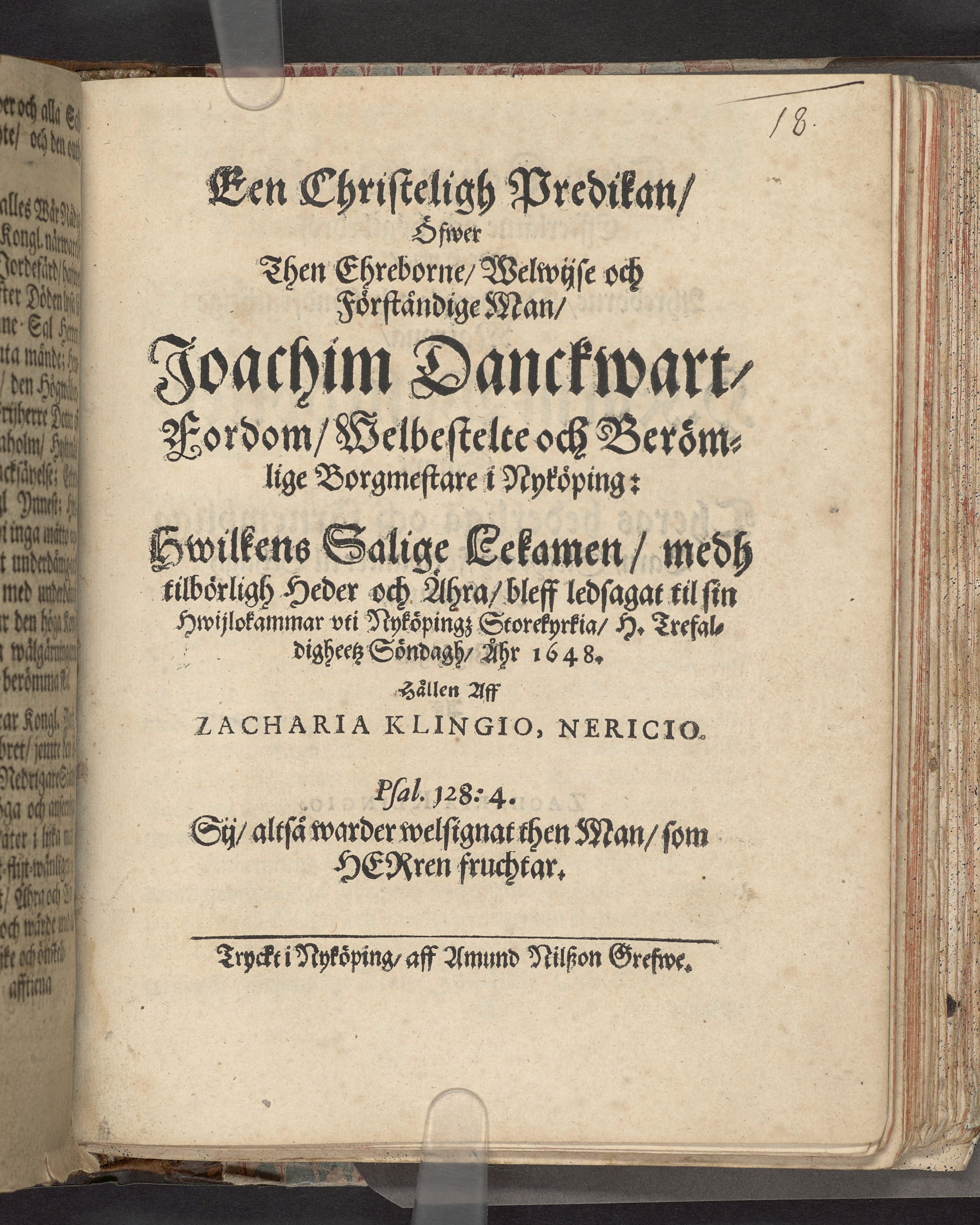 Een christeligh predikan, öfwer then ehreborne, welwijse och förståndige man, Joachim Danckwart, fordom, welbestelte och berömlige borgmästare i Nyköping: hwilkens salige lekamen, medh tilbörligh heder och ähra, bleff ledsagat til sin hwijlokammar vti Nyköpingz storkyrkia, h. trefaldigheetz söndag, åhr 1648. Hållen aff Zacharia Klingio, nericion. Psal. 128:4. Sij, altså wardwer welsignat thenman, som herren fruchtar.Tryckt i Nyköping, aff Amund grefwe.