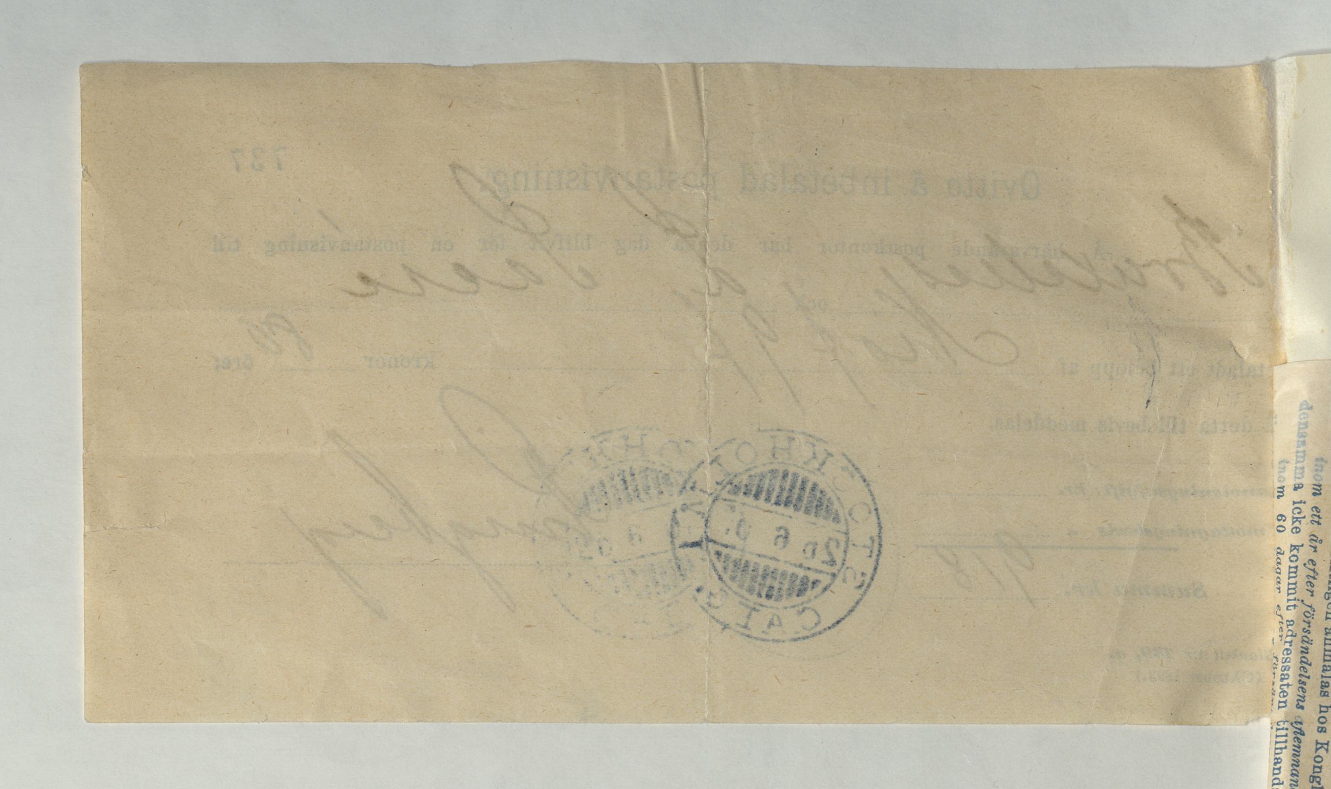 Kvitto på inlämnad assurerad postförsändelse till Léon Sacré, Manufactures de Dentelles, Bruxelles från Stockholm, med en totalsumma på 3000Kr. Stockholm, 1898.
