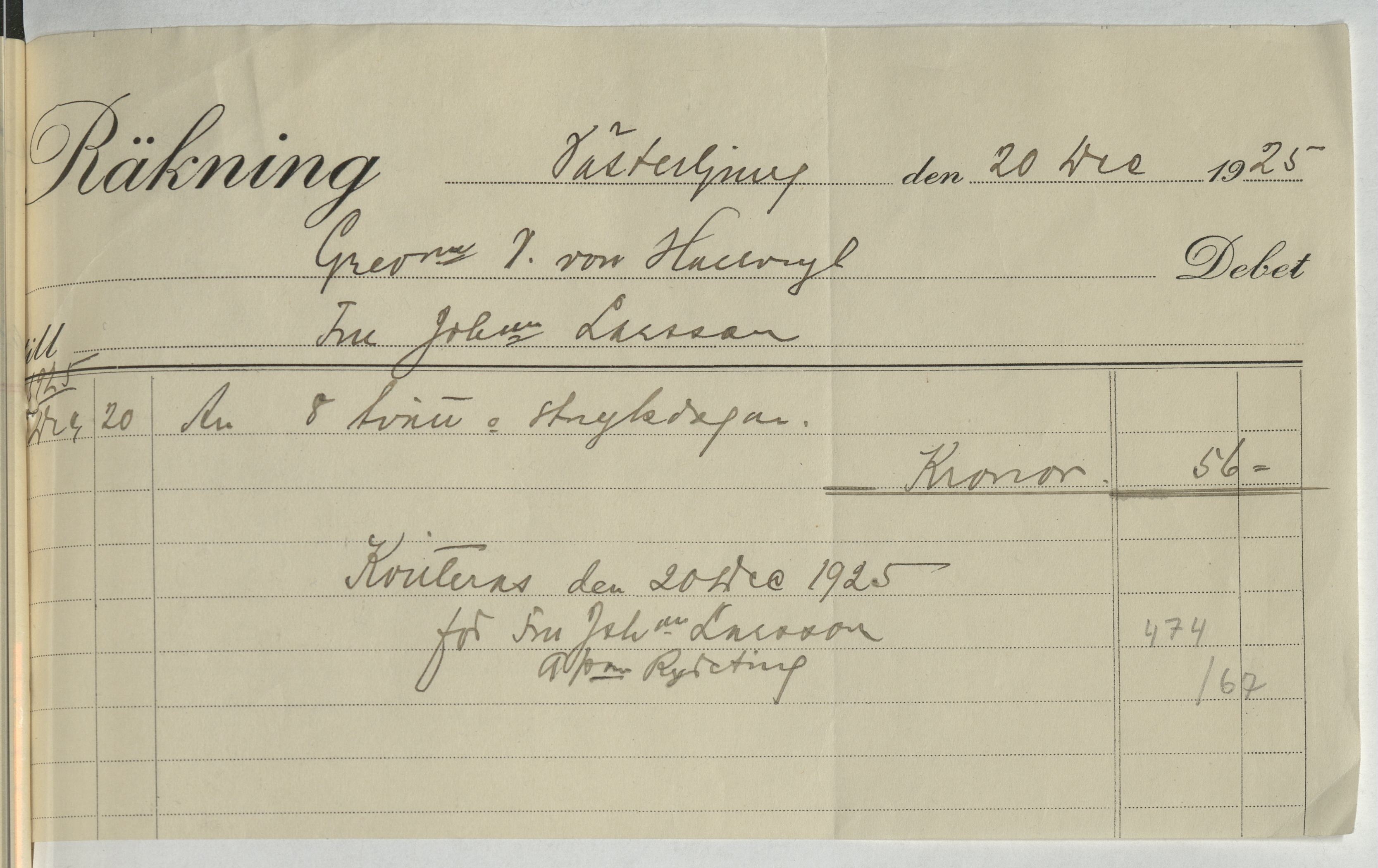 Kvitto från Johanna Larsson i Västerljung. Gällande 8 tvätt- och strykdagar. Västerljung, 1925.