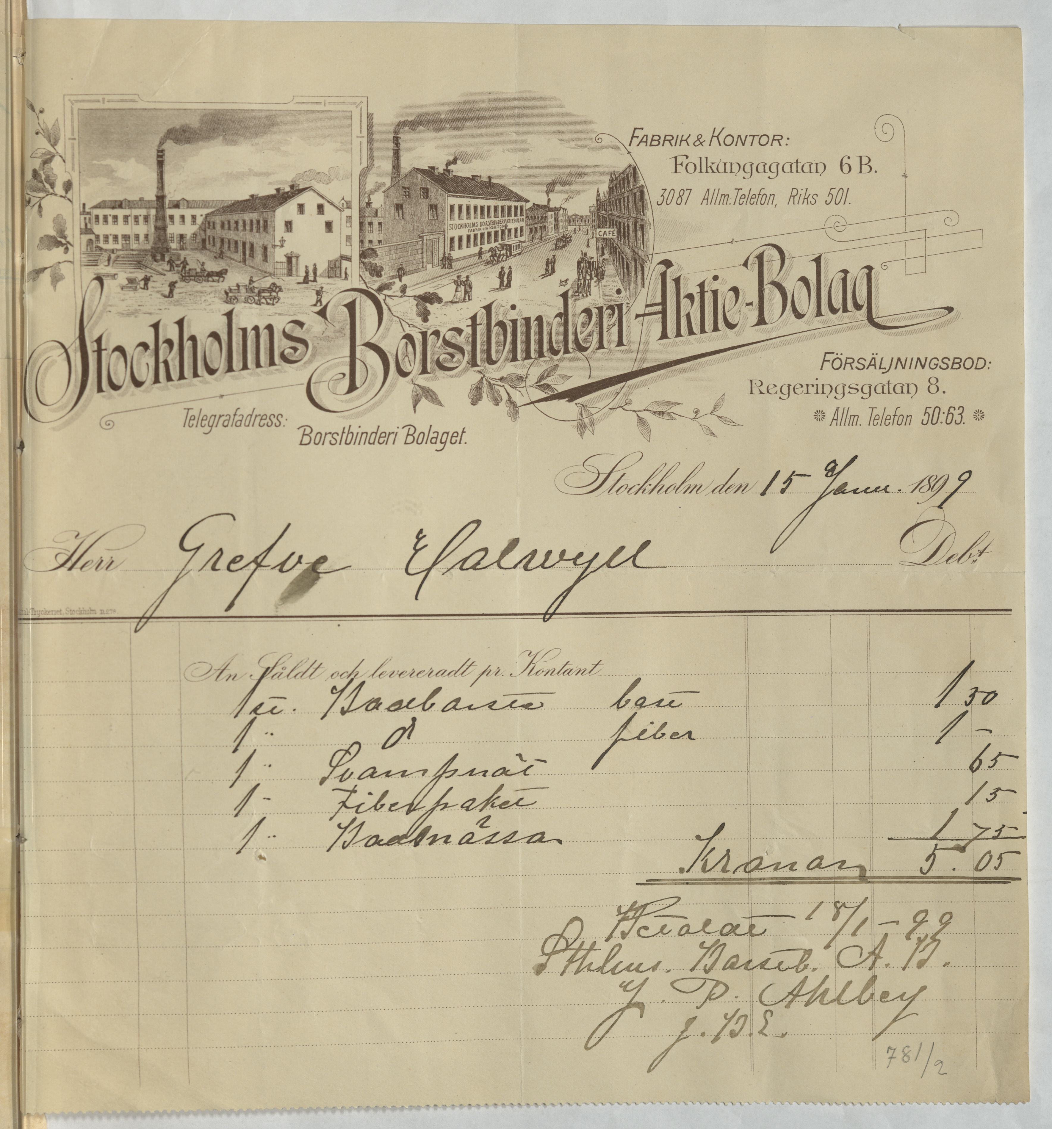 Kvitto från Stockholms Borsbinderi Aktiebolag. Stockholm, 1899.
