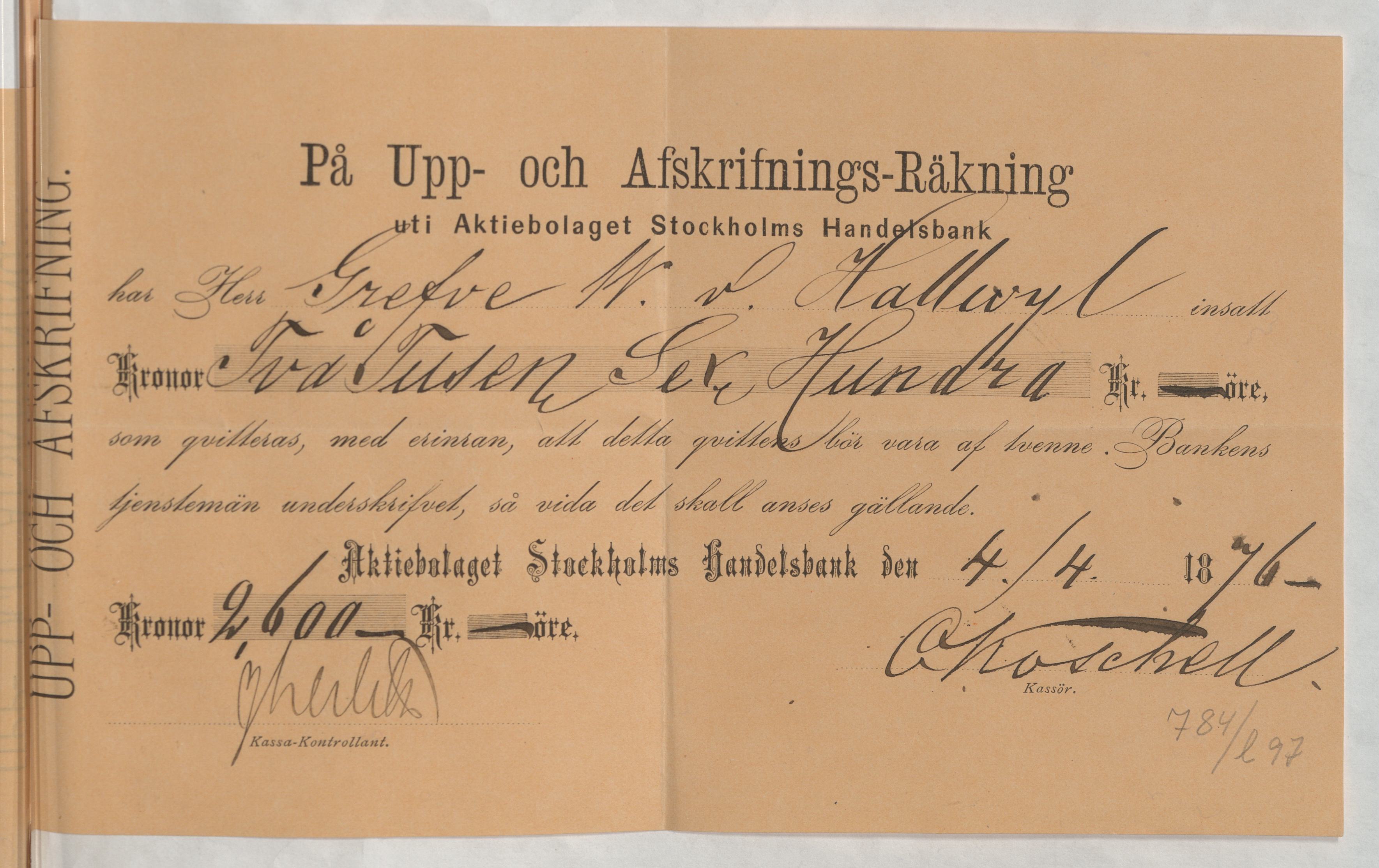 Kvitto från Aktiebolaget Stockholms Handelsbank rörande Upp- och Afskrifnings-Räkning