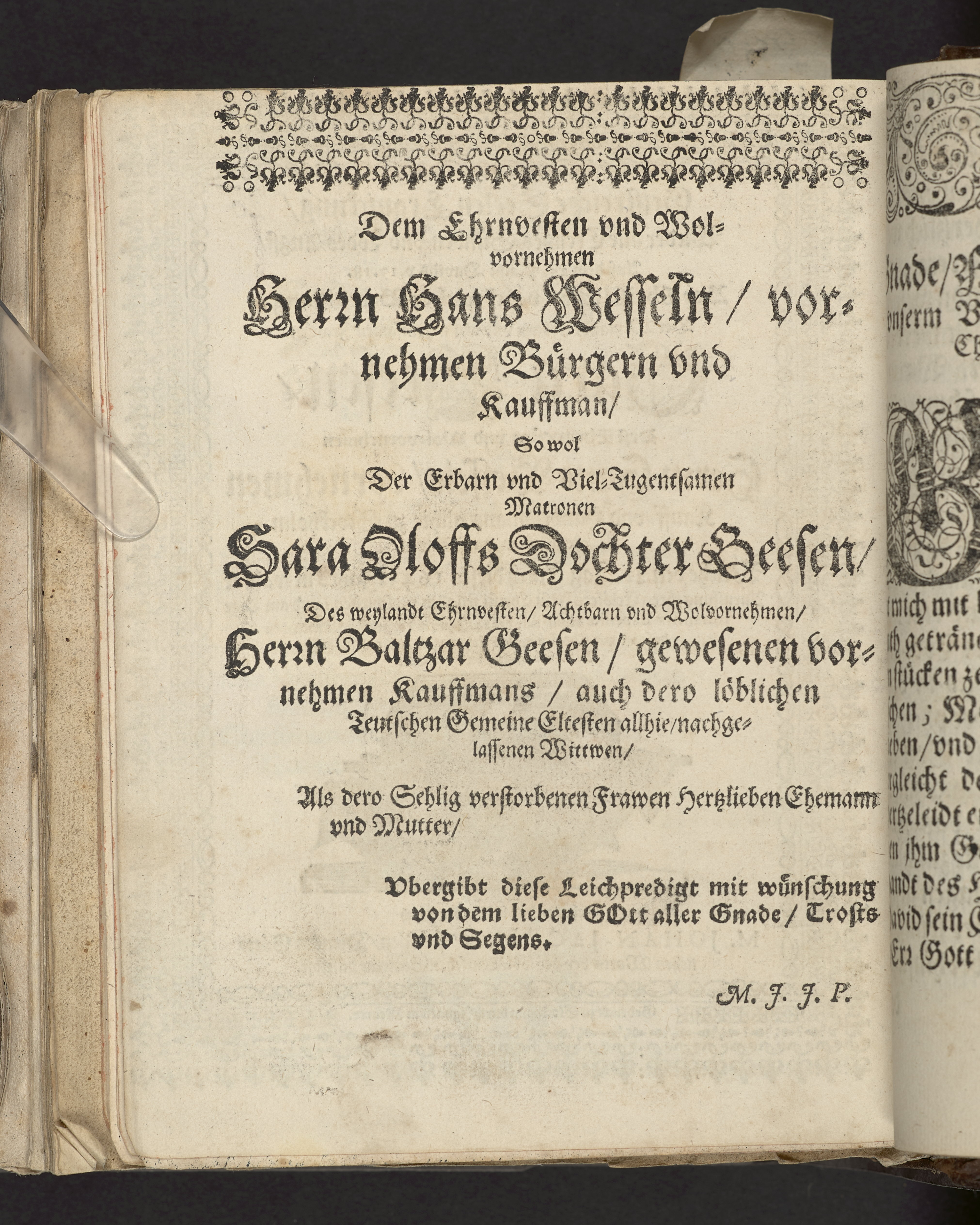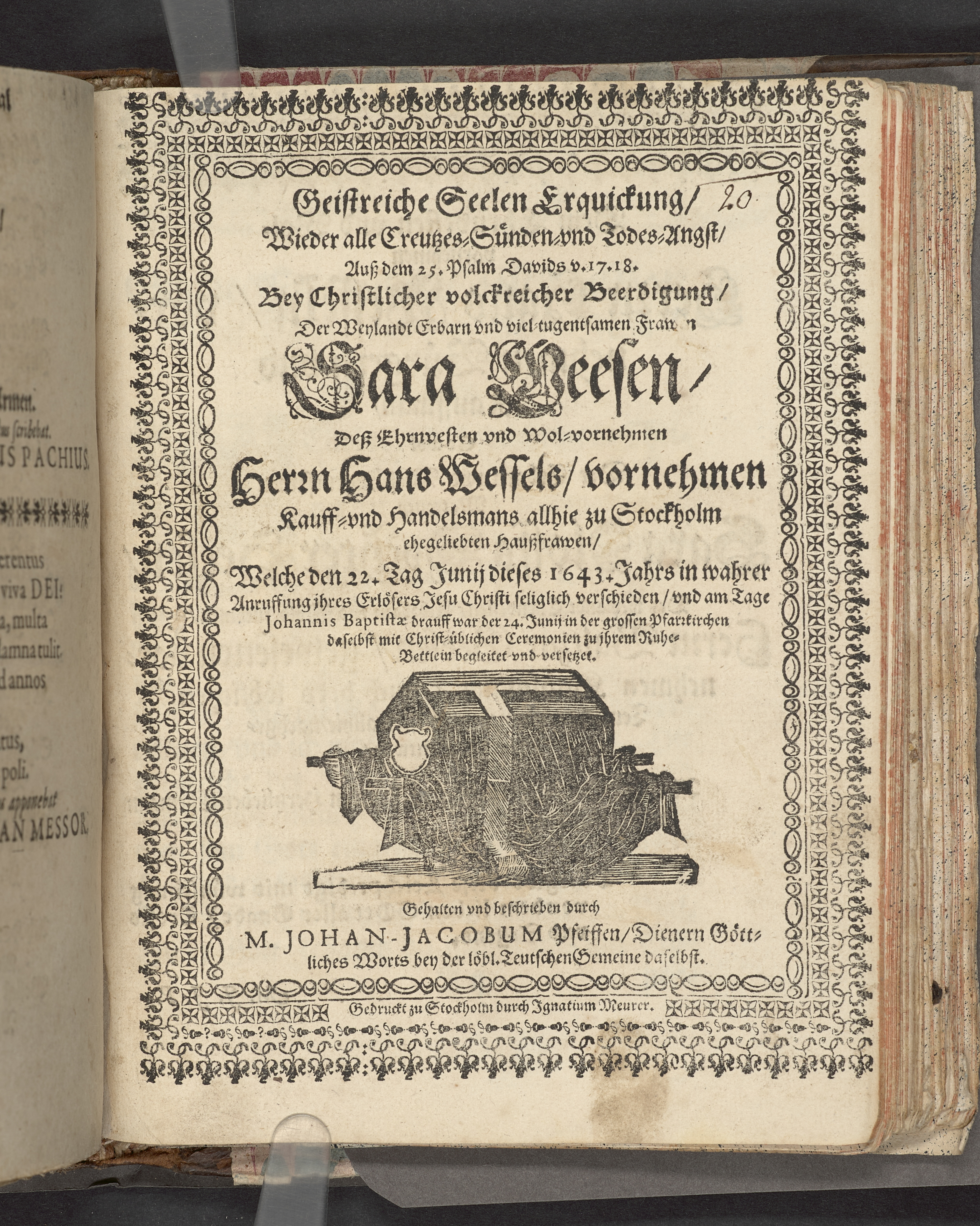 Geistreiche Seelen Erquickung/ Wieder alle Creutzes- Sünden-und-Todes-Angst/ Aus dem 25. Psalm Davids v. 17.18. Bey Christlicher volckreicher Beerdeingung/ Der weylandt erbarn vnd viel-tugendsamen Fraw Sara Weesen/ des ehrnvesten vnd wol-vornehmen Kauff- vnd Handelsmans allhie zu Stockholm ehegeliebten Hauszfrawen/ Welche den 22. Tag Junij dieses 1643. Jahrs in wahrer Anruffung ihres Erlösers Jesu Christi seliglich verschieden/ vnd am Tage Johannis Baptistae drauff war der 24. Junij un der grossen Pfarzkirchen daselbst mit Christ-üblichen Ceremonien zu ihrem Ruhe-Bettlein begleitet vnd versetzet. Gehalten vnd beschrieben durch M. Johan Jacobum Pfeiffen/ Dienern göttliches Worts bey der löbl. Teutschen Gemeine daselbst. Gedruckt zu Stockholm durch Ignatium Meurer.