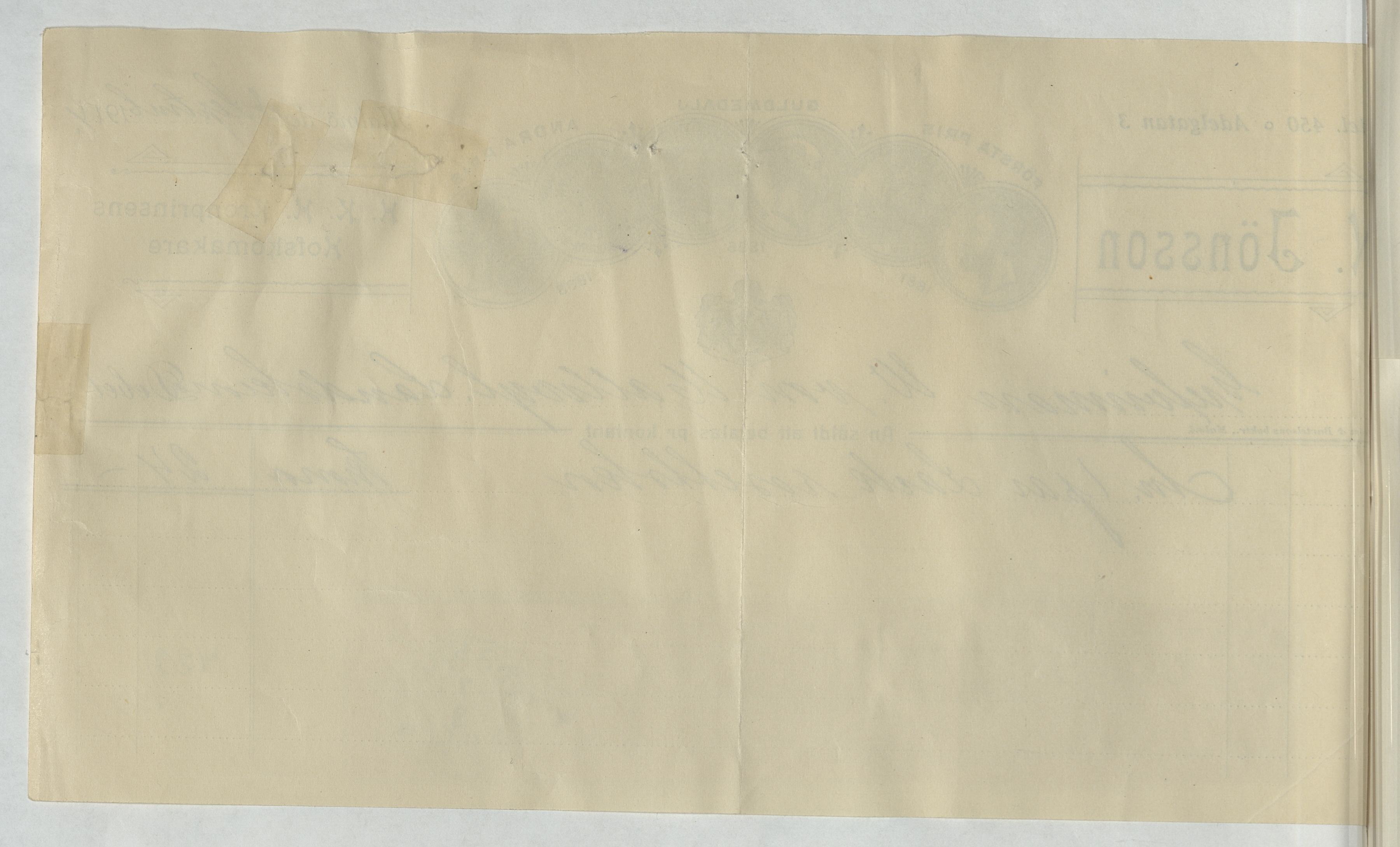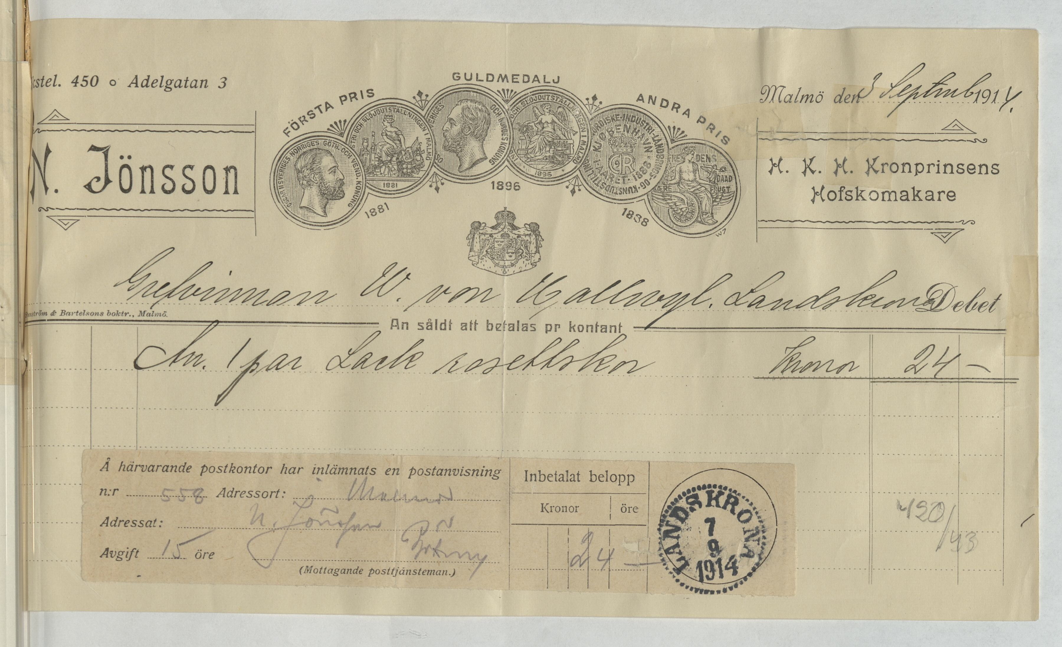 Kvitto från N. Jönsson, Skoetablissement. Gällande inköp av ett par lack rosettskor. Malmö, 1914.