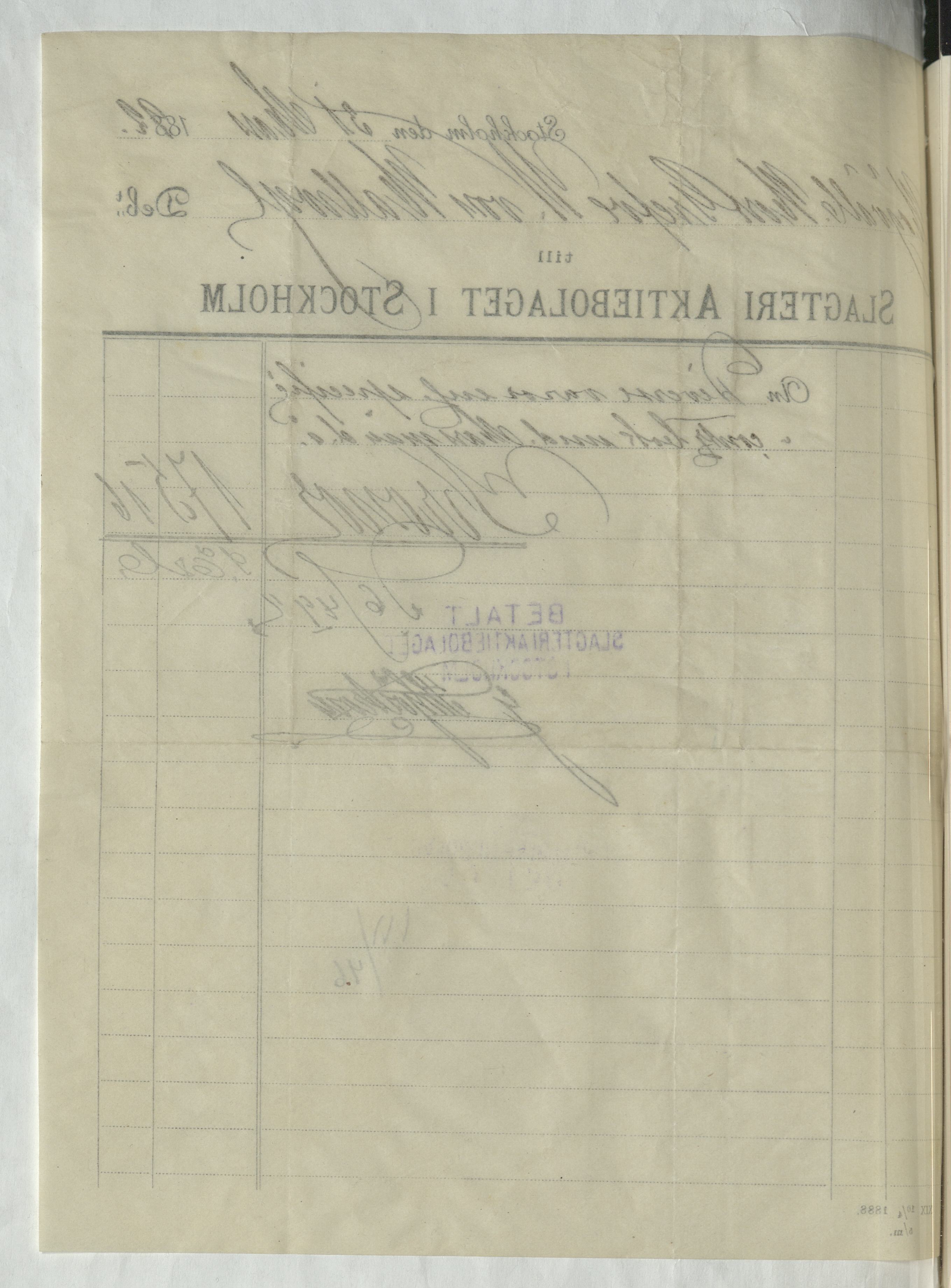 Kvitto från Slagteri Aktiebolaget i Stockholm