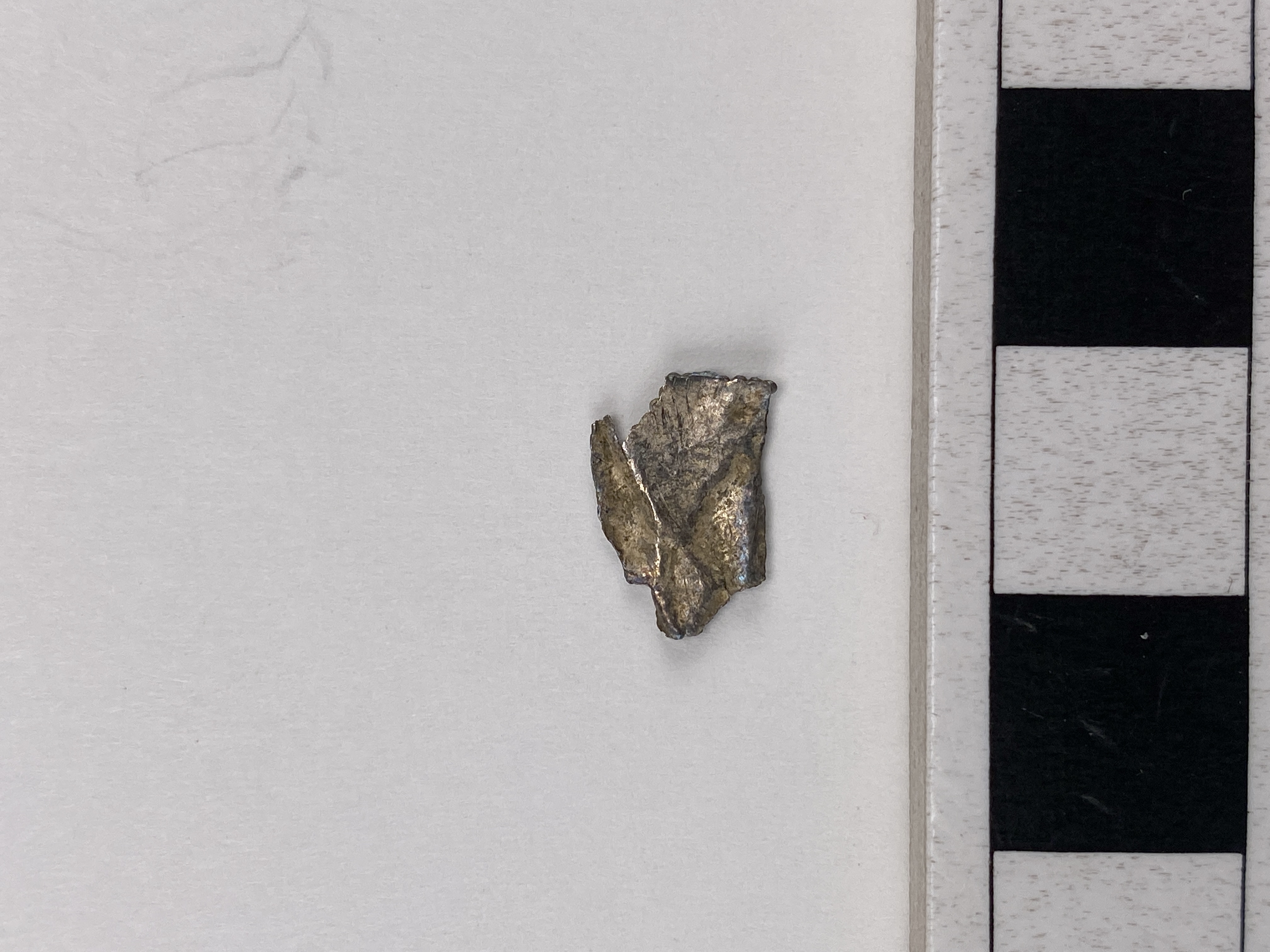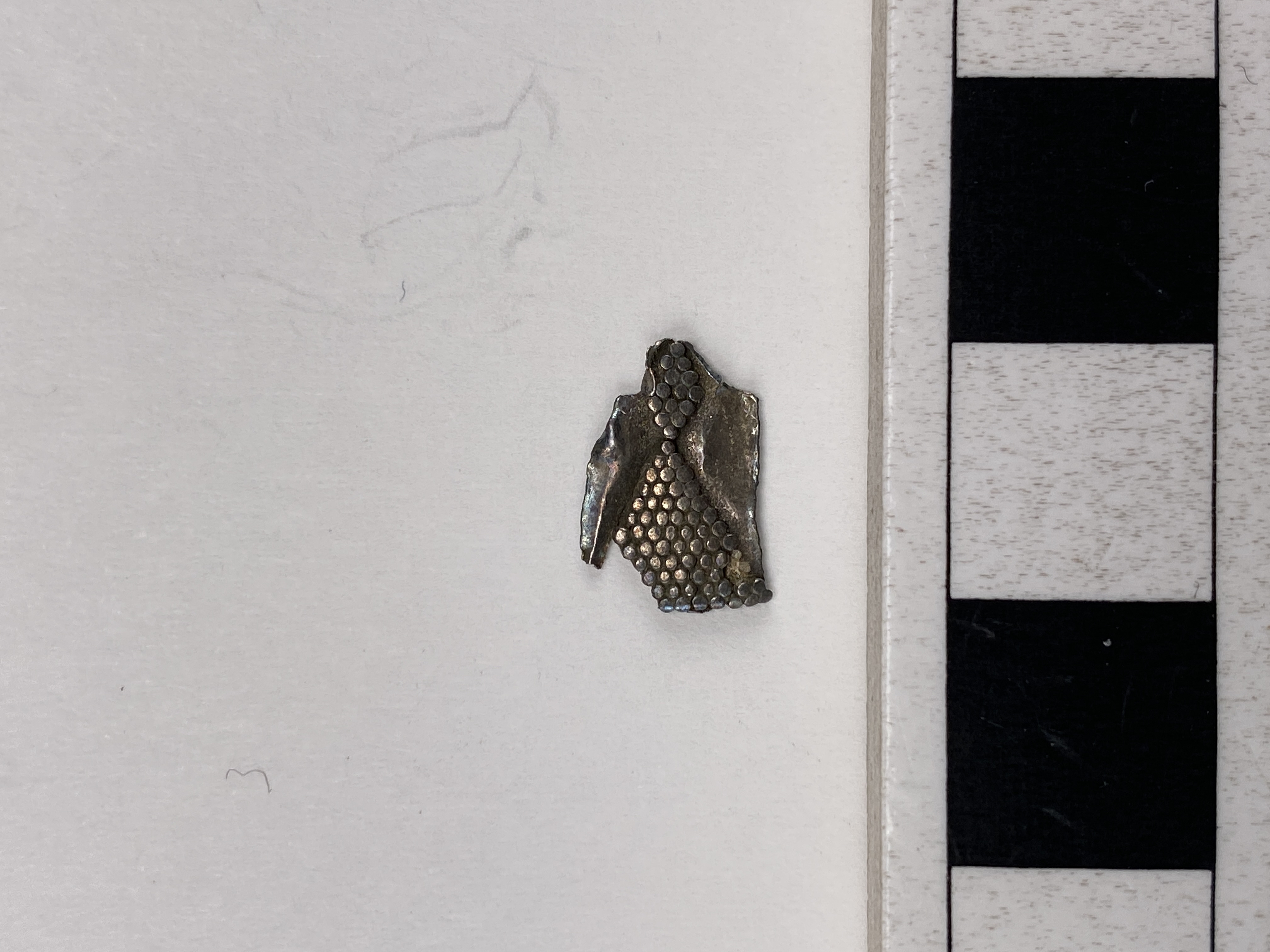 Tunn silverplåt med granulerat mönster. Registrerat som "pärla" i rapporten.