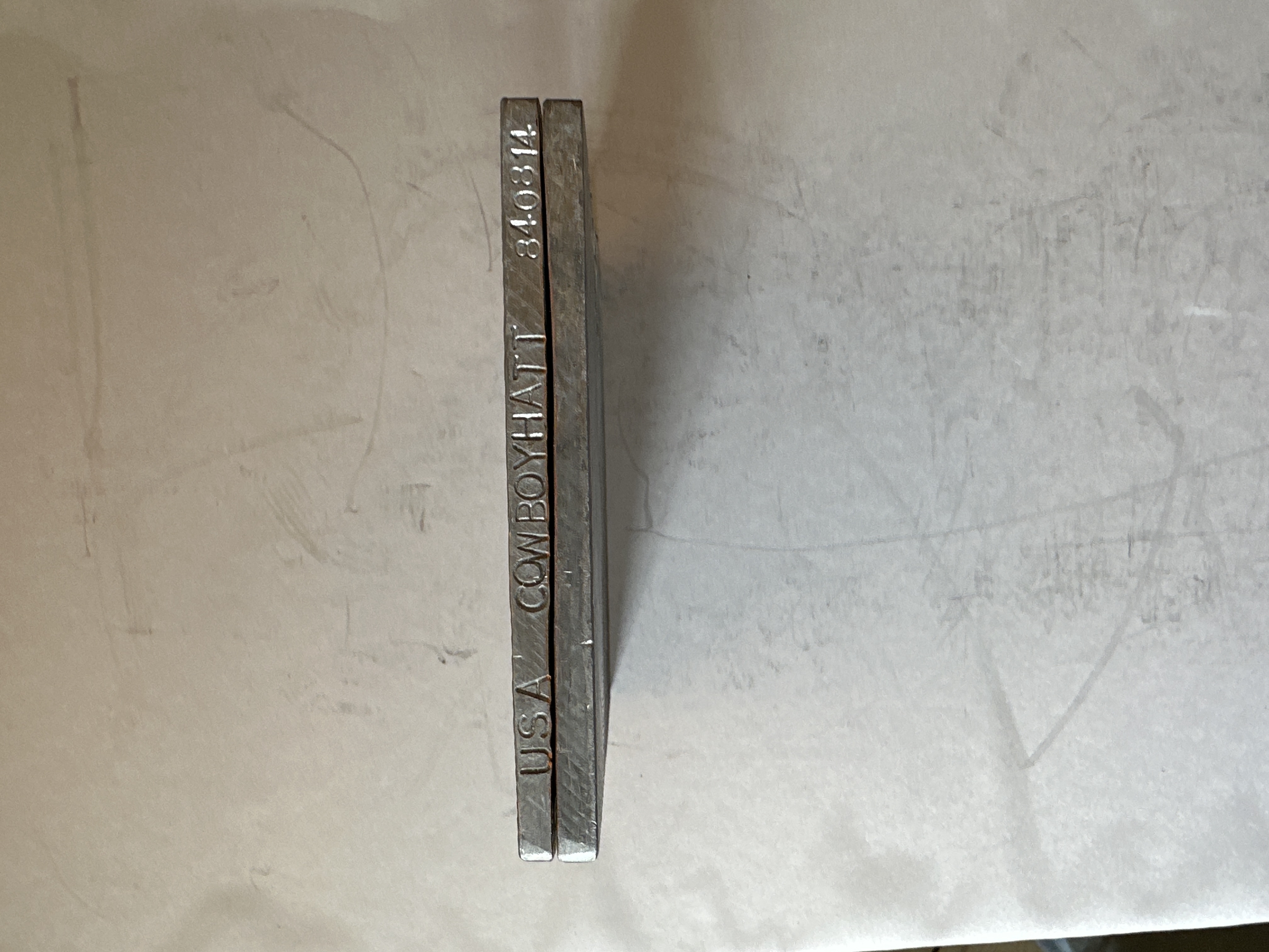 Pressplatta för vattenmärkestillverkning: "Cowboy med hatt". 2 stycken. Text på framsidan av plattorna: B.69. Text på sidan: USA COWBOYHATT 840814.