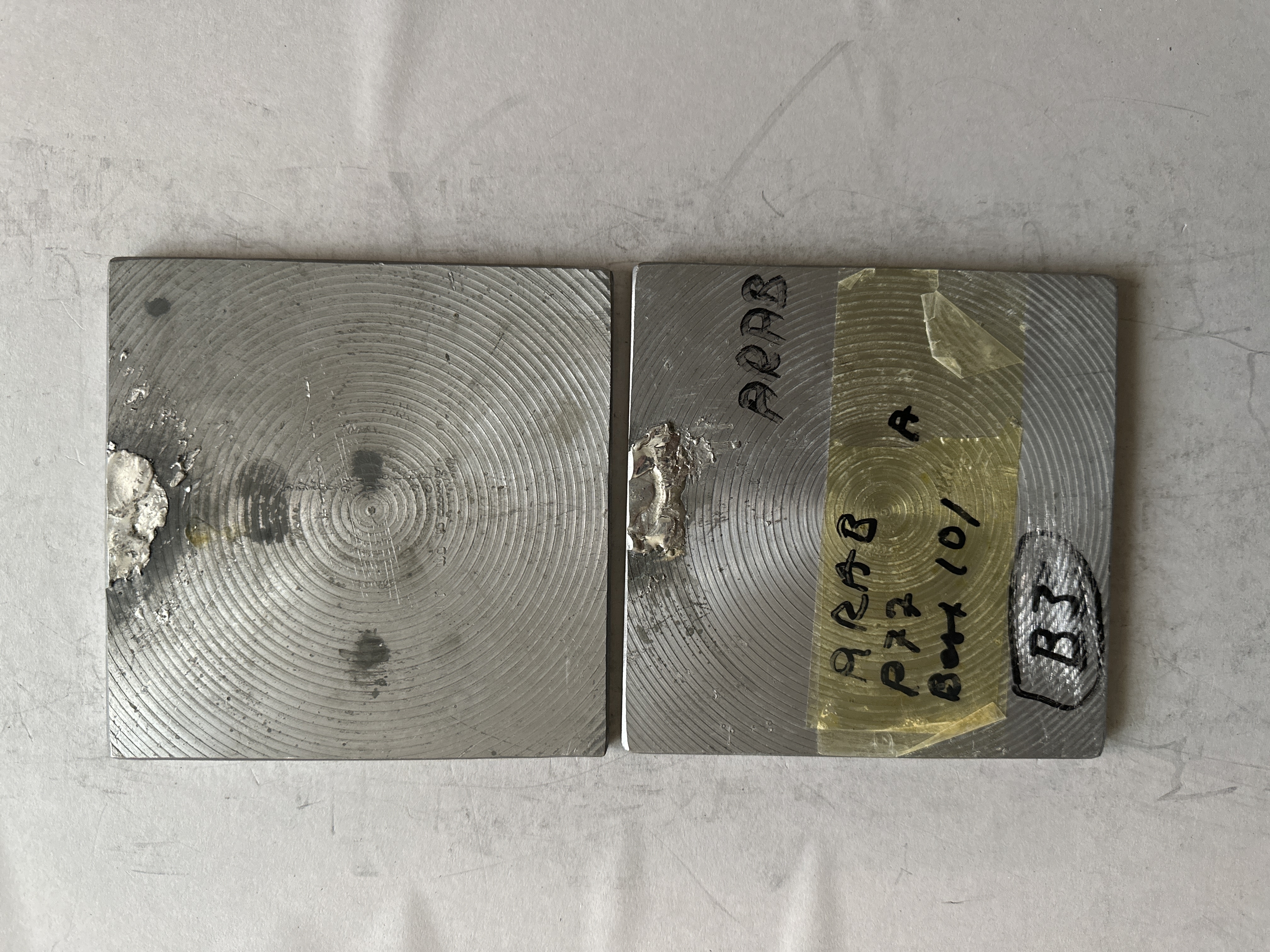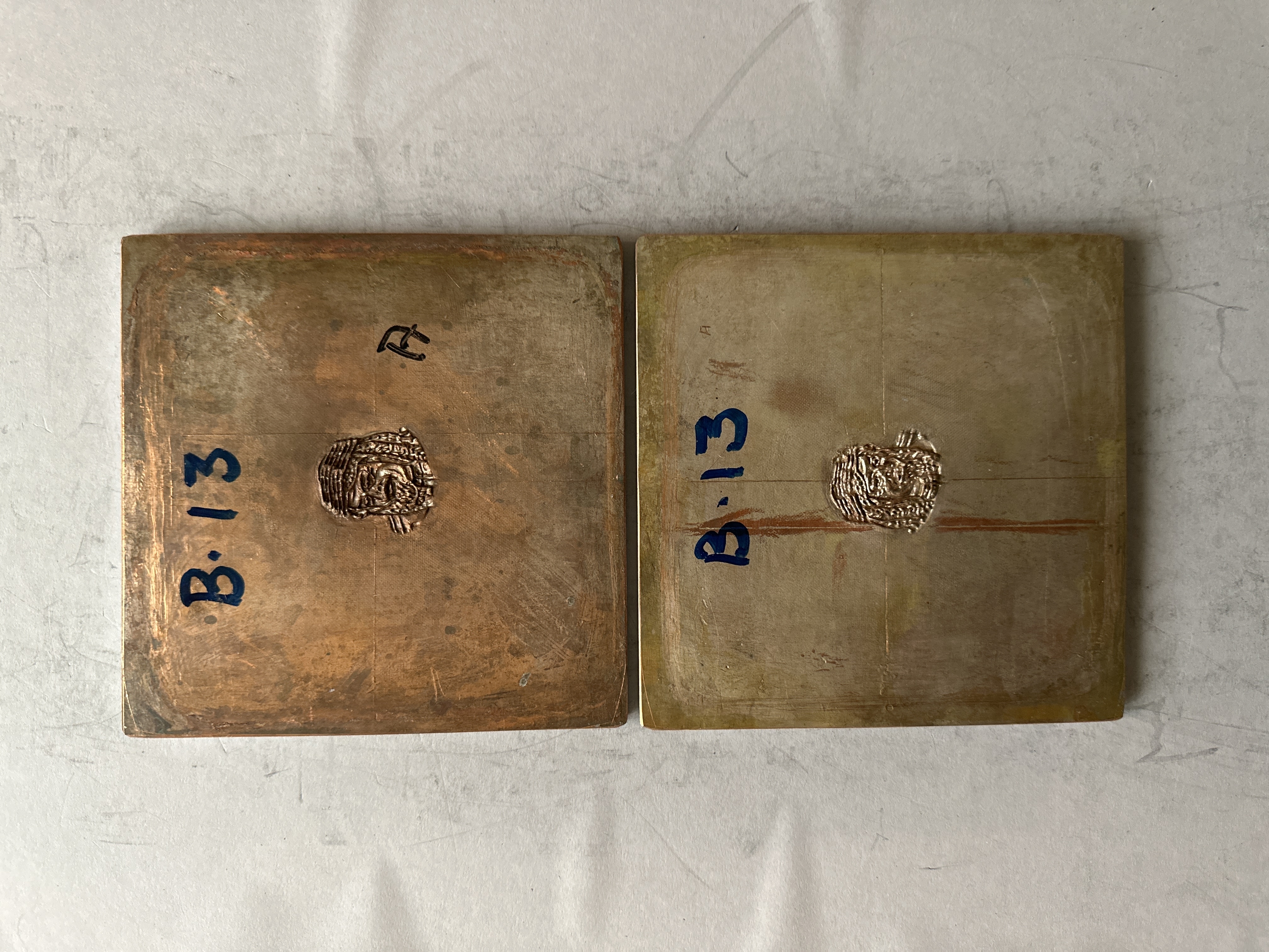 Pressplattor för vattenmärkestillverkning. Två kvadratiska plattor, matris och patris, tillverkad i koppar och bly. Plattorna med motiv föreställande mansporträtt. Text på framsidan av båda plattorna: "B. 13". Patrisen även med påskriften: "A". Text på baksidan av matrisen: "ARAB B3". Matrisens baksida även med gul tejp märkt: "ARAB P77 A Best 101".