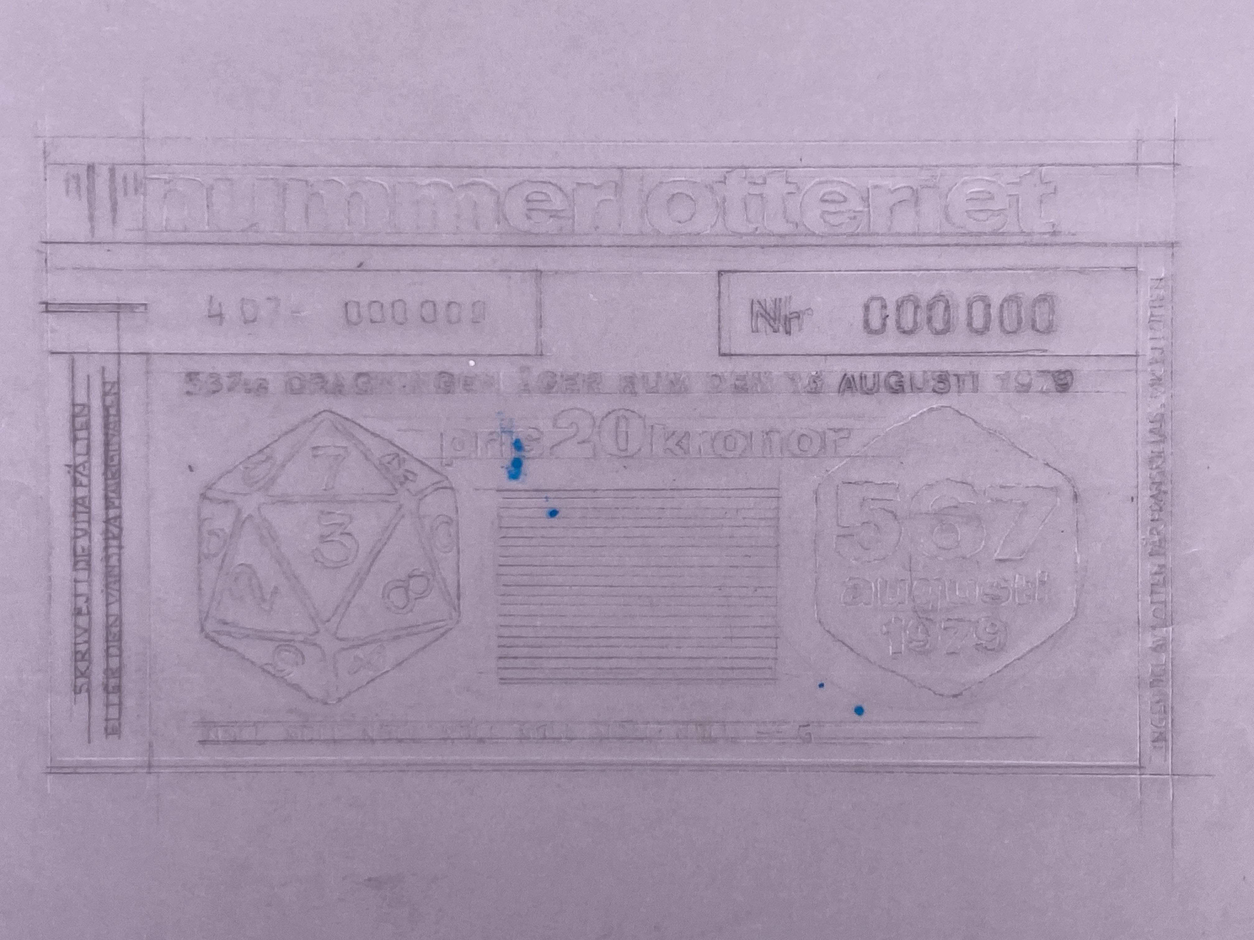 Tryck på vaxpapper ifyllt med grafitpenna. Designförslag på lott med dragningsdatum den 15 augusti 1979, 567:e dragning. Jfr. med design 3145326.