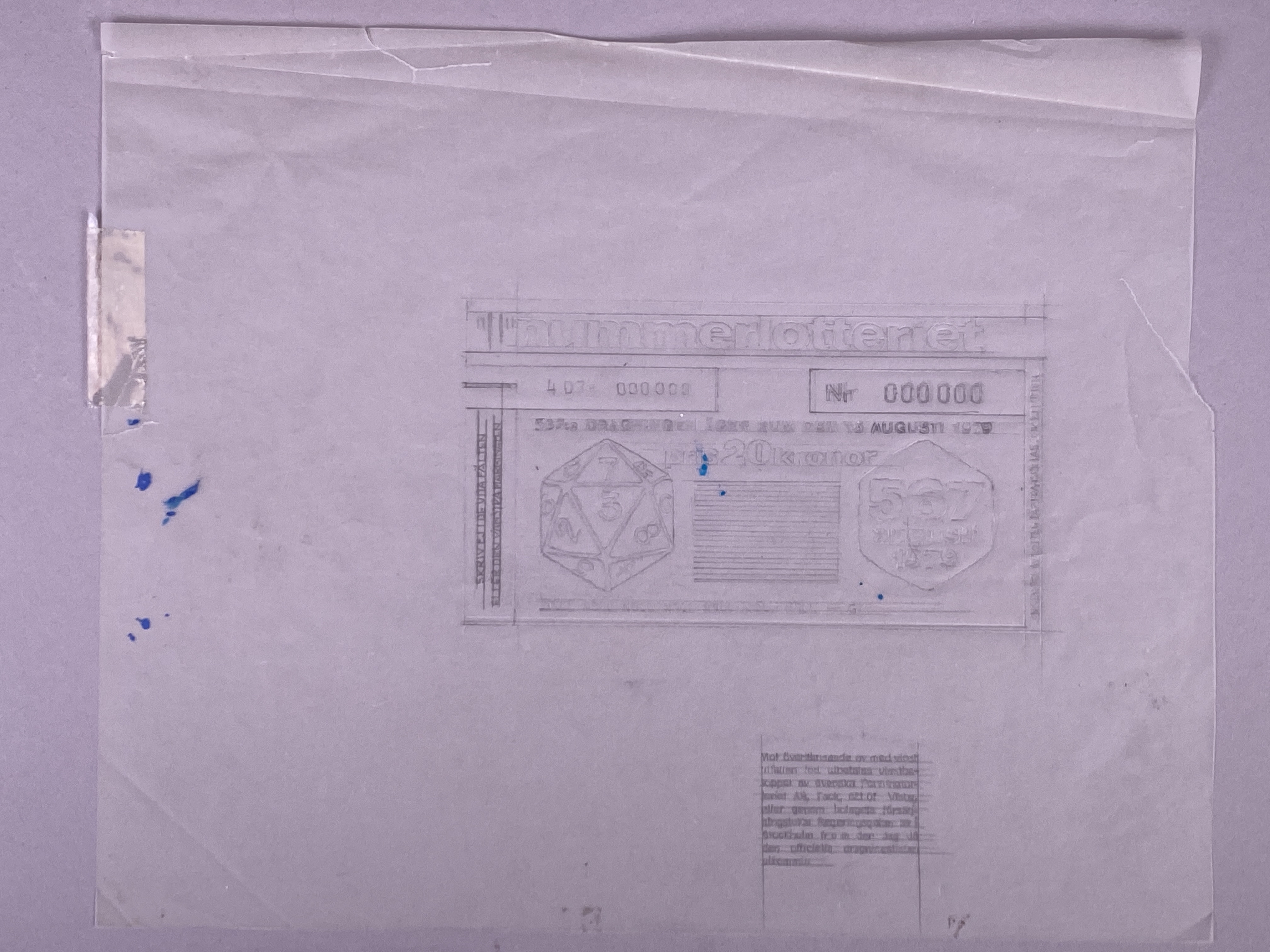 Exemplaret tillhör en grupp om 20 lotter (skiss, lotter med ram, provtryck, förslag etc.) som låg i ett kuvert med texten "Nummerlotteriet 1970-1979". |