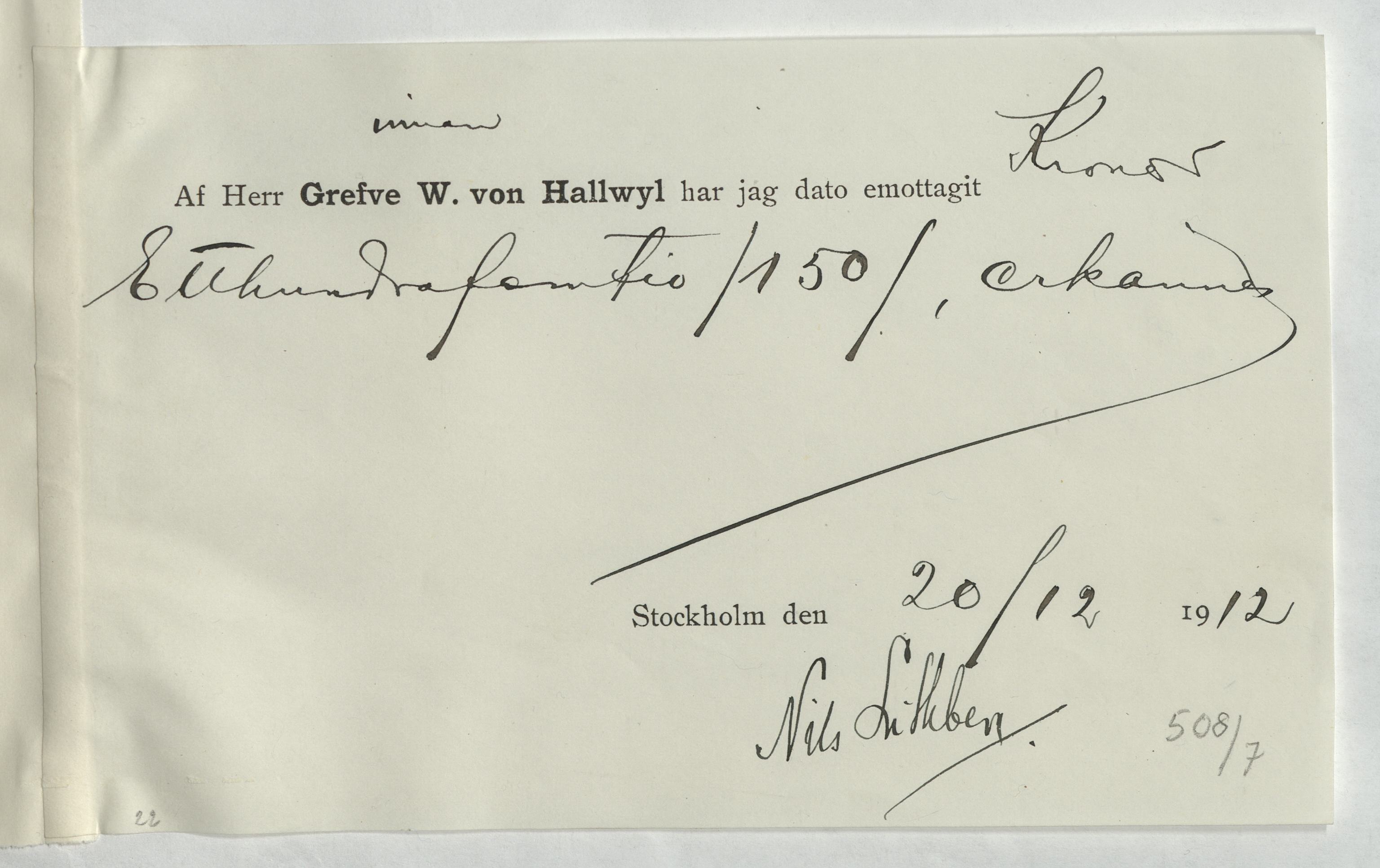Kvitto gällande pengatransaktion mellan Walther von Hallwyl och Nils Lithberg. Stockholm, 1912.